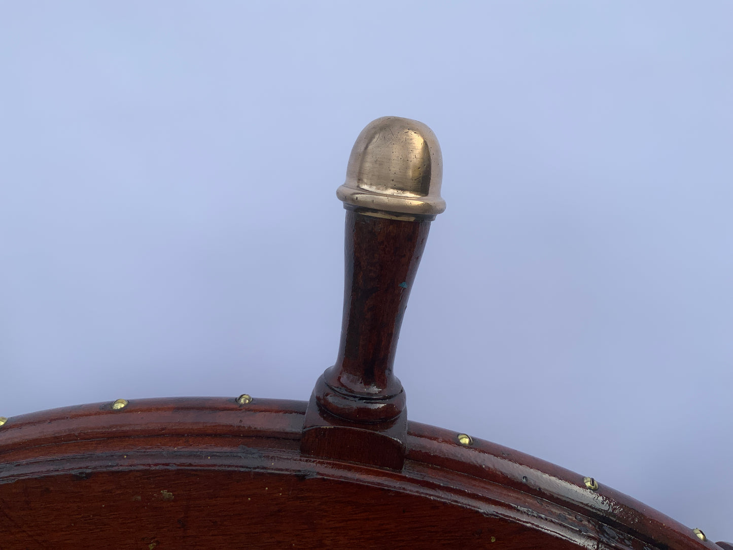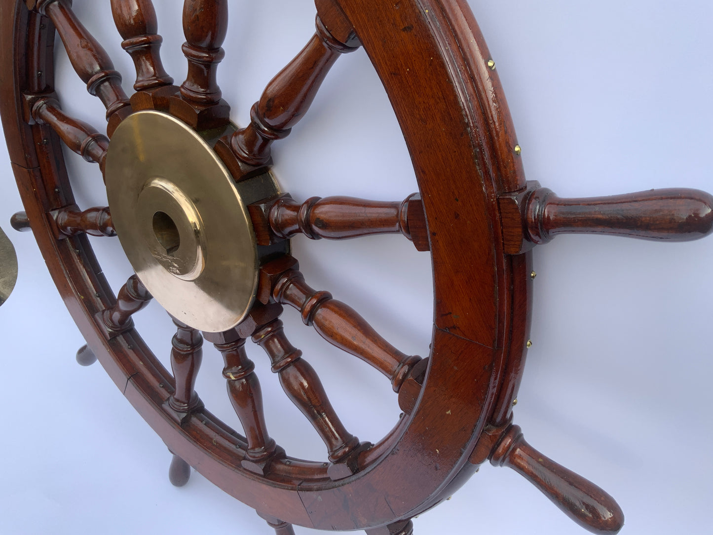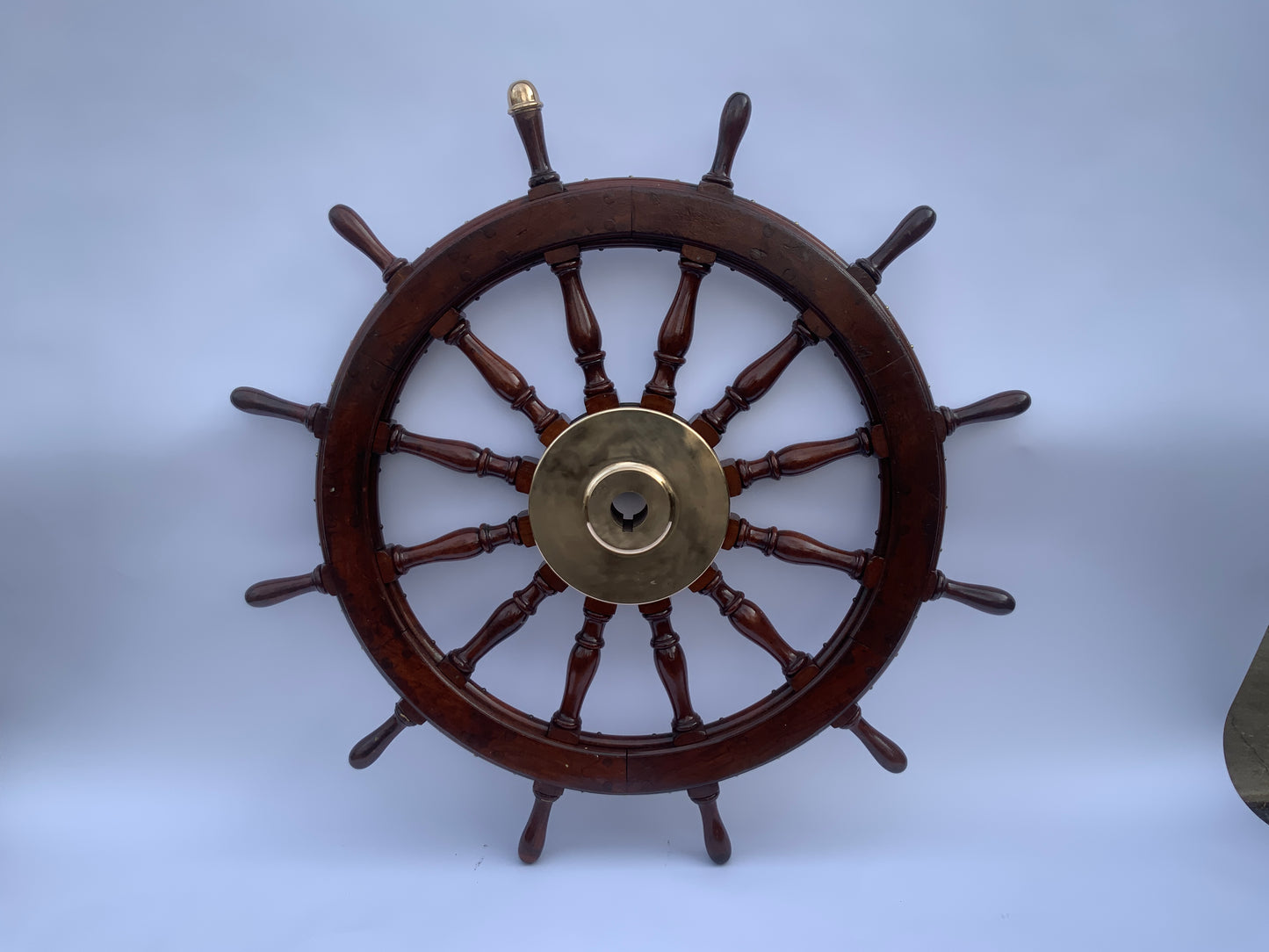 Antique five-foot ships wheel built to an exceptional standard of girth and strength. Massive brass hub with wide keyhole. Varnish finish on the hardwood wheel. Circa 1870. As heavy and impressive as they get.