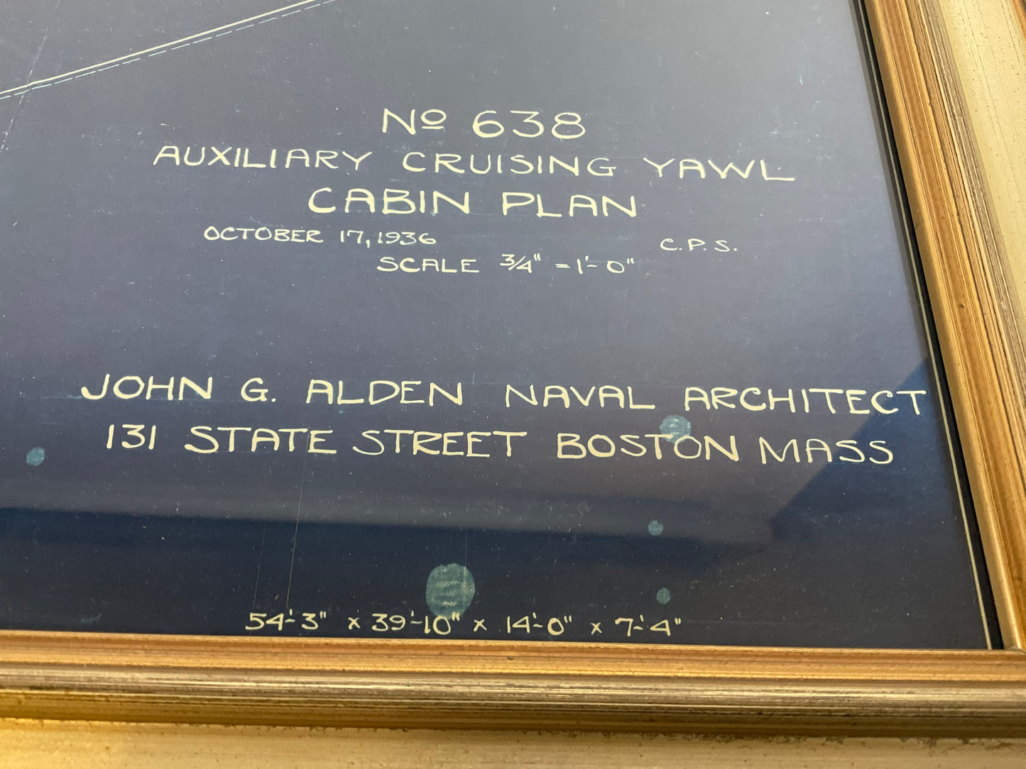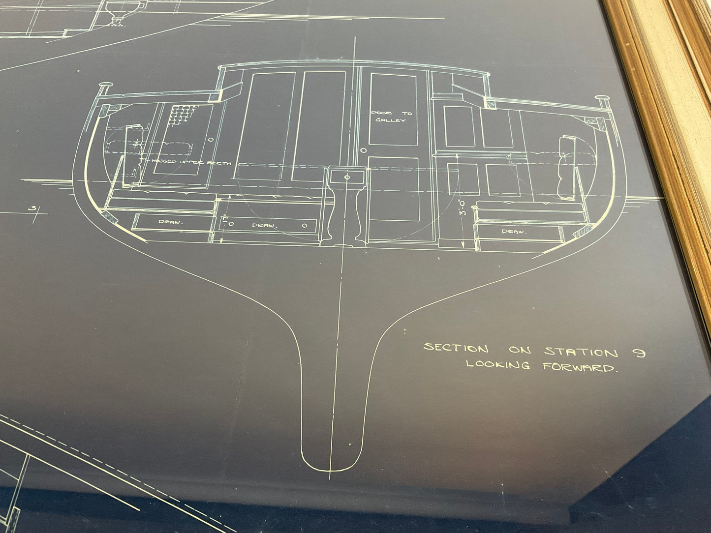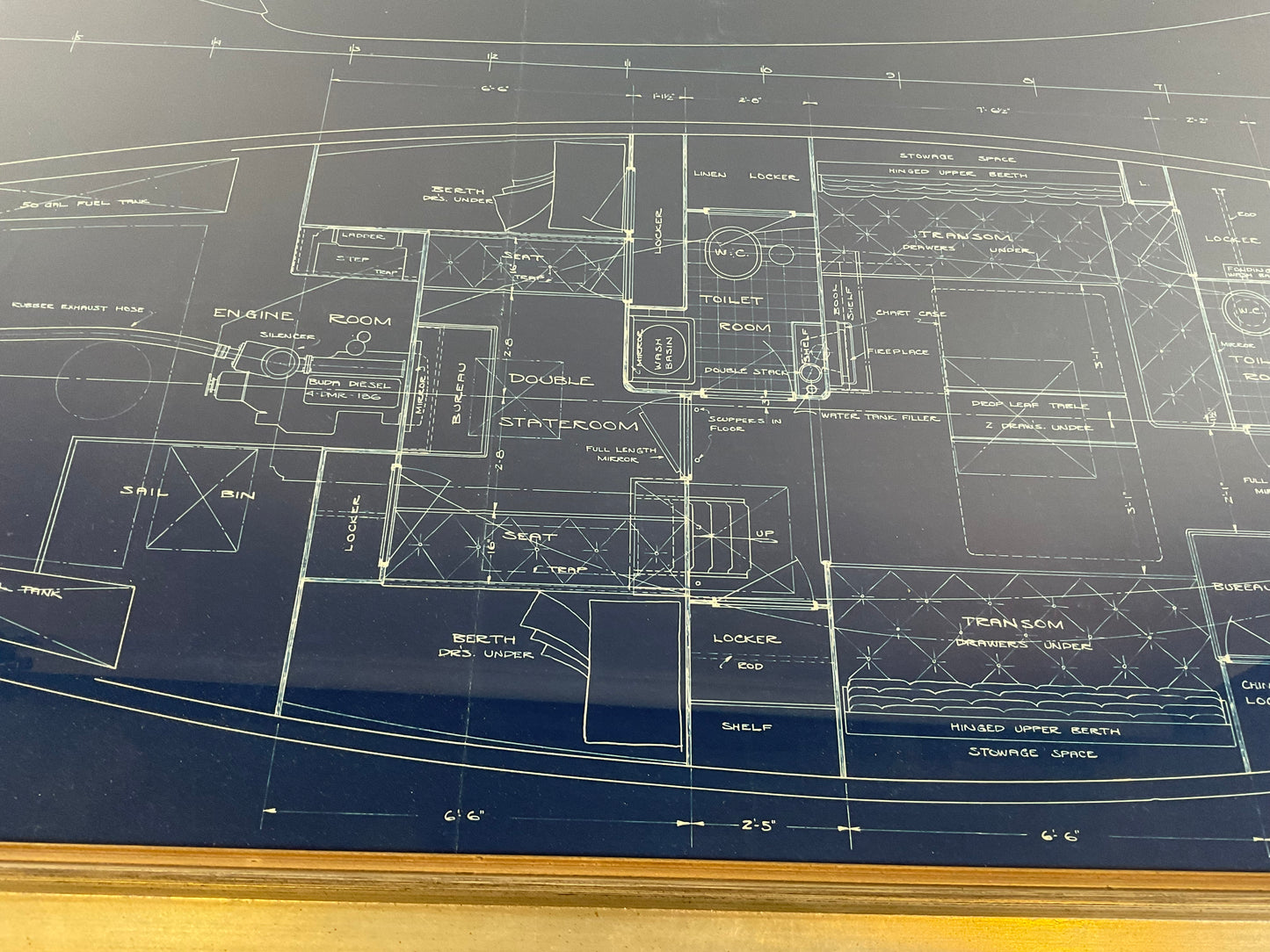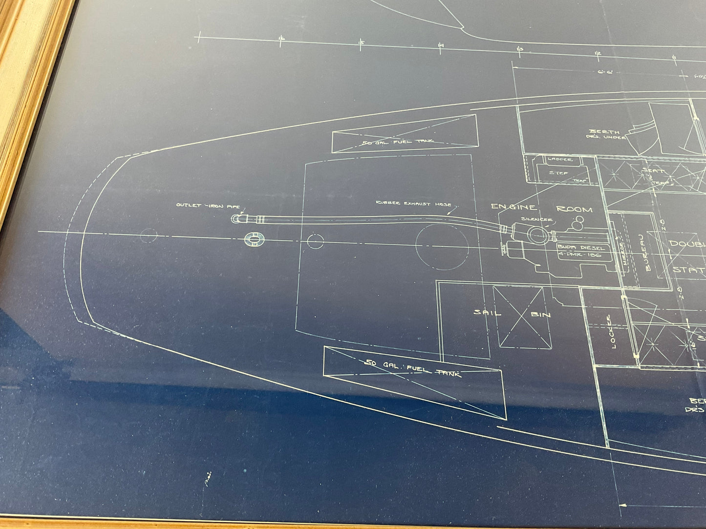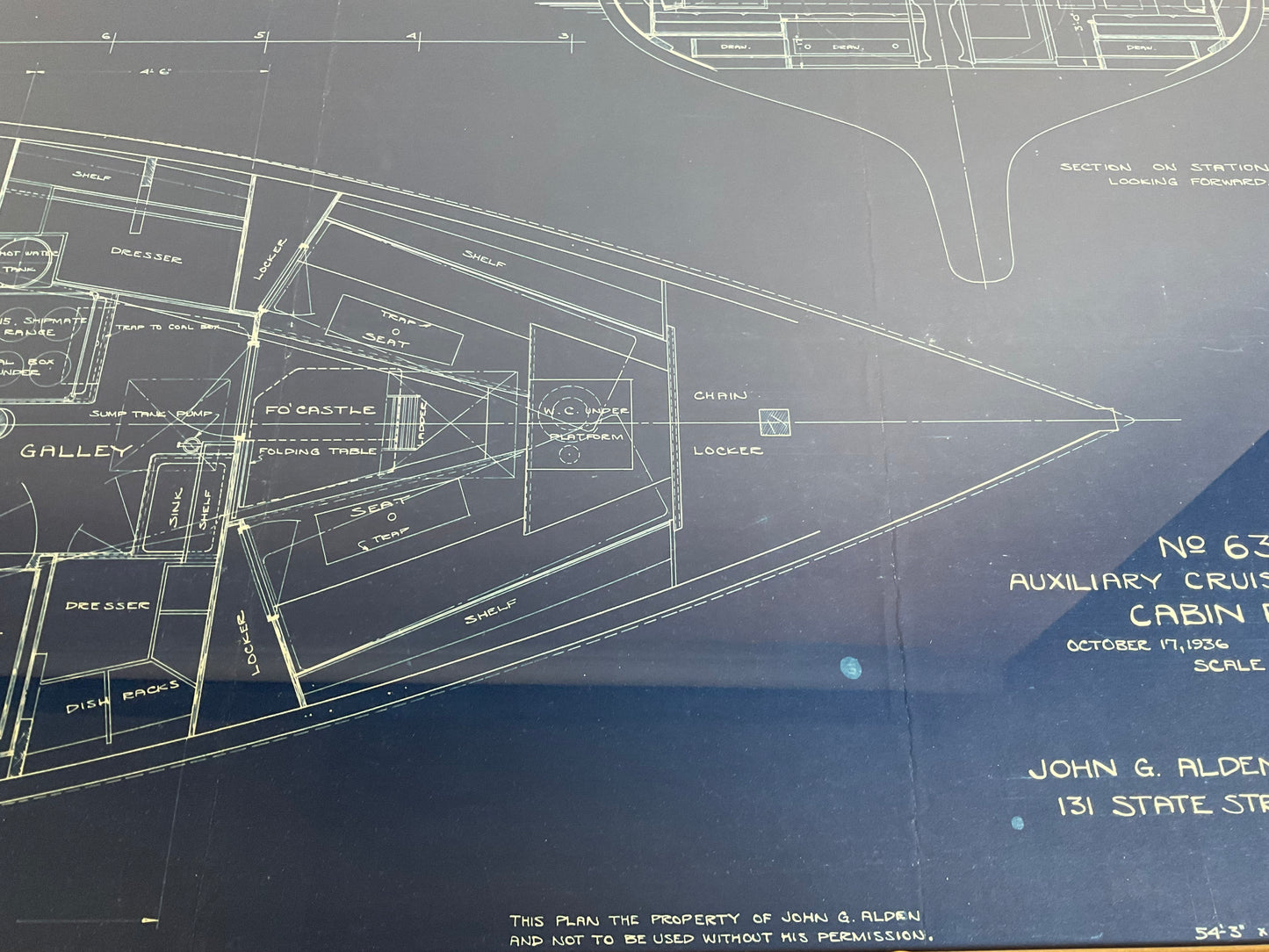 Original construction plan drawing from John G. Alden naval architect of the schooner yacht Evening Star, hull 638. Evening Star was the last yacht built under the eyes of Nathanael Herreshoff, the end of an era. This is a big, beautiful deck plan showing all cabin arrangements. Amazing detail with cabins, double stateroom, berths, head, lockers, chain locker, sail bins, chart case, cabinetry, etc. So much detail. Amazing relic.