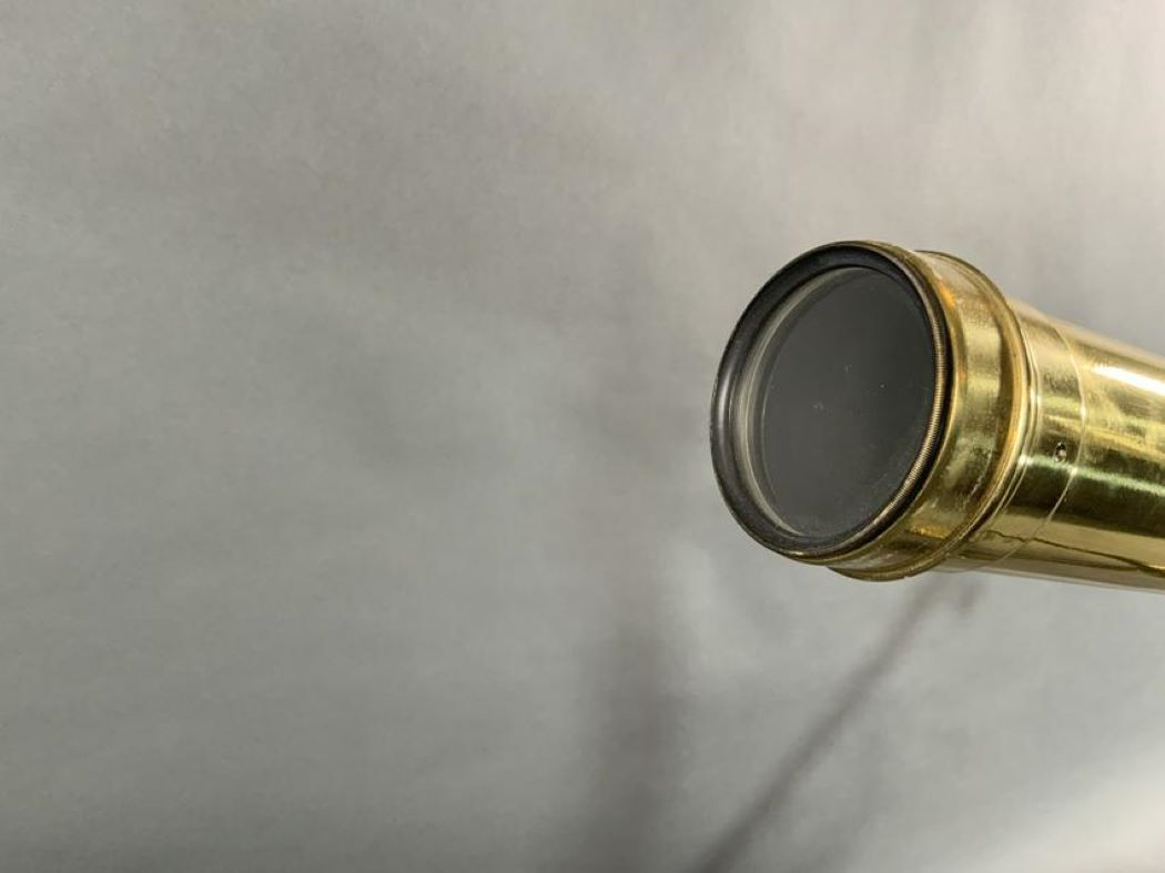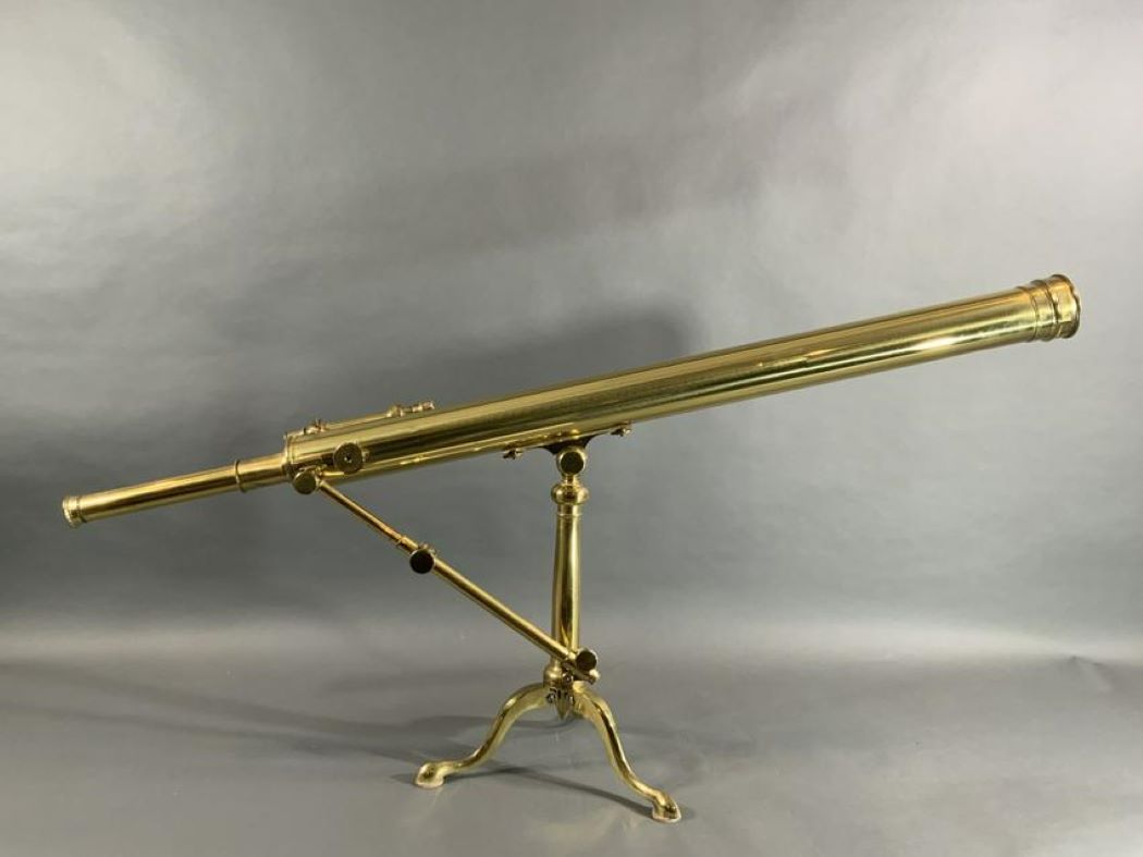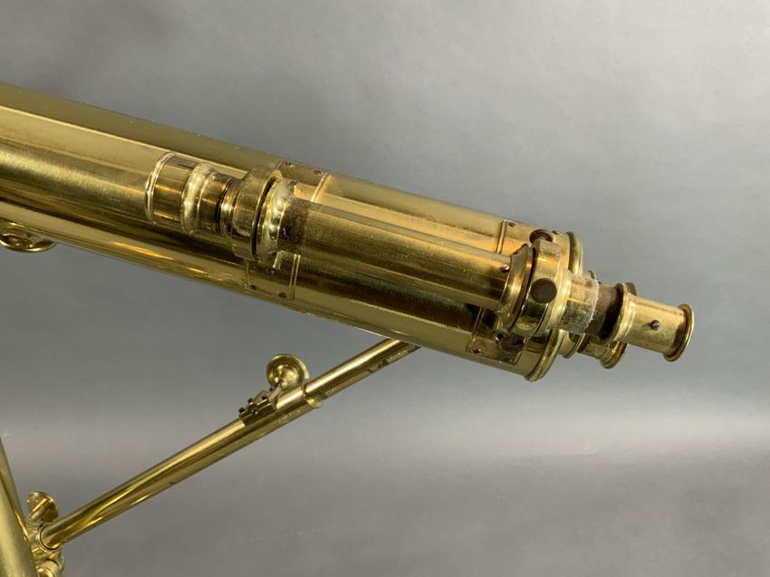 Nineteenth century scope with geared focal knob and heavy brass tripod stand. Weight is 24 pounds. 23" H x 55" L.