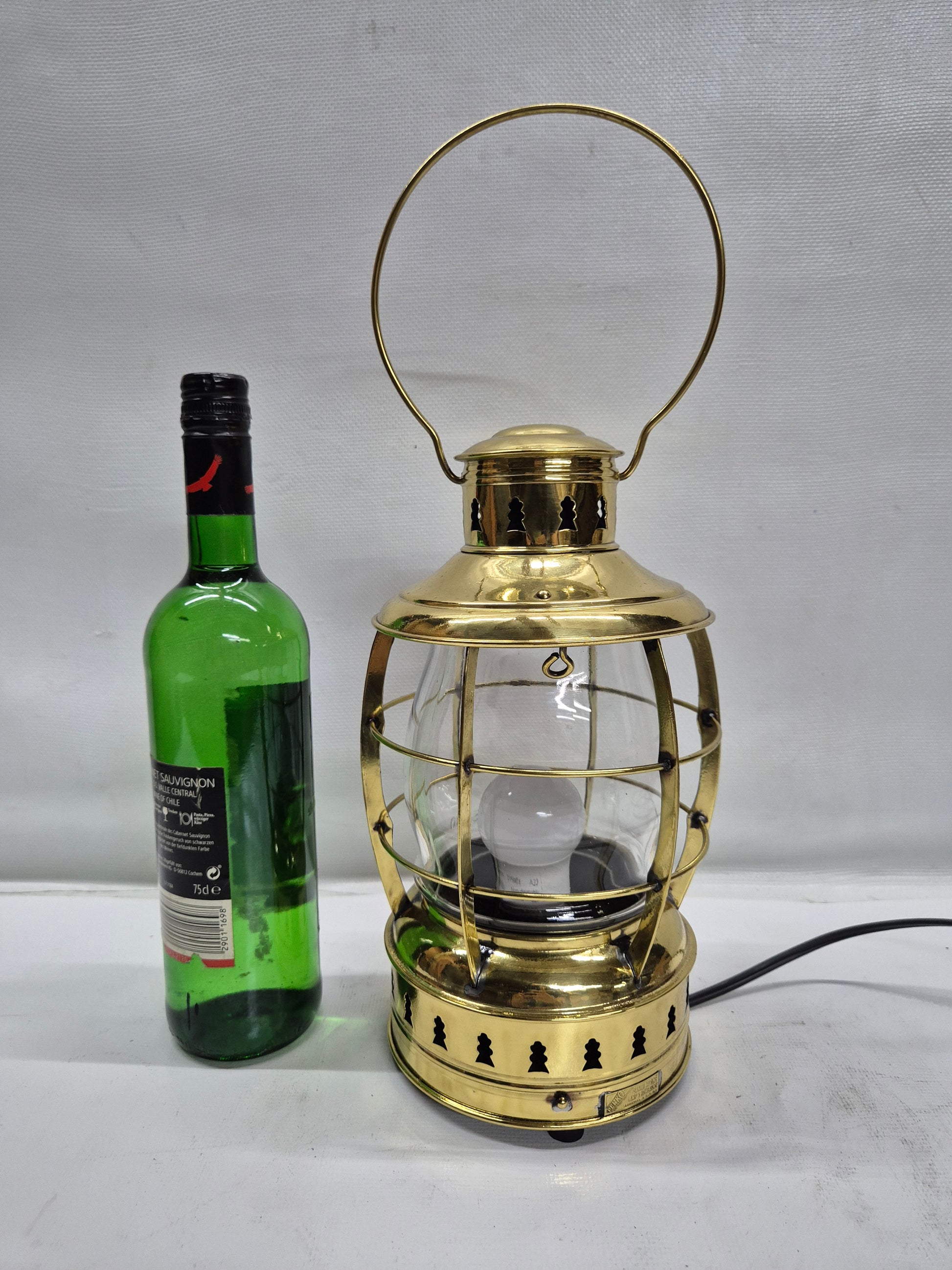 Highly polished and lacquered marine lantern by Perkins Marine Lamp and Hardware Corporation of Brooklyn, New York, U.S.A., as found on the attached maker’s badge. With clear glass globe, vented top, protective cage, and loop carry handle. Fitted with a new electric socket. 1925.