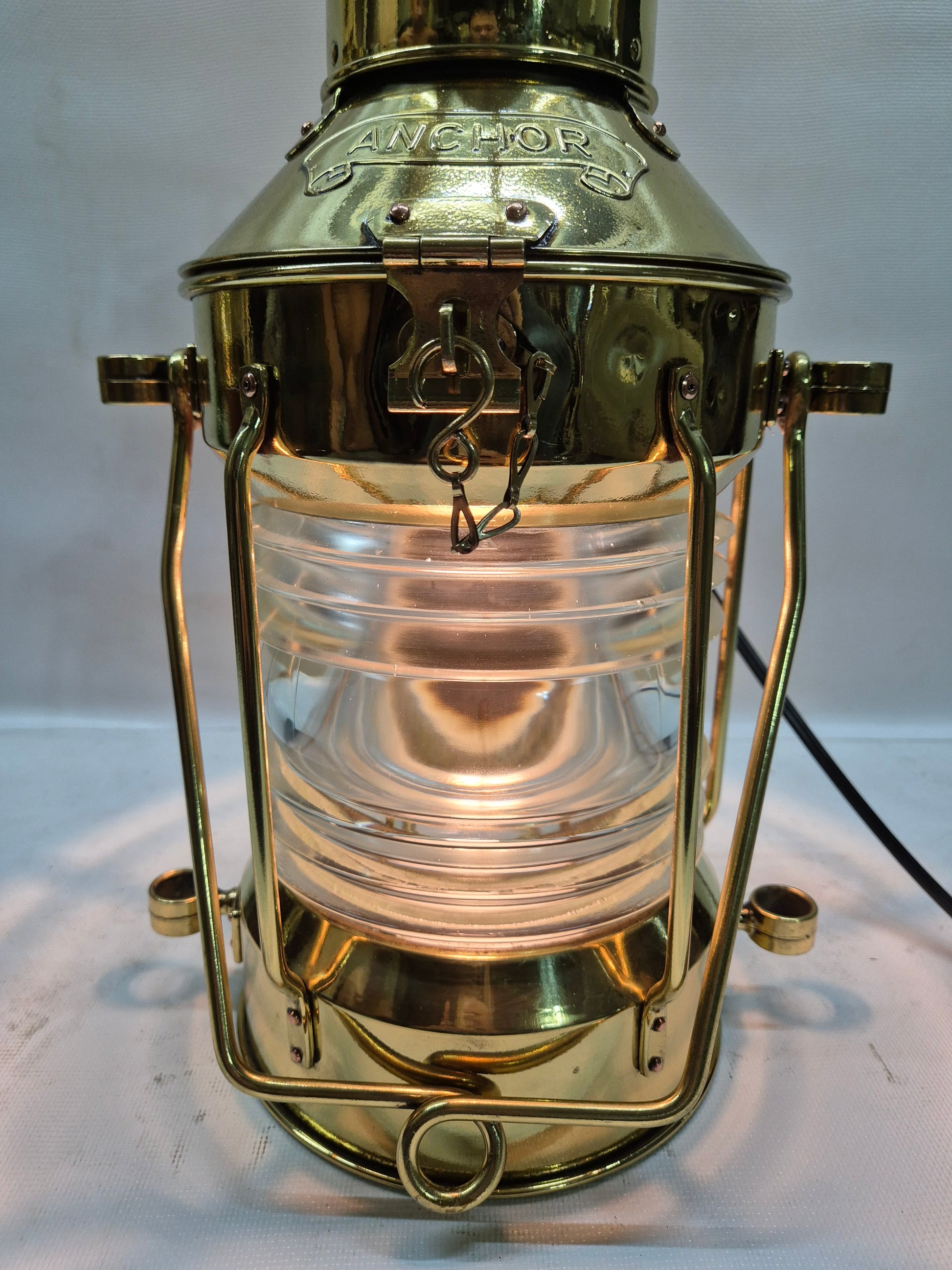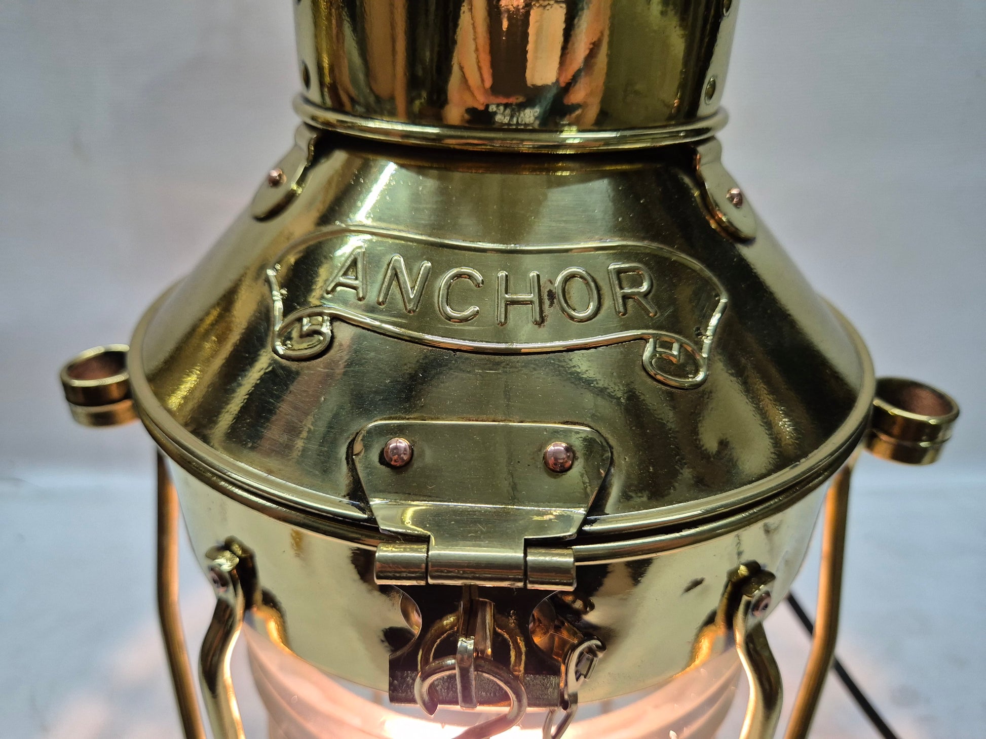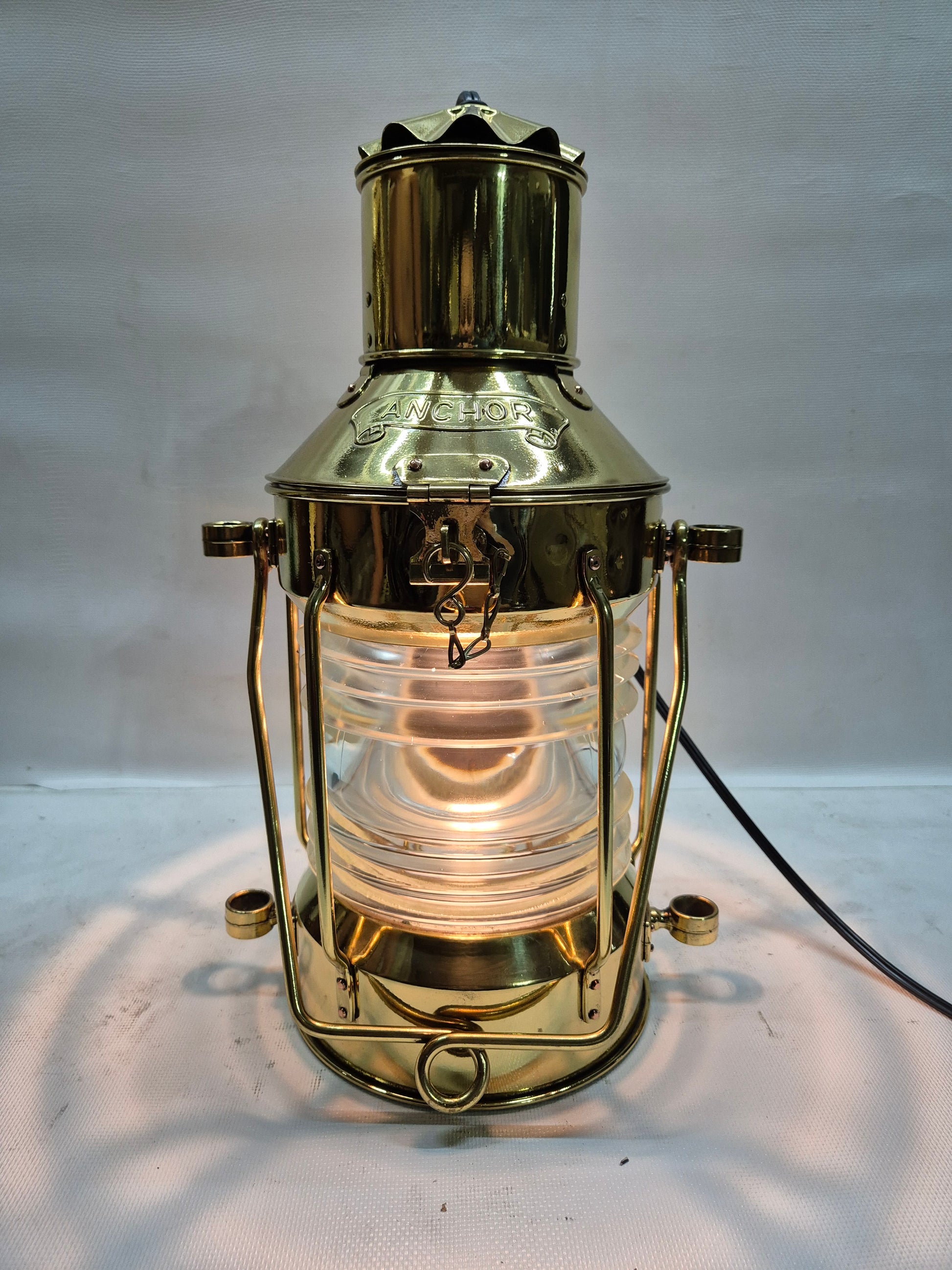 Brass ship's anchor lantern with polished and lacquered finish. Clear Fresnel glass lens, protective brass bars, affixed "Anchor" badge, hoisting handle, and vented top. Fitted with electric socket.