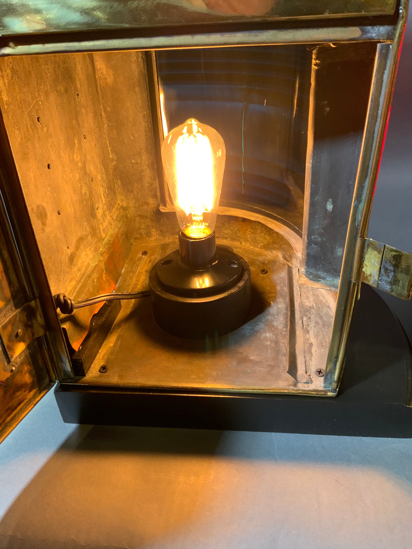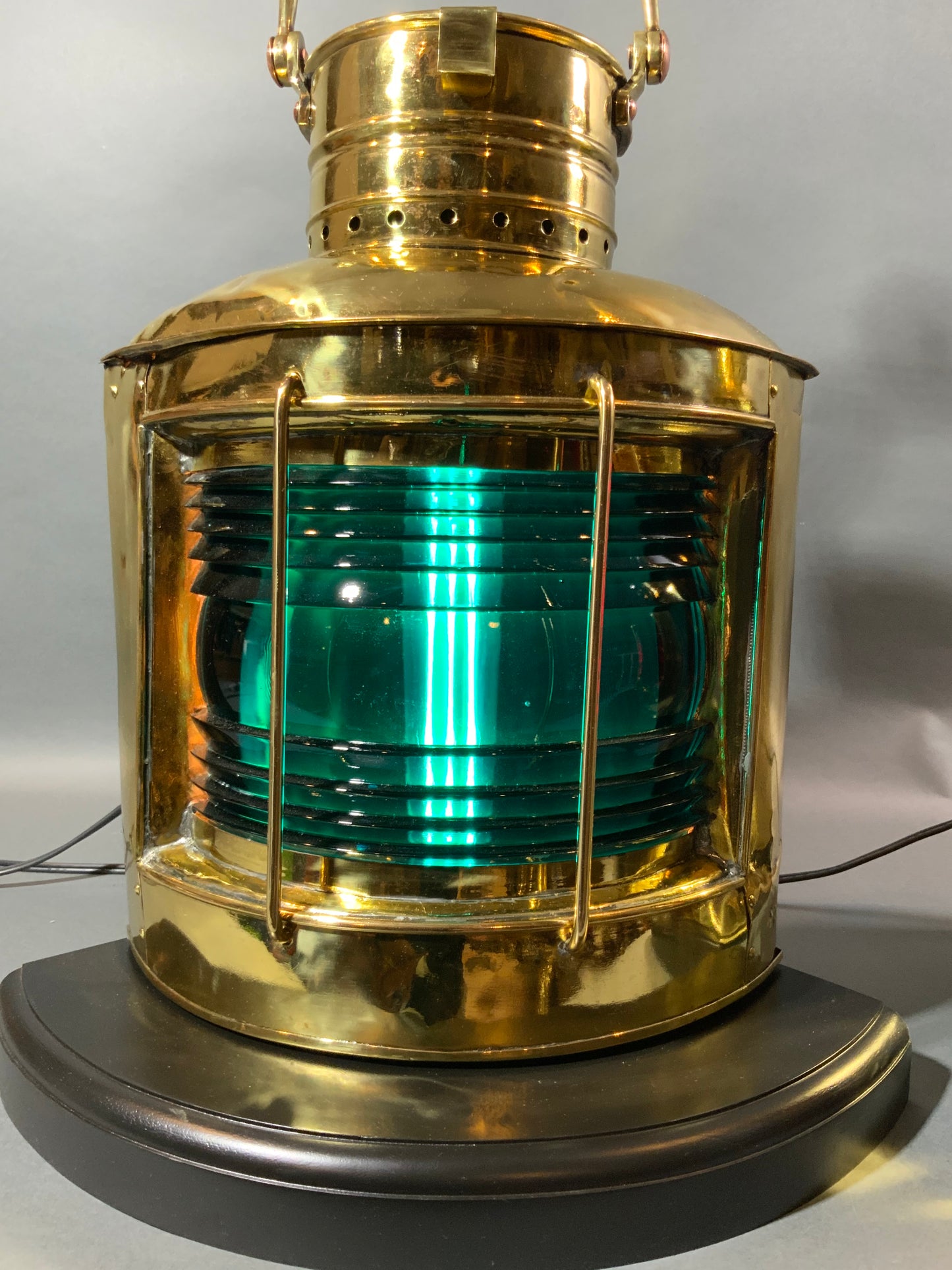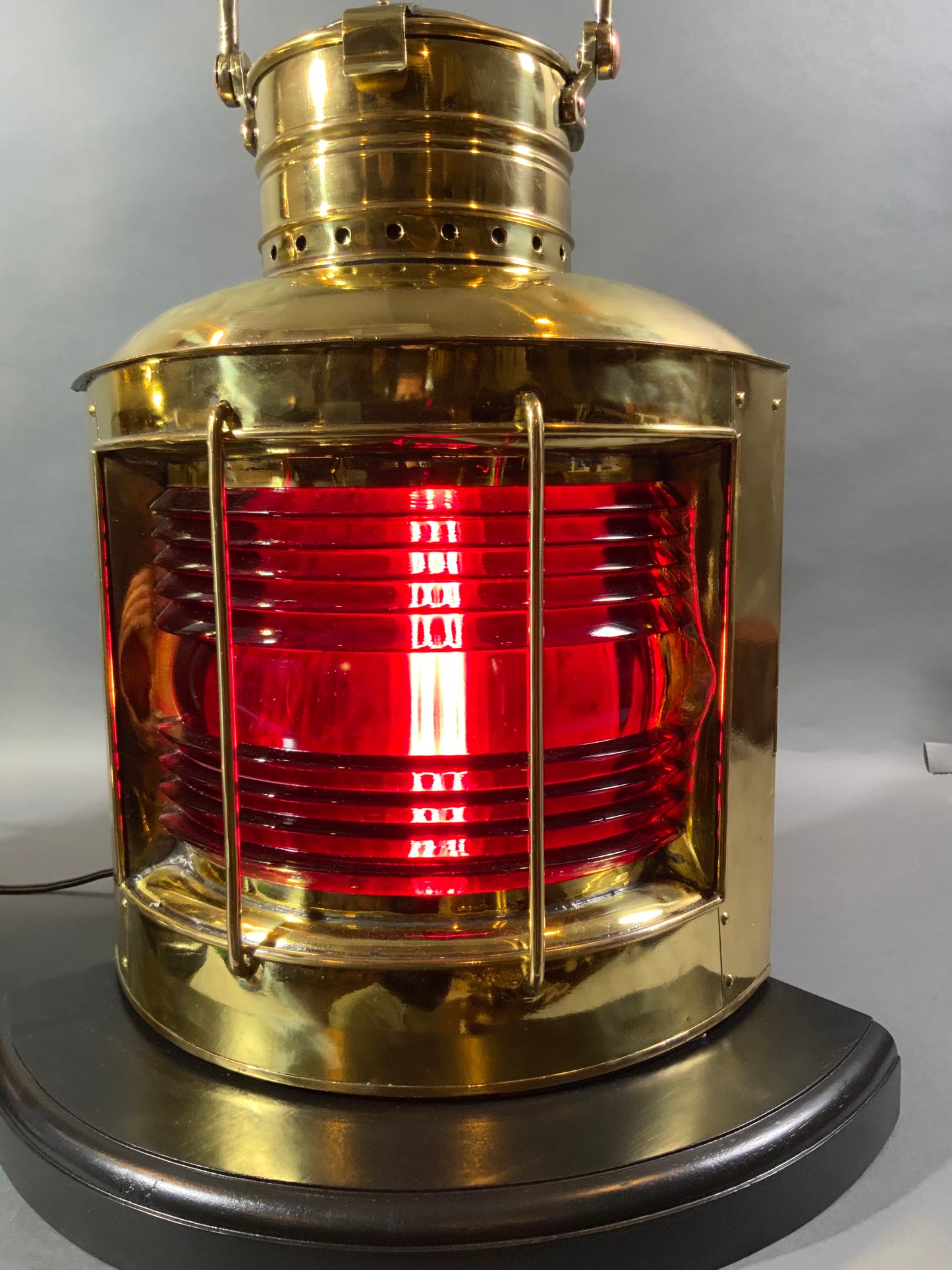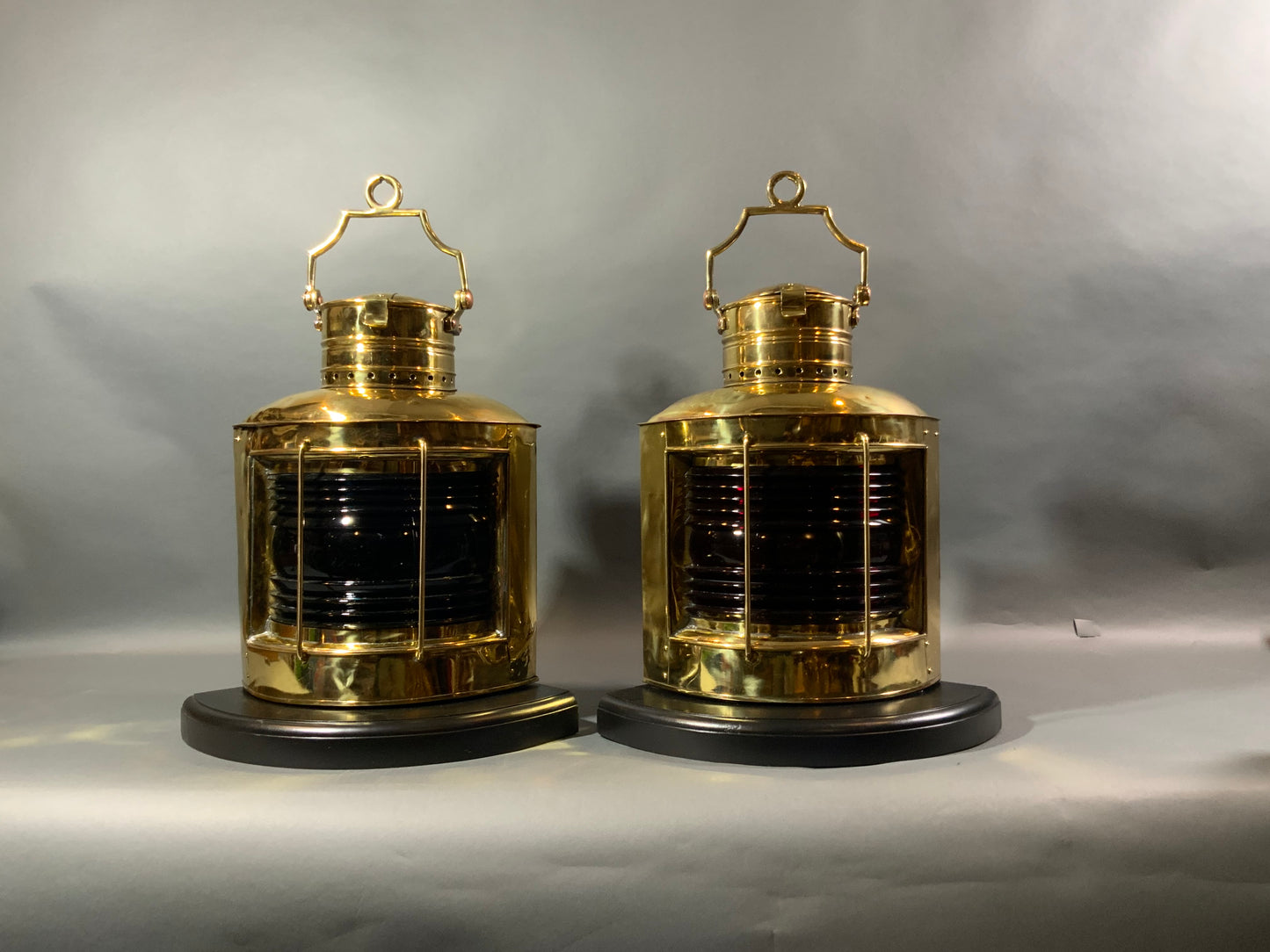 Pair of meticulously polished and lacquered ships lanterns. They have been mounted to thick mahogany bases. Protective bars protect the richly colored Fresnel glass lenses. Wired for home use.