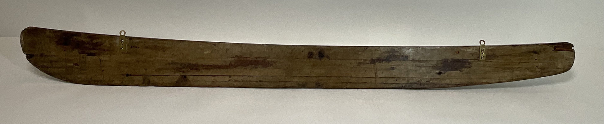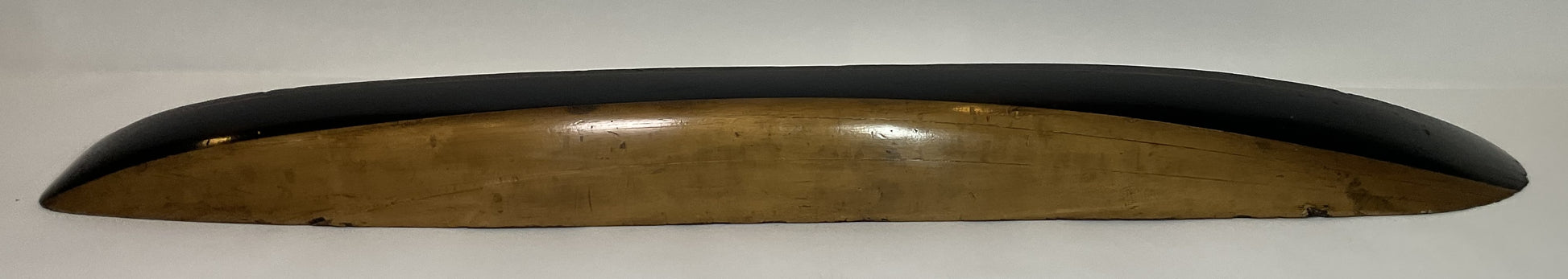 Antique half model of a long, sleek motor yacht. Laminated hull with six lifts. Painted black over gold with a gold cove stripe.