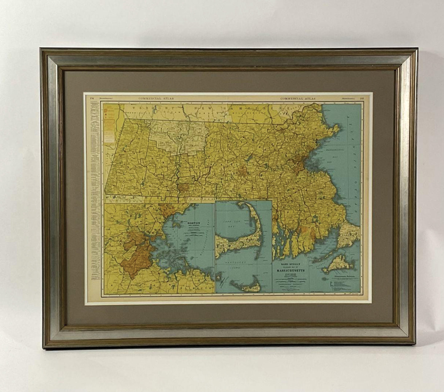 1920 Rand McNally map of Massachusetts including the Islands of Nantucket and Martha's Vineyard. Enlarged maps of Boston and Cape Cod. Matted and framed.