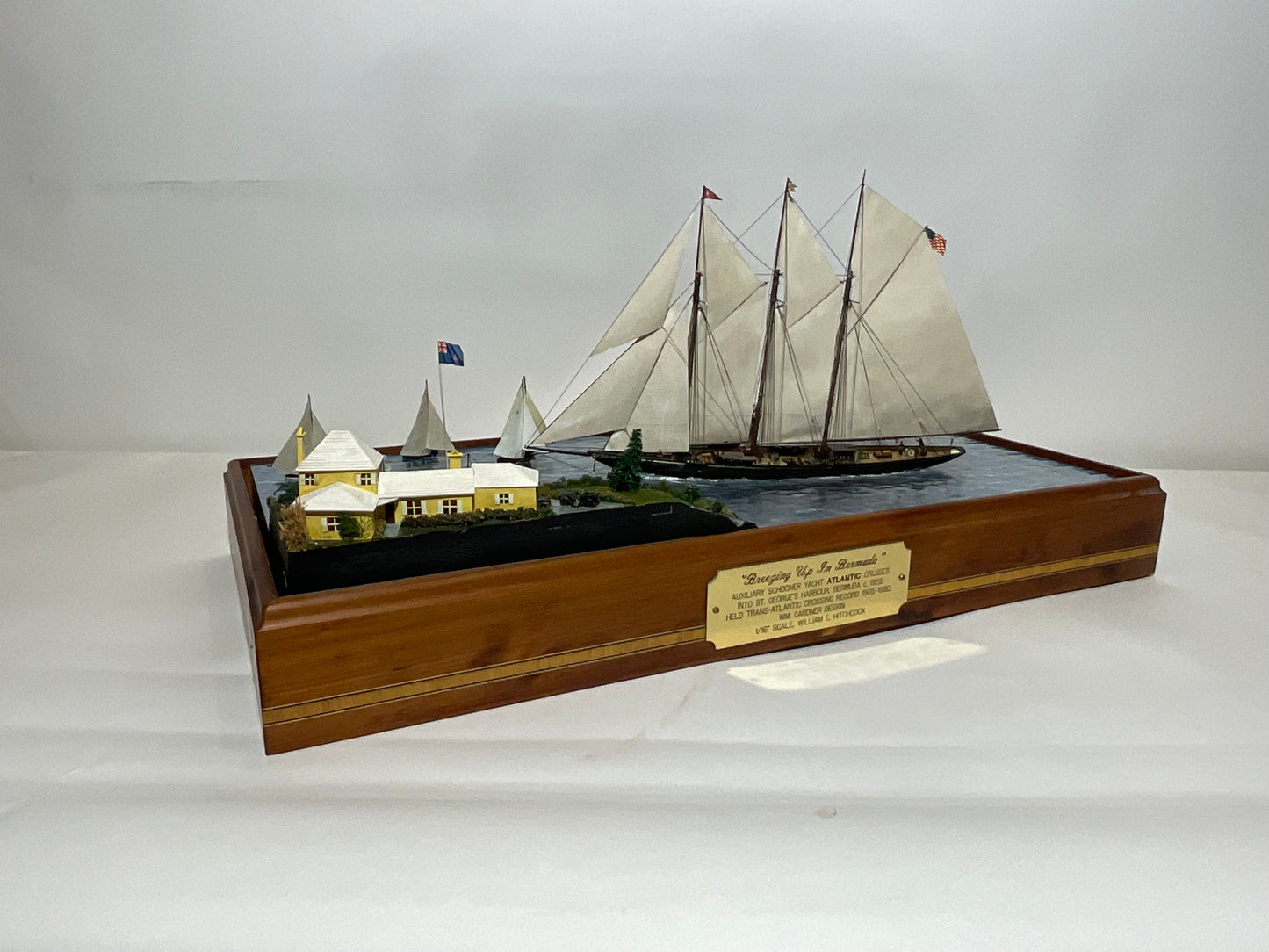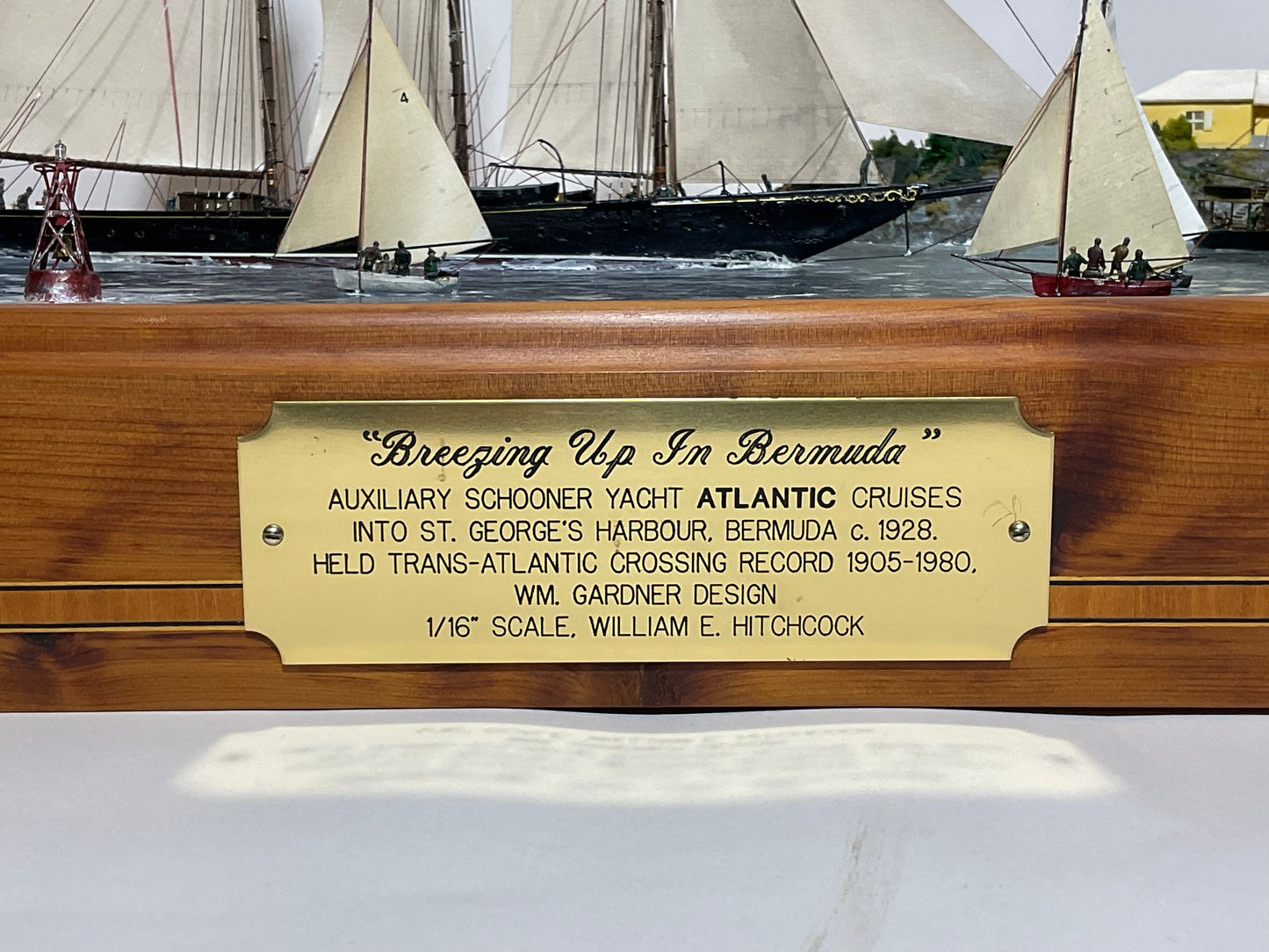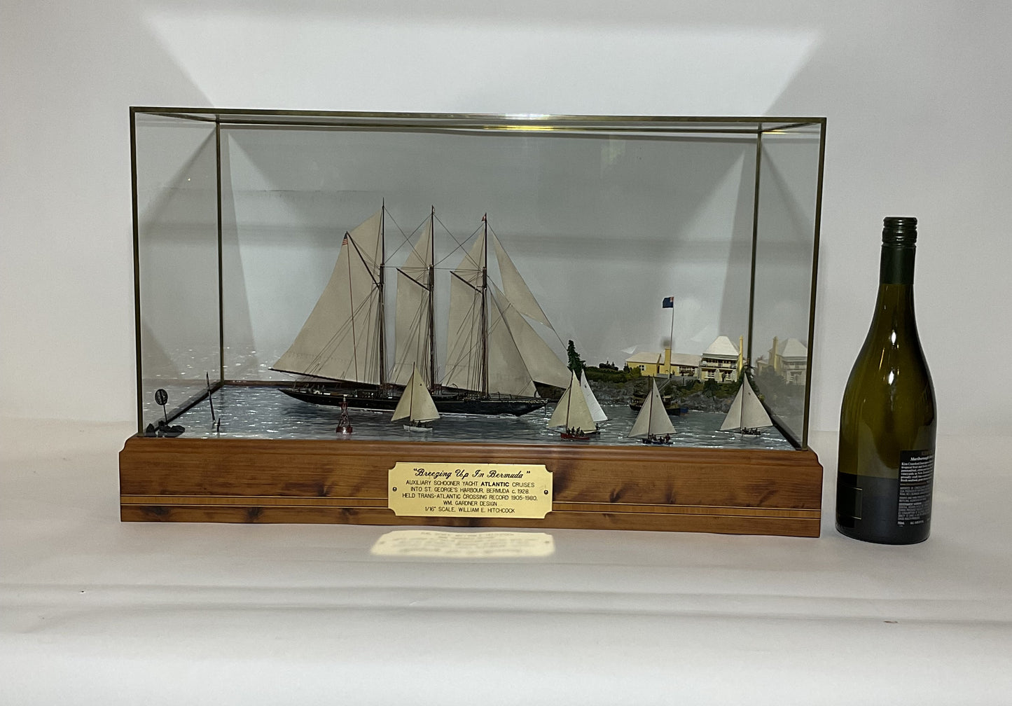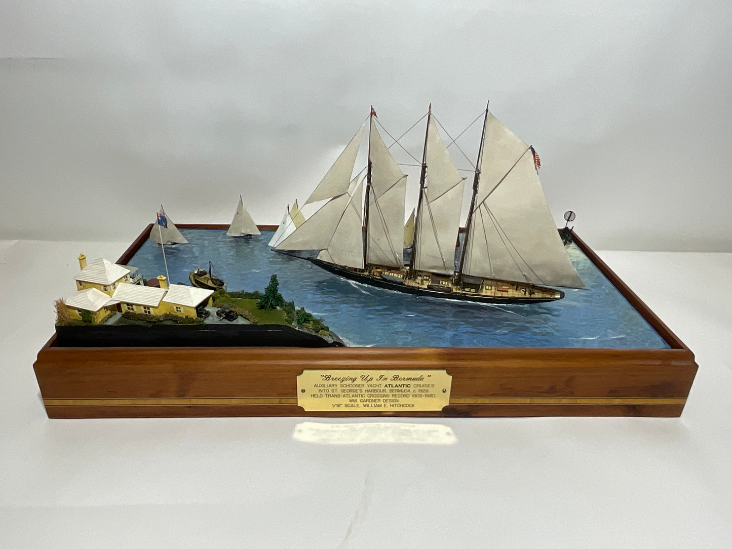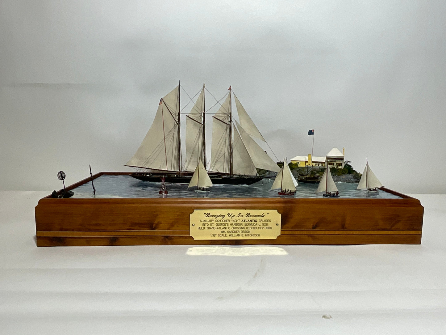 Outstanding deep water diorama by noted ship model builder William Hitchcock. Titled "Breezing up in Bermuda", auxiliary schooner yacht Atlantic cruises into St. George's harbor, Bermuda C1928. Held trans-Atlantic crossing record 1905 - 1980. William Gardner design, 1/16th scale William E Hitchcock. The gracious three masted schooner yacht "Atlantic" is passing a fleet of Bermuda Dinghies in Hamilton Harbor Circa 1910. Hitchcock used his trademark deep water technique on this wonderful piece. Fitted to a custom case.