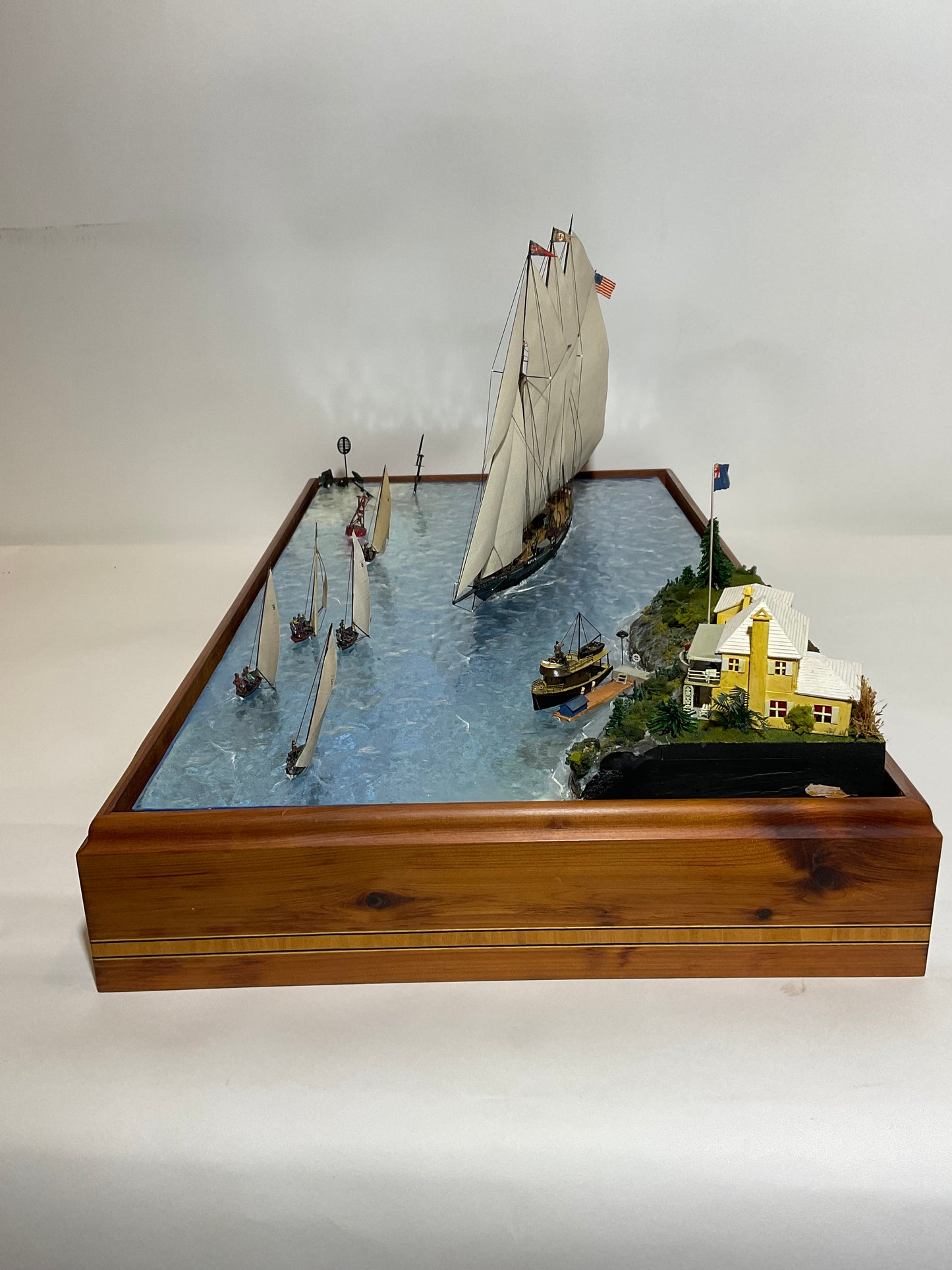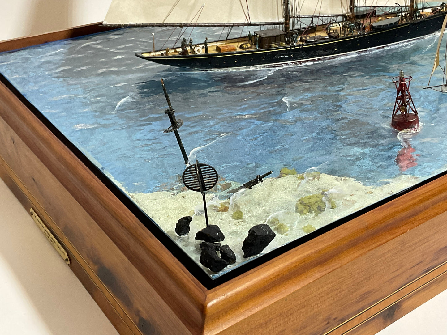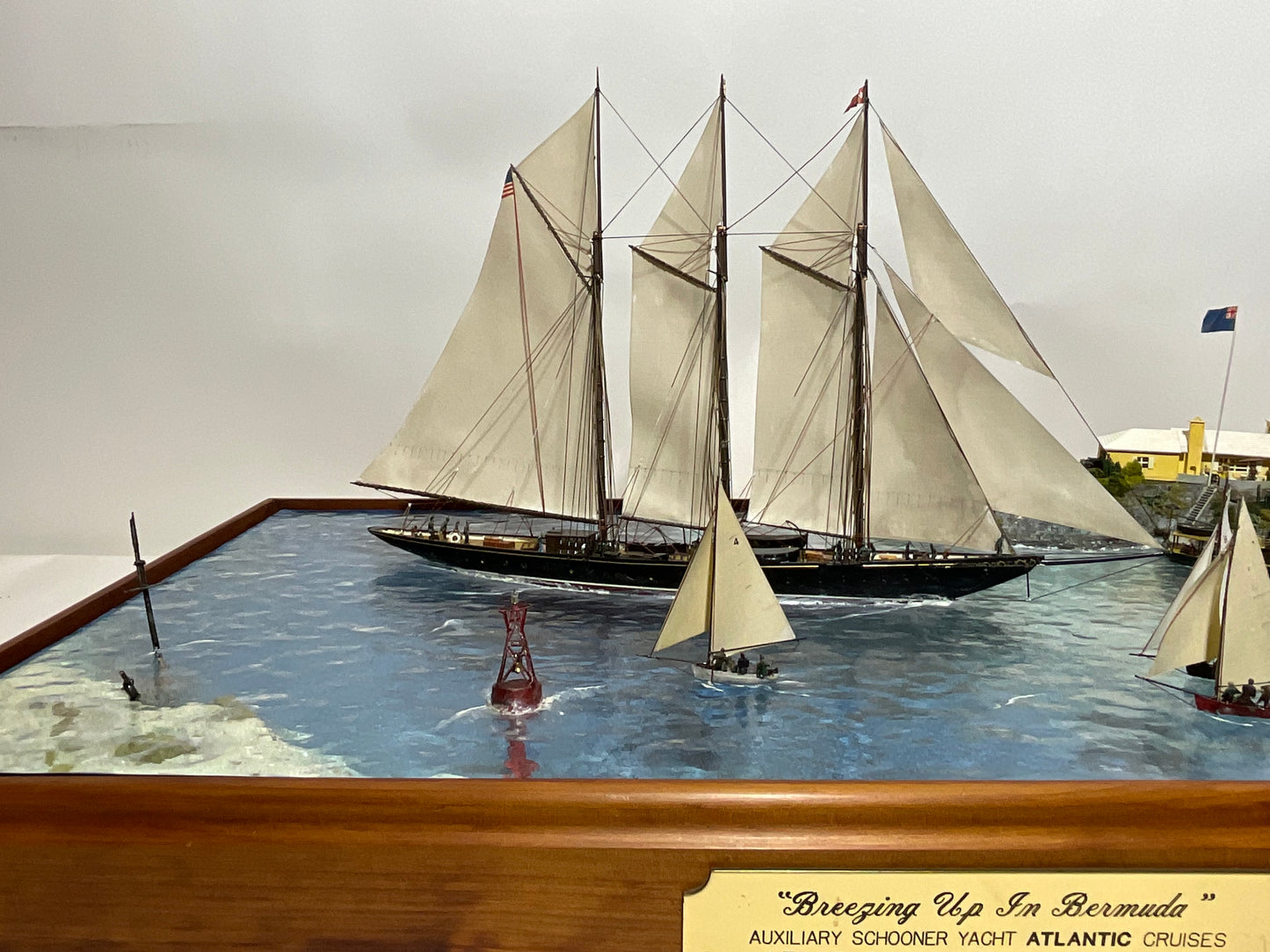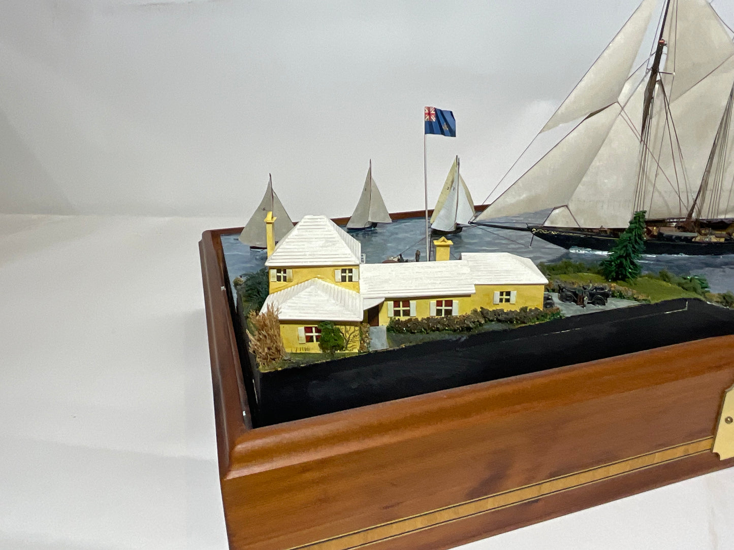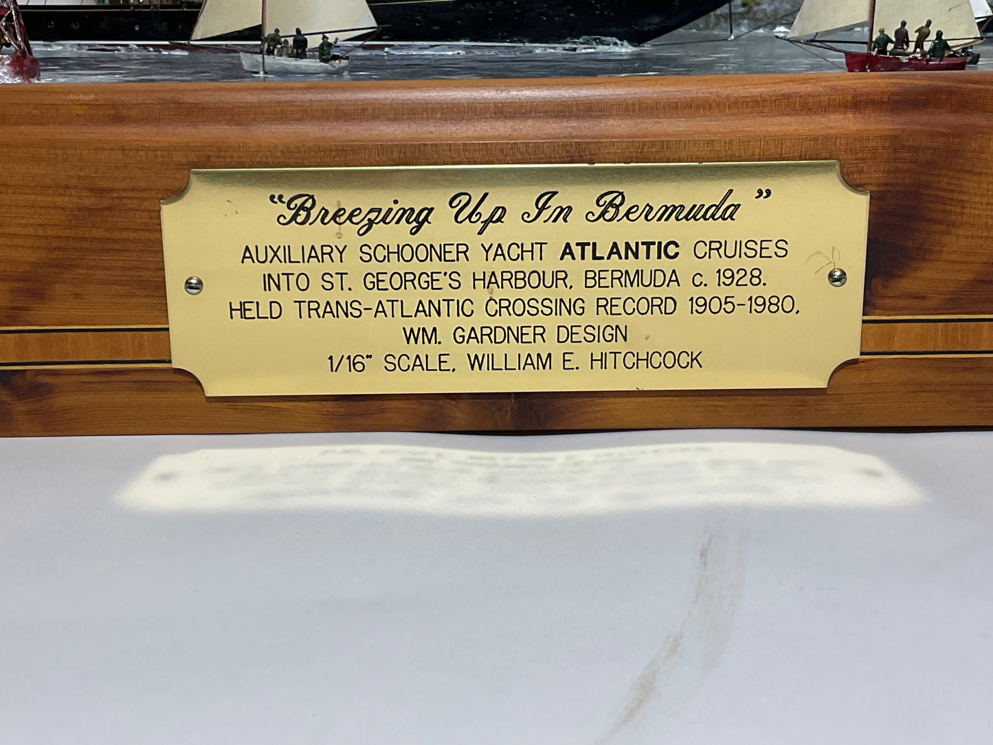Outstanding deep water diorama by noted ship model builder William Hitchcock. Titled "Breezing up in Bermuda", auxiliary schooner yacht Atlantic cruises into St. George's harbor, Bermuda C1928. Held trans-Atlantic crossing record 1905 - 1980. William Gardner design, 1/16th scale William E Hitchcock. The gracious three masted schooner yacht "Atlantic" is passing a fleet of Bermuda Dinghies in Hamilton Harbor Circa 1910. Hitchcock used his trademark deep water technique on this wonderful piece. Fitted to a custom case.
