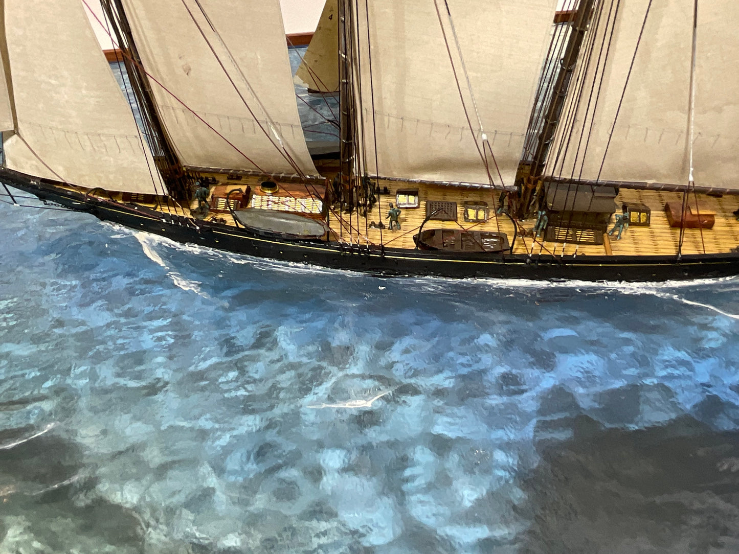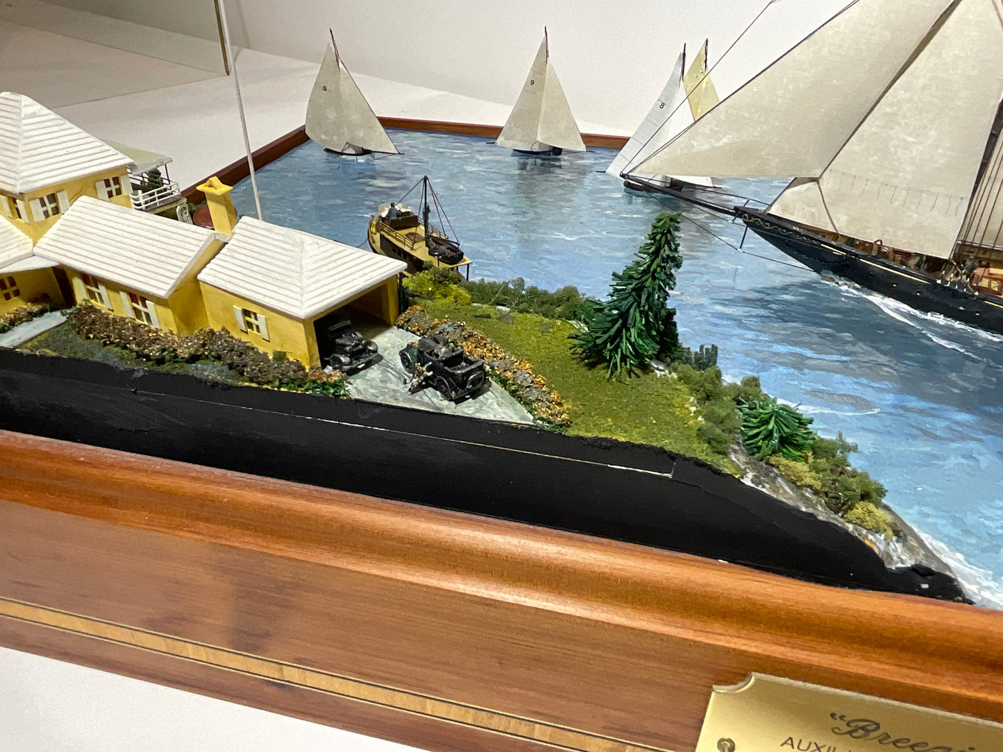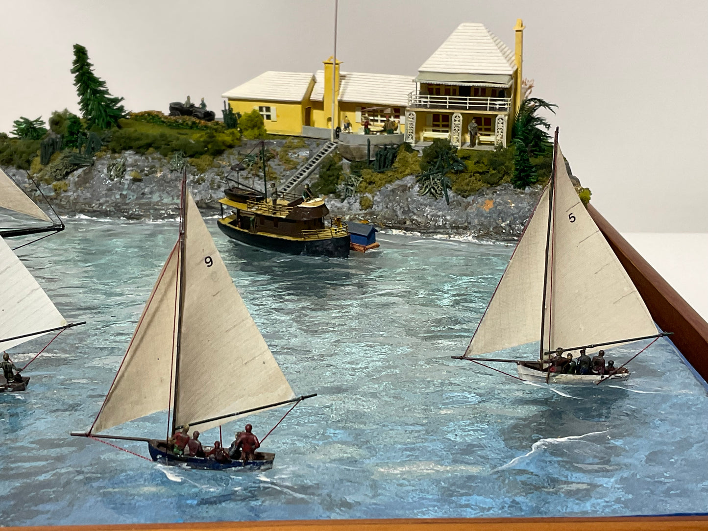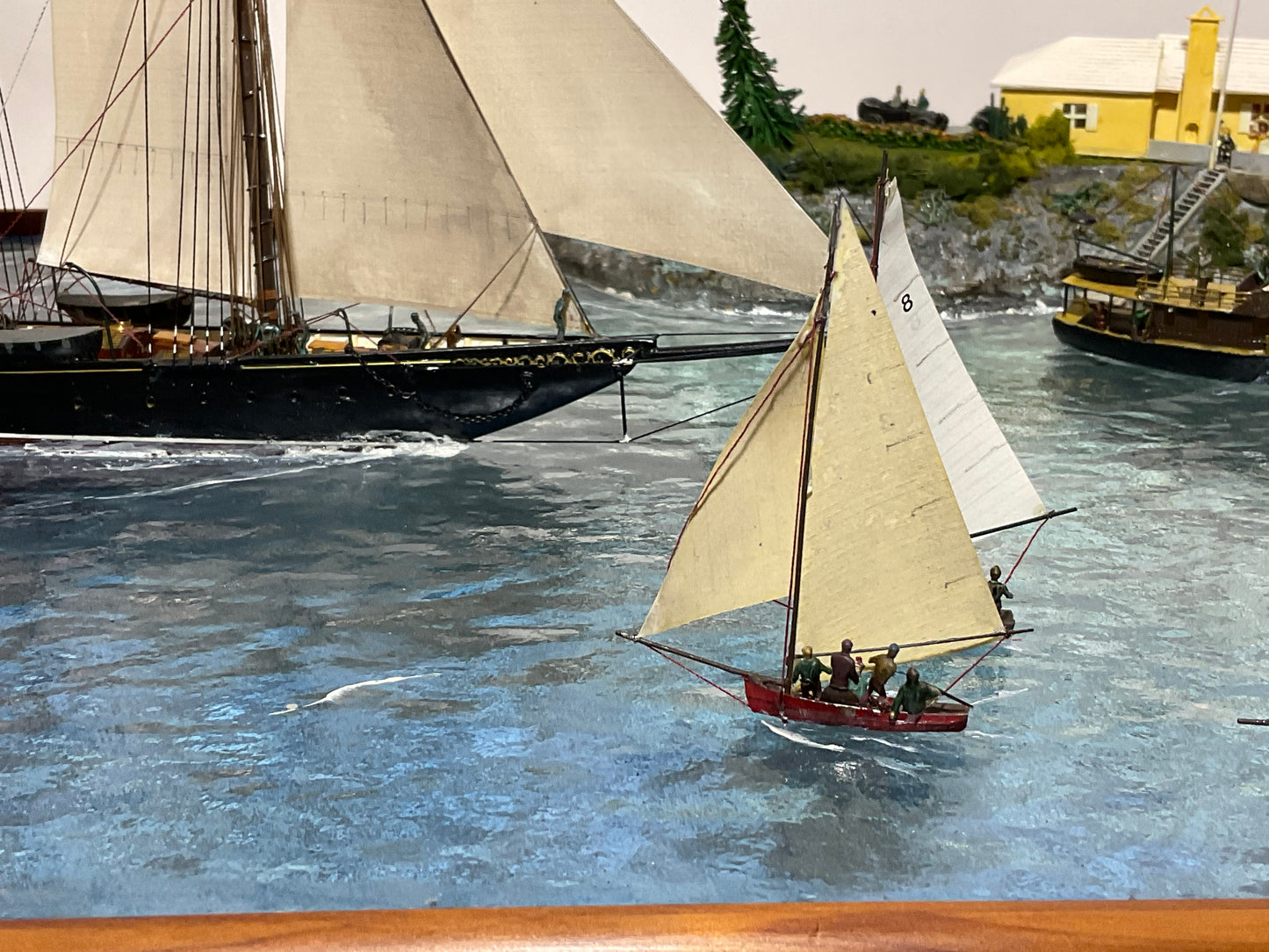 Outstanding deep water diorama by noted ship model builder William Hitchcock. Titled "Breezing up in Bermuda", auxiliary schooner yacht Atlantic cruises into St. George's harbor, Bermuda C1928. Held trans-Atlantic crossing record 1905 - 1980. William Gardner design, 1/16th scale William E Hitchcock. The gracious three masted schooner yacht "Atlantic" is passing a fleet of Bermuda Dinghies in Hamilton Harbor Circa 1910. Hitchcock used his trademark deep water technique on this wonderful piece. Fitted to a custom case.