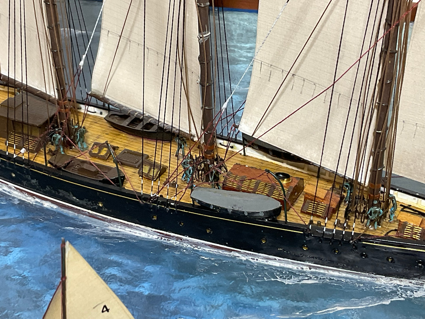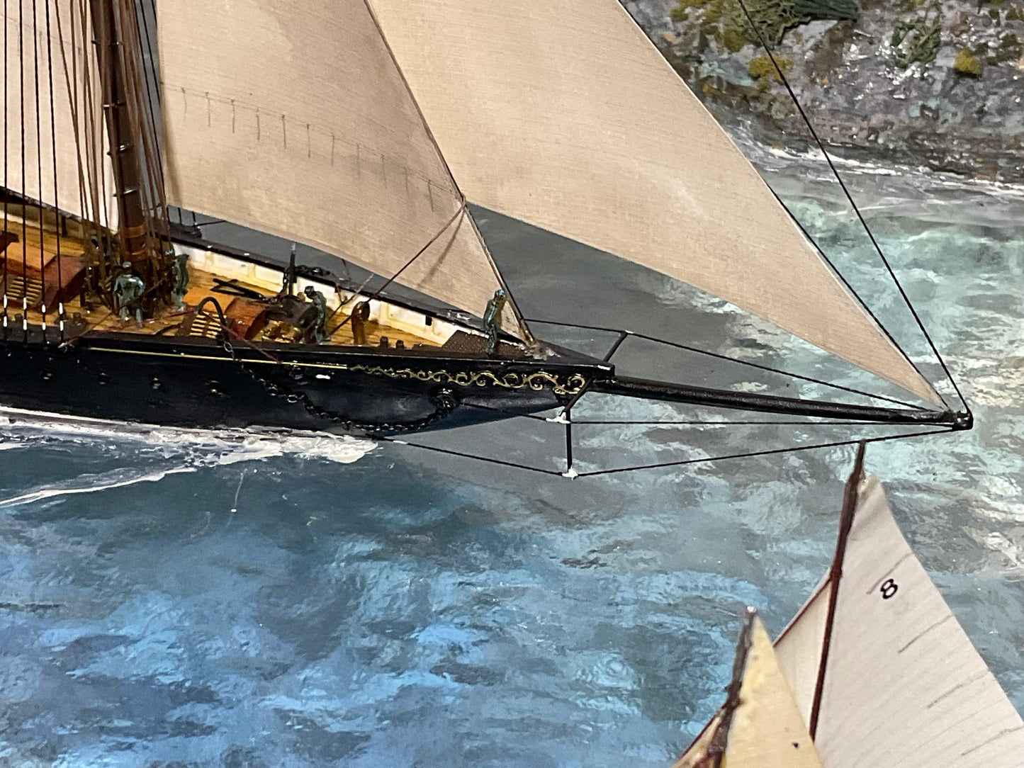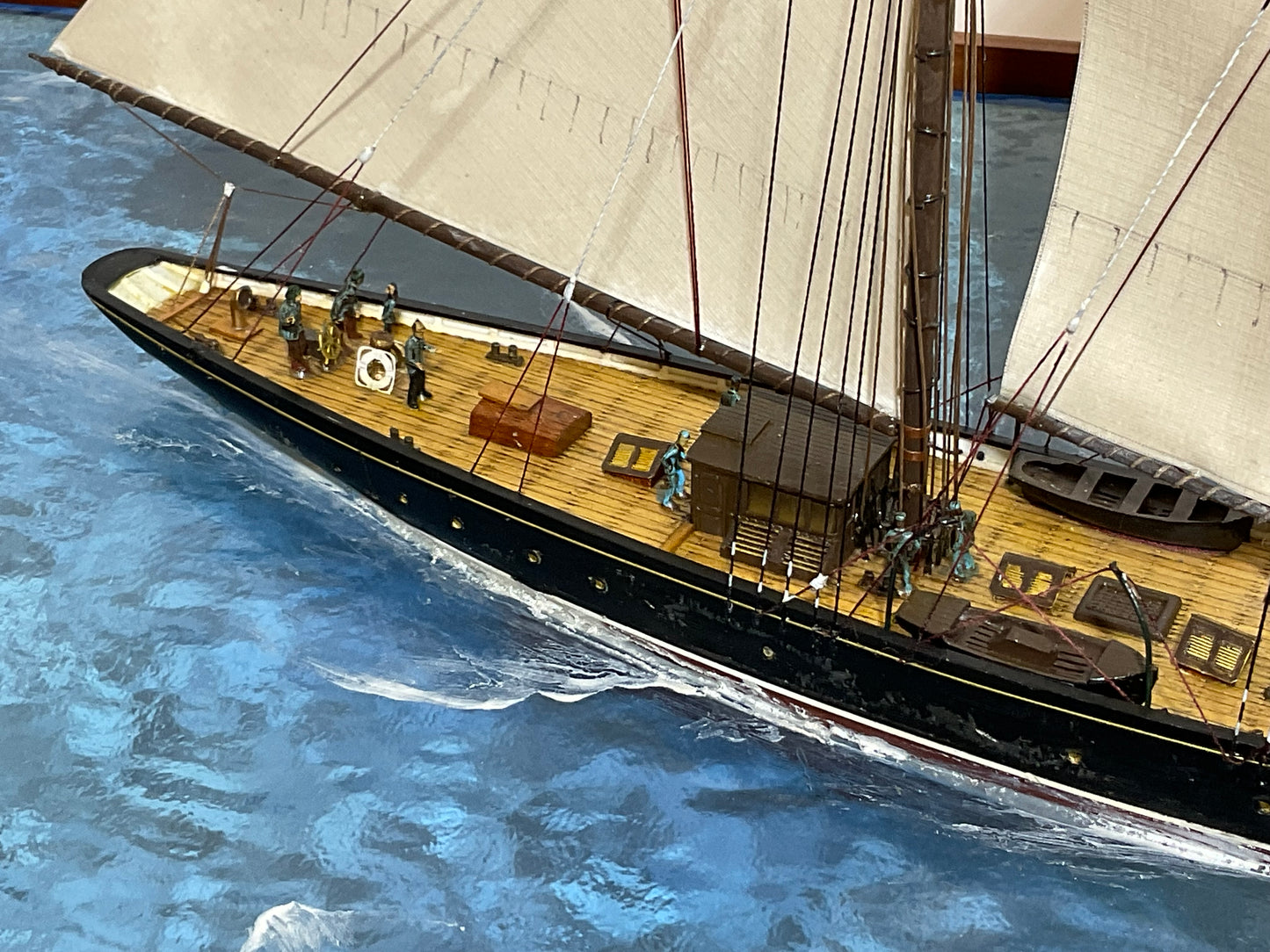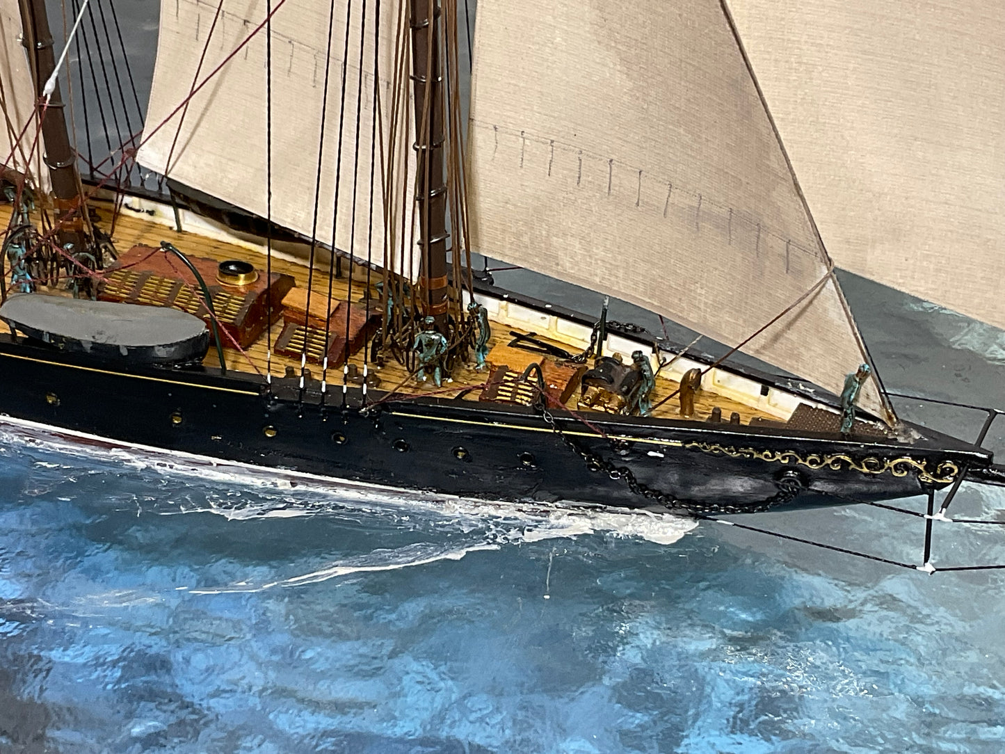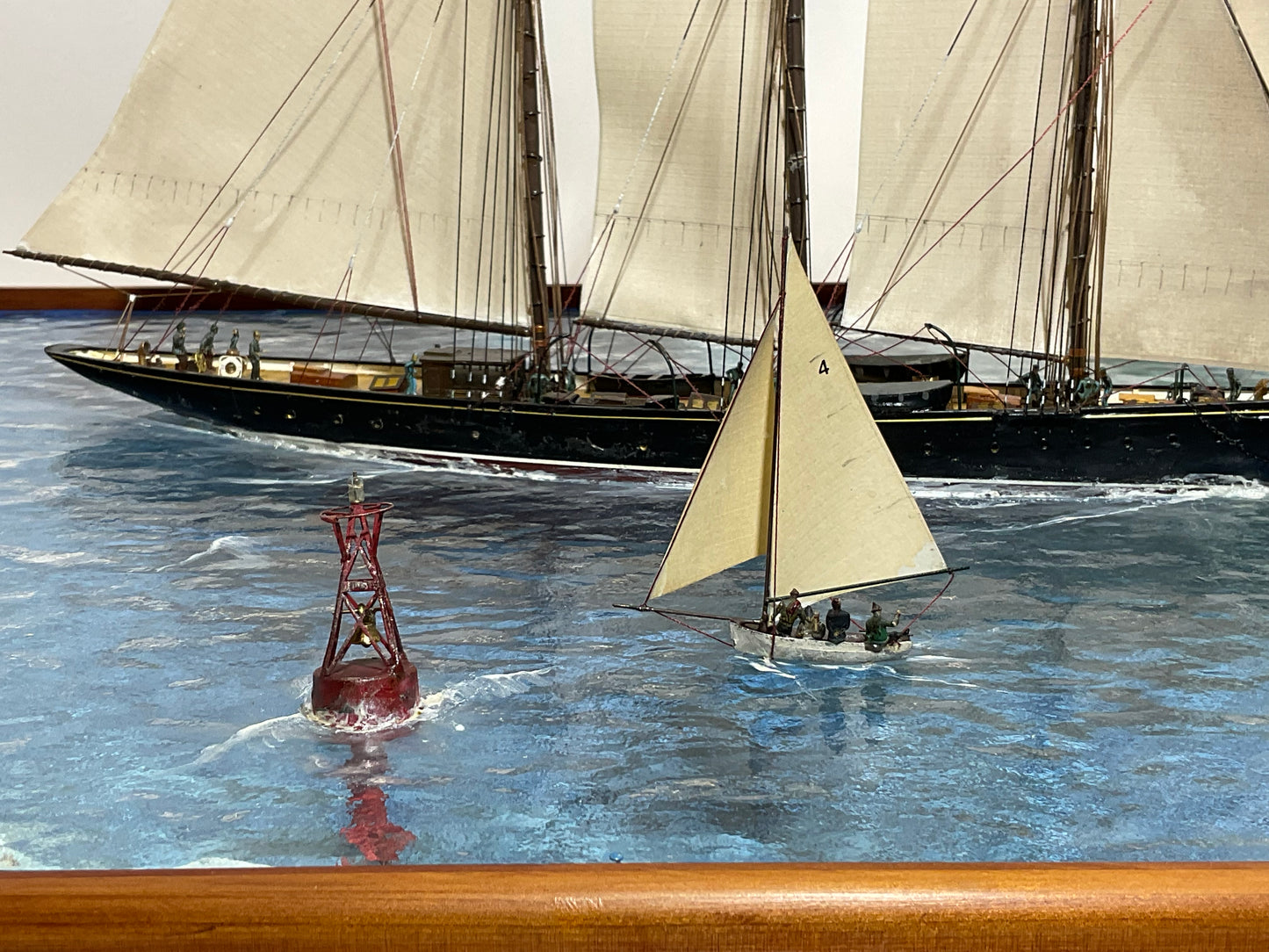 Outstanding deep water diorama by noted ship model builder William Hitchcock. Titled "Breezing up in Bermuda", auxiliary schooner yacht Atlantic cruises into St. George's harbor, Bermuda C1928. Held trans-Atlantic crossing record 1905 - 1980. William Gardner design, 1/16th scale William E Hitchcock. The gracious three masted schooner yacht "Atlantic" is passing a fleet of Bermuda Dinghies in Hamilton Harbor Circa 1910. Hitchcock used his trademark deep water technique on this wonderful piece. Fitted to a custom case.