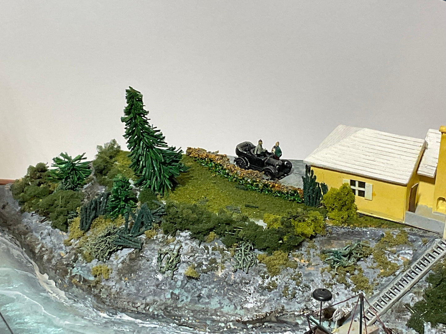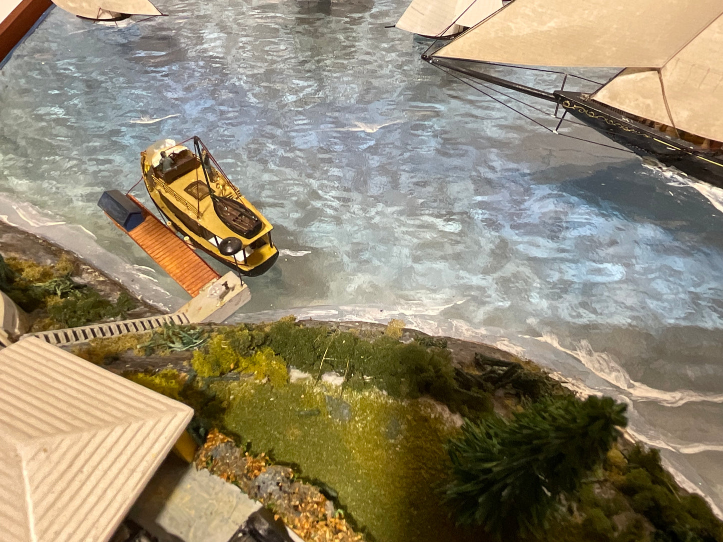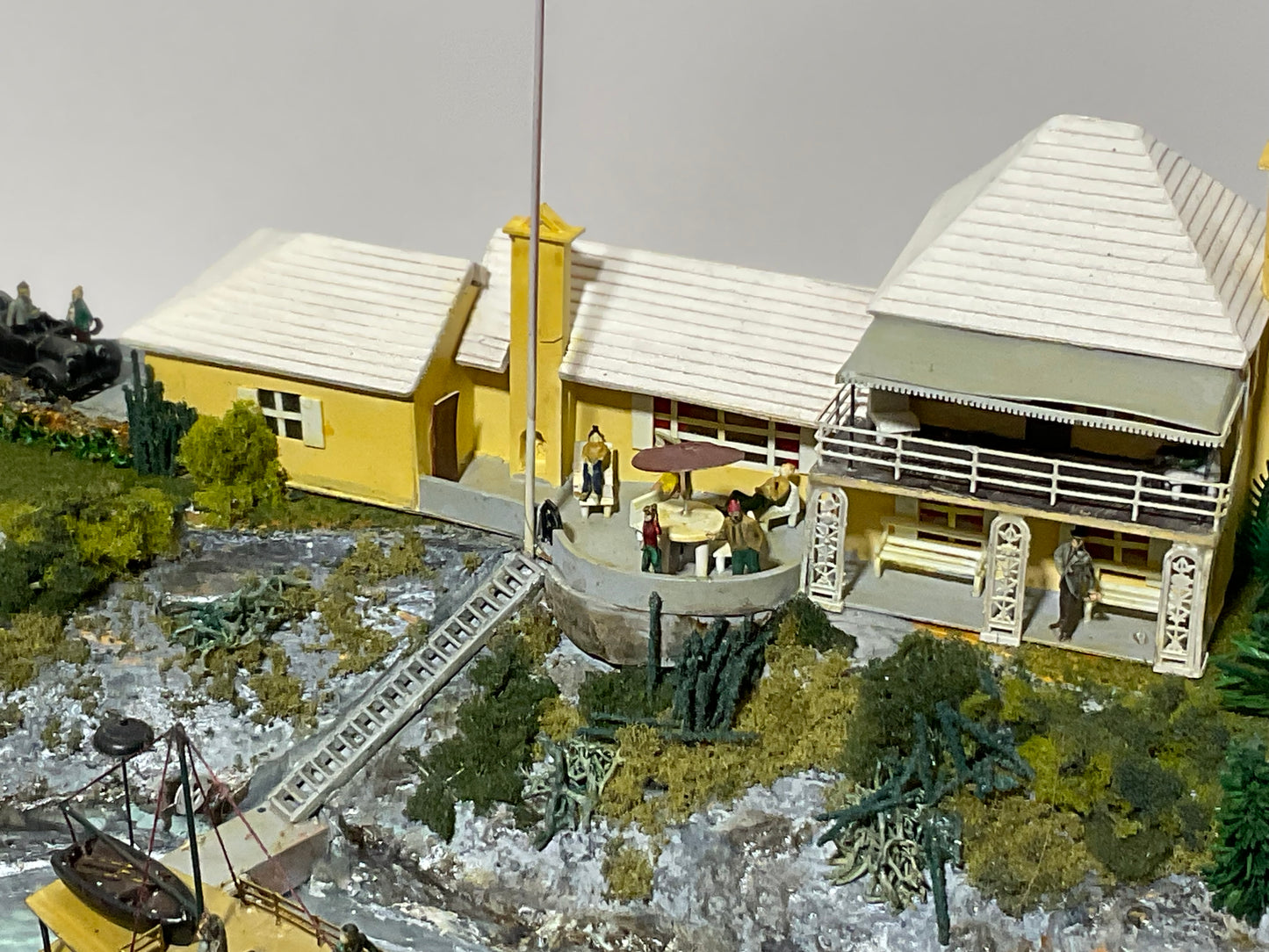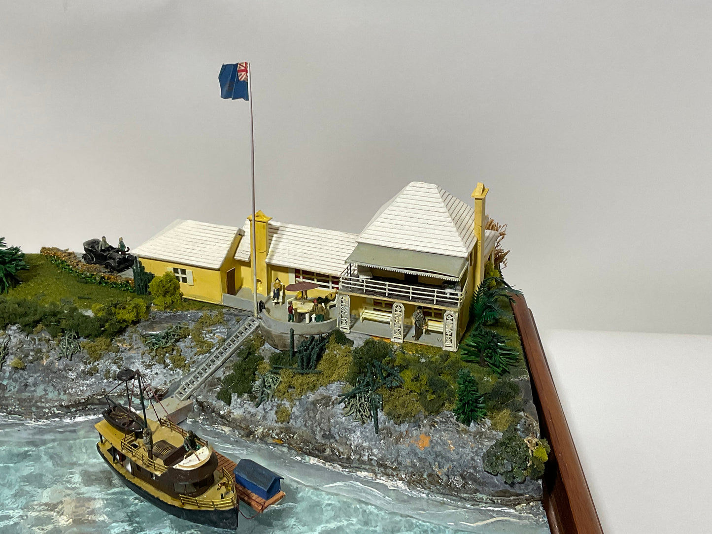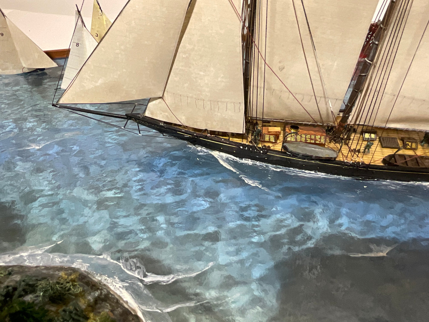 Outstanding deep water diorama by noted ship model builder William Hitchcock. Titled "Breezing up in Bermuda", auxiliary schooner yacht Atlantic cruises into St. George's harbor, Bermuda C1928. Held trans-Atlantic crossing record 1905 - 1980. William Gardner design, 1/16th scale William E Hitchcock. The gracious three masted schooner yacht "Atlantic" is passing a fleet of Bermuda Dinghies in Hamilton Harbor Circa 1910. Hitchcock used his trademark deep water technique on this wonderful piece. Fitted to a custom case.