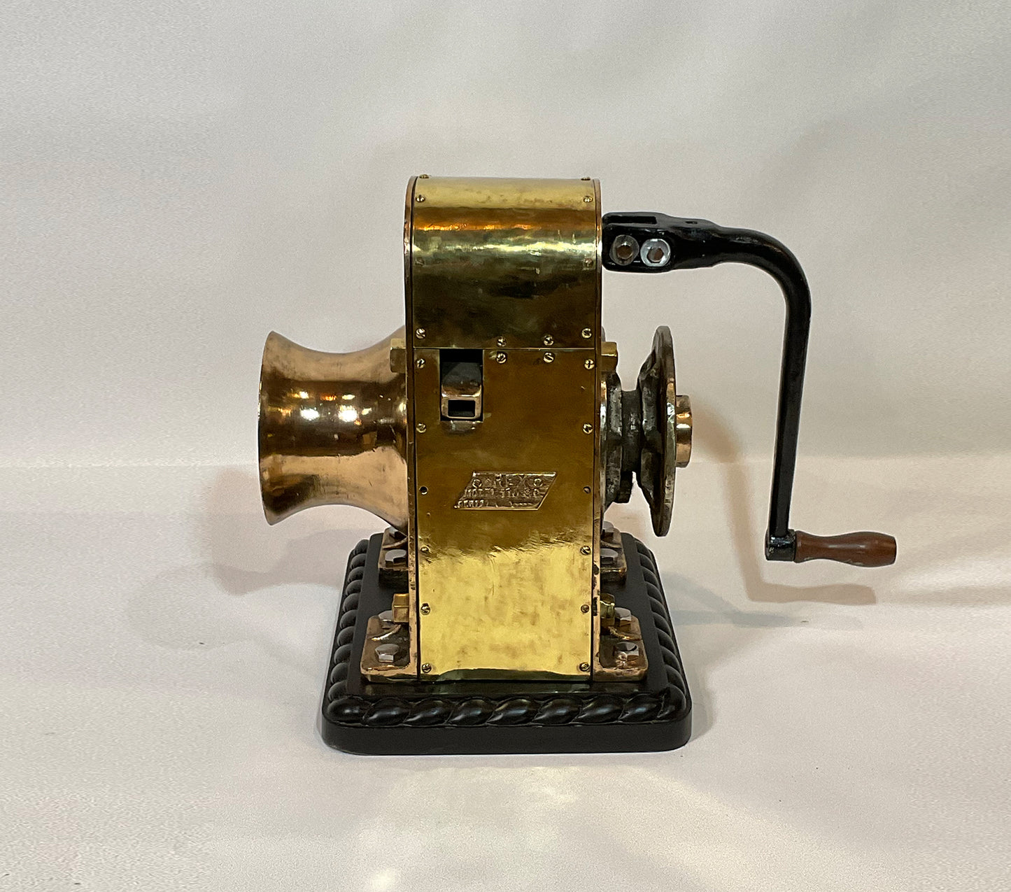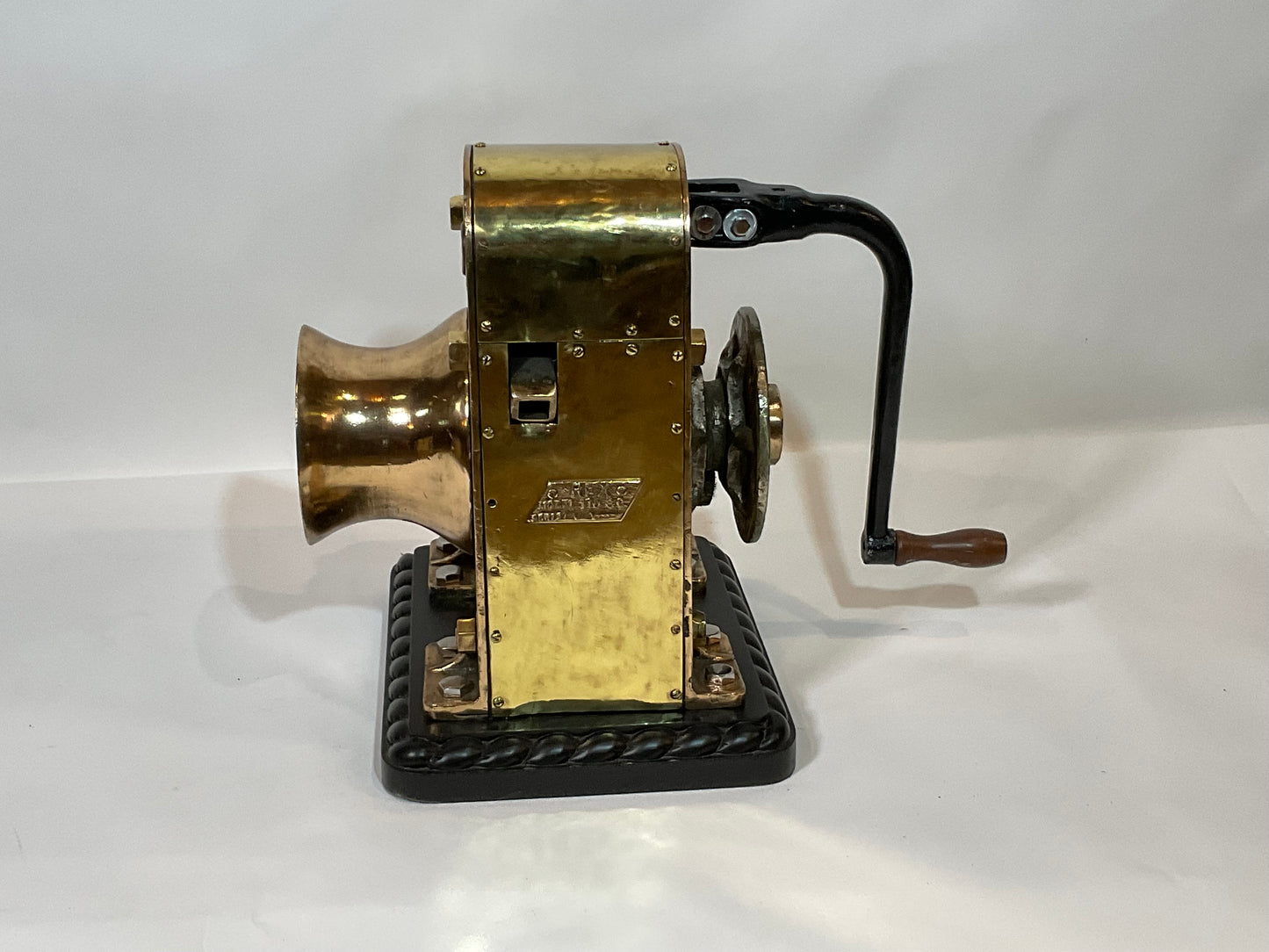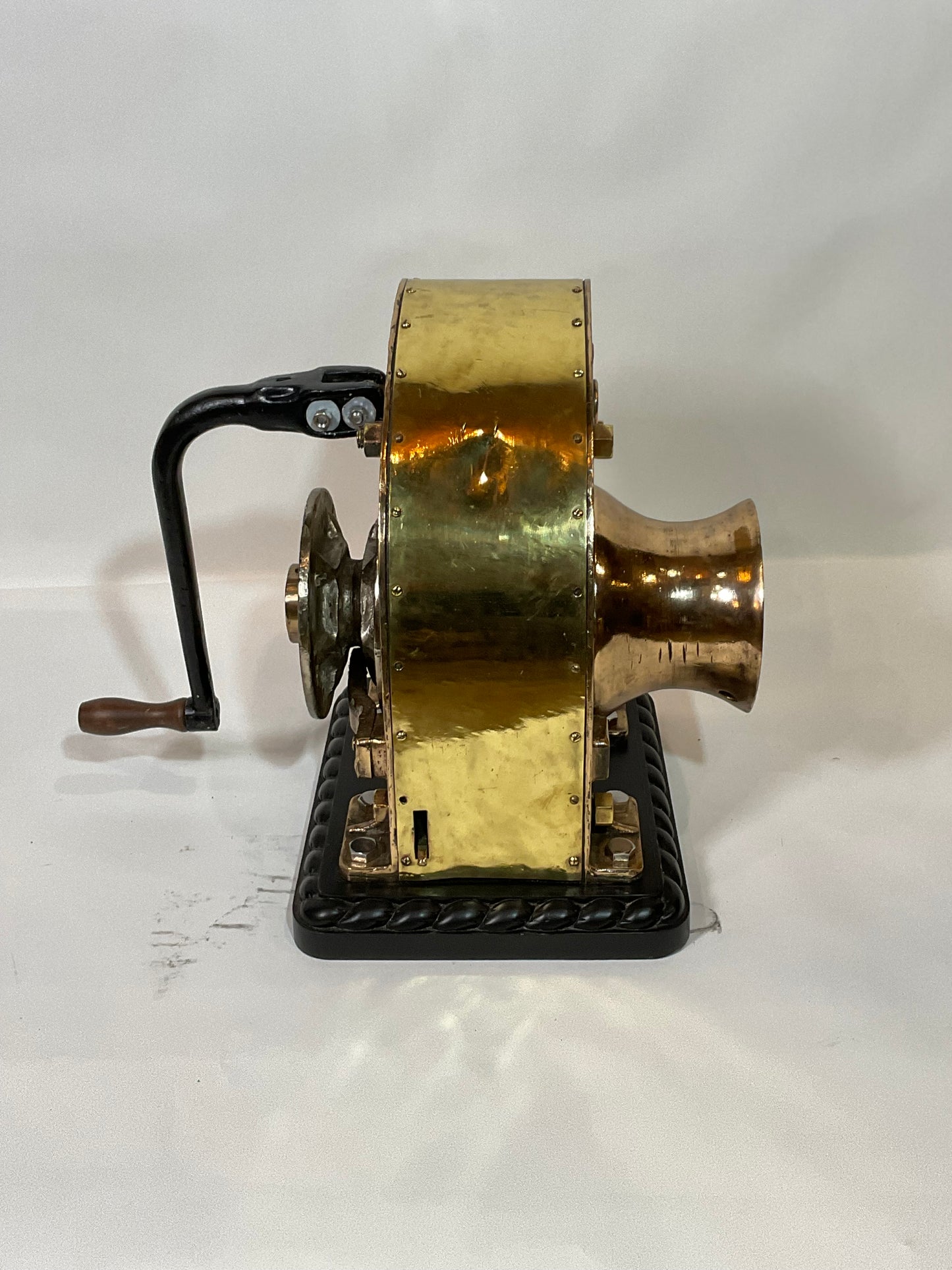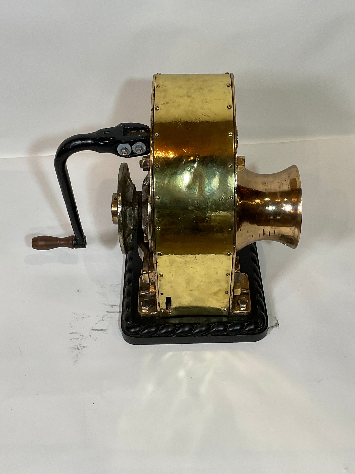 Ships winch by REX, model 110. This is extremely heavy, 220 pounds. The huge brass drum has a shaft that runs through the winch connecting to a chain sprocket. Also fitted with an iron handle with wood handle. Mounted by us to a wood base with rope carved border. Big, brawny and beautiful.