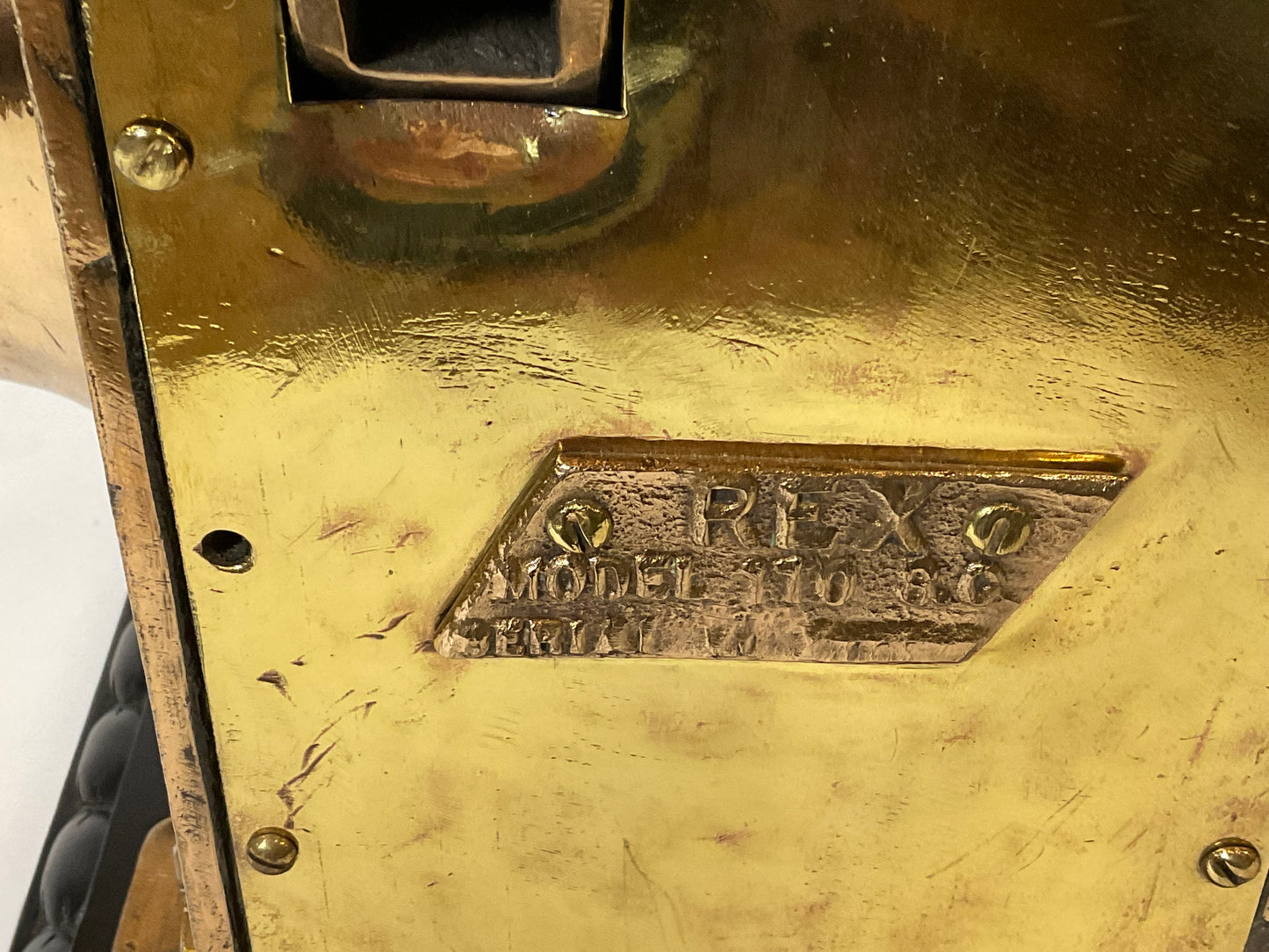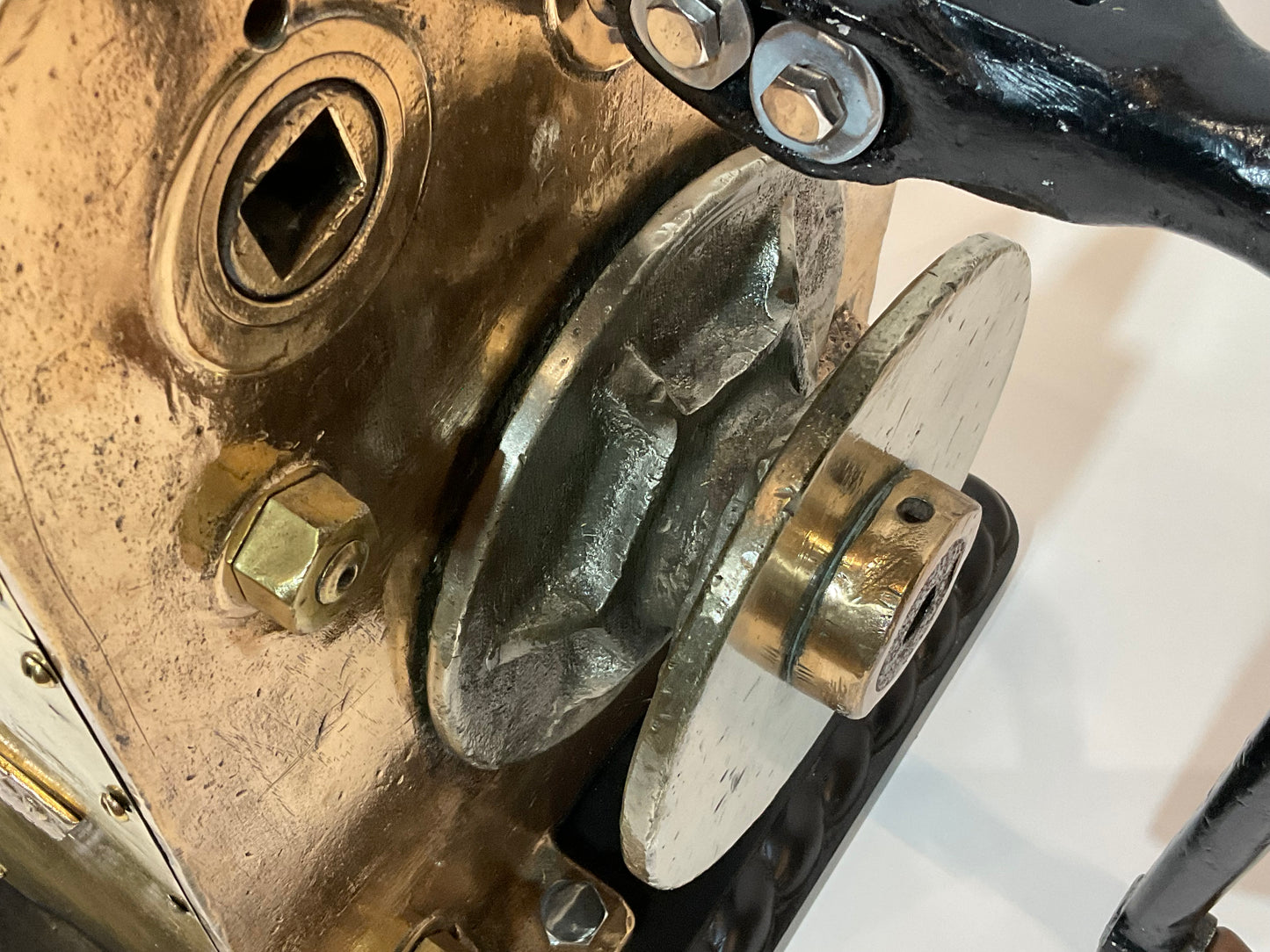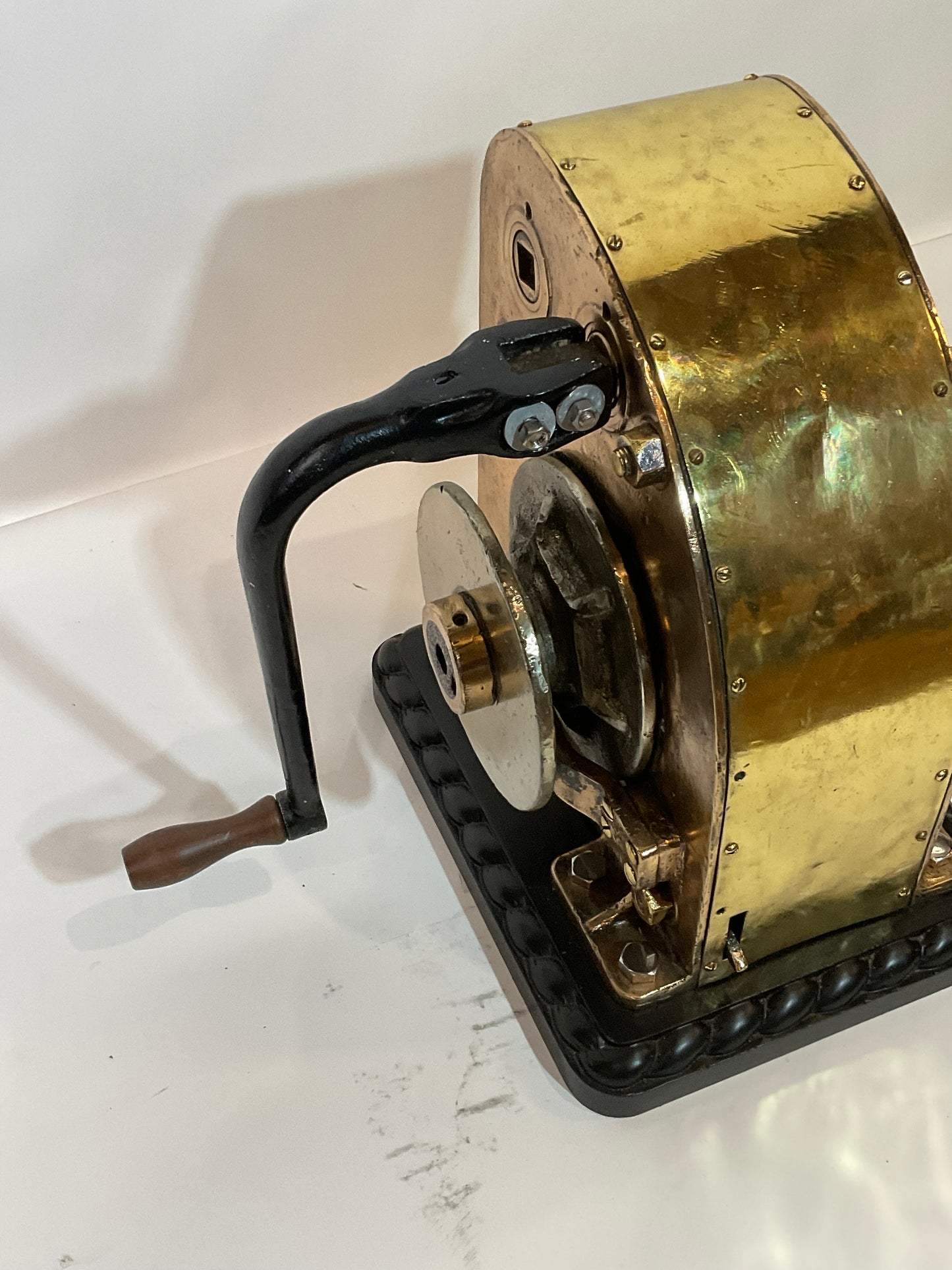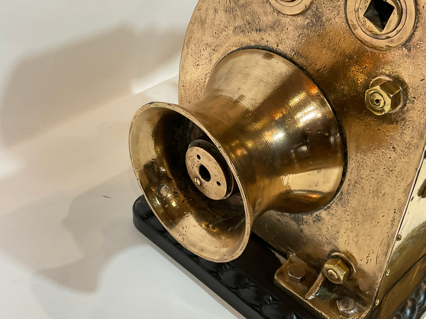 Ships winch by REX, model 110. This is extremely heavy, 220 pounds. The huge brass drum has a shaft that runs through the winch connecting to a chain sprocket. Also fitted with an iron handle with wood handle. Mounted by us to a wood base with rope carved border. Big, brawny and beautiful.