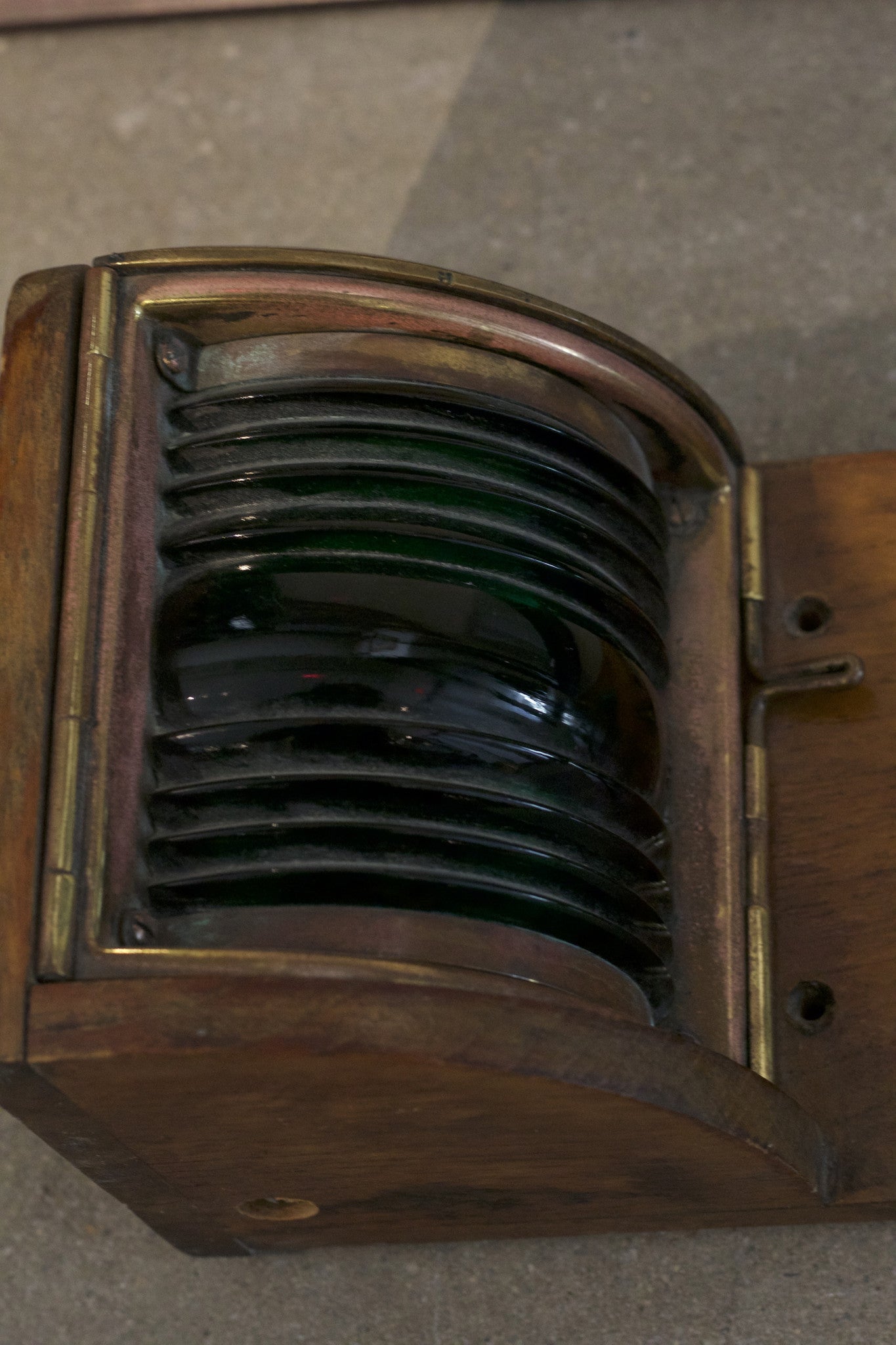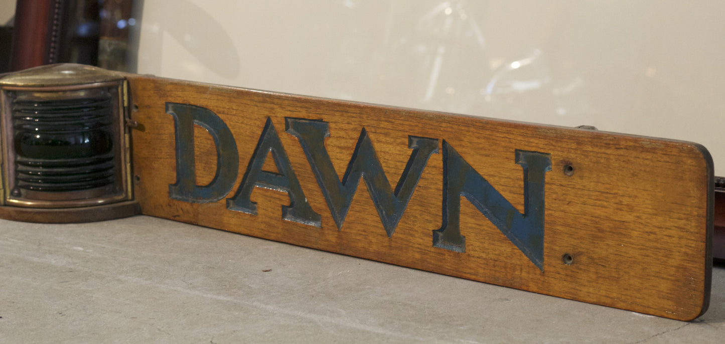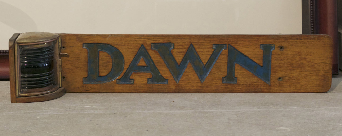 Nameboard from yacht "Dawn" with antique starboard light. Dimensions: 31" L x 6" H