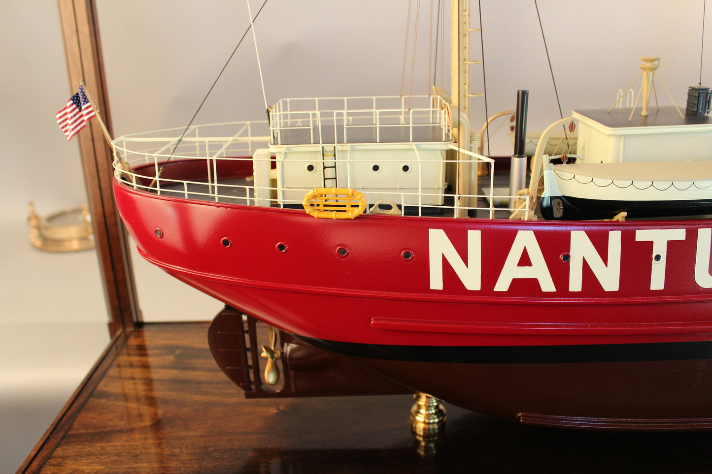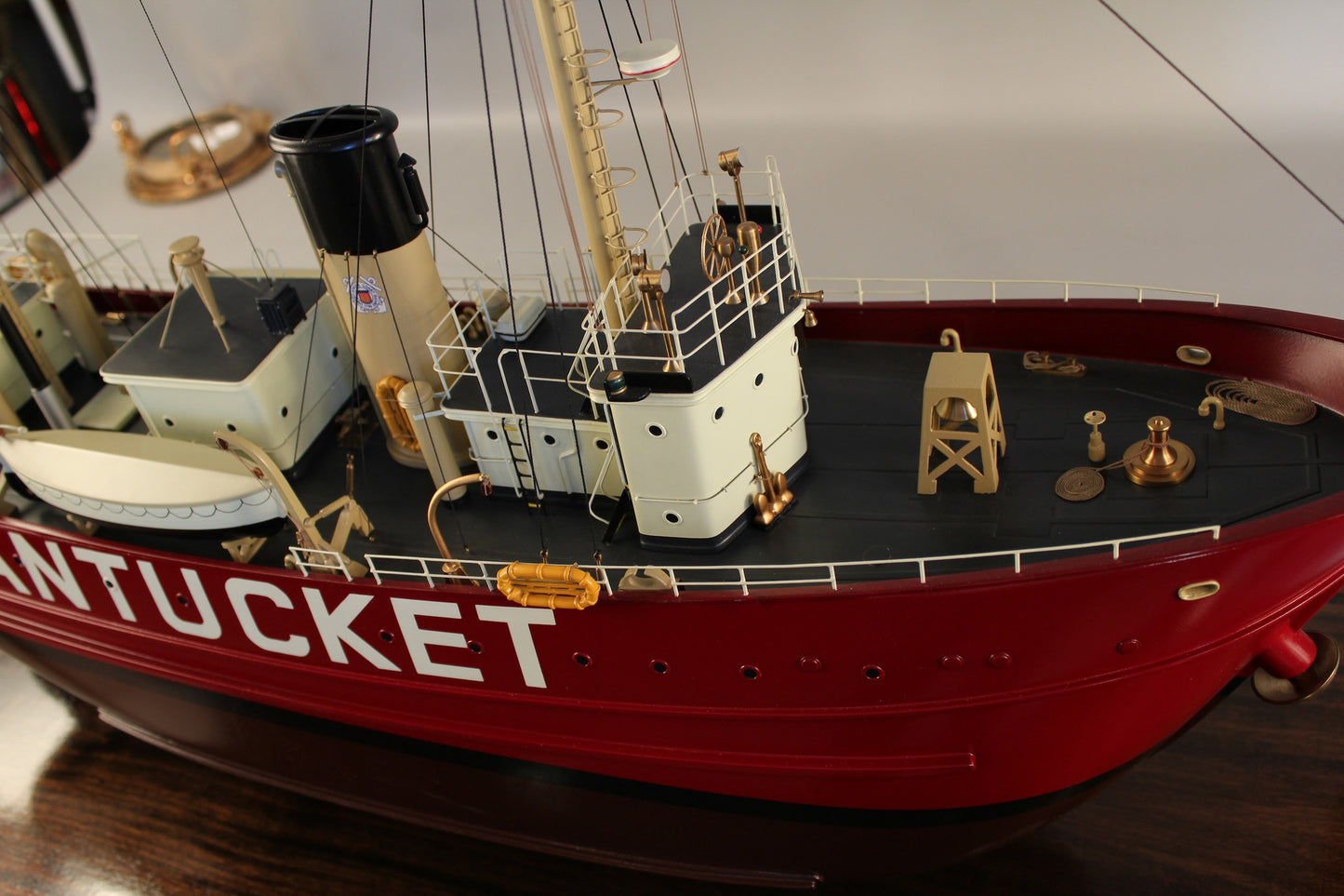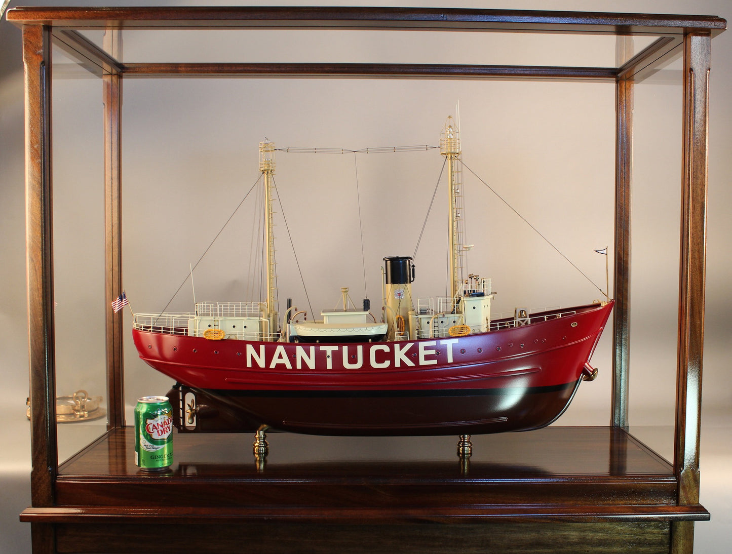 Museum quality model of the Lightship Nantucket, outfitted with countless milled brass fittings. Carved hardwood hull, painted brass masts etc... Also showing well executed cabin work. Mounted into a glass and mahogany display case with table stand. 44" long x 15" wide x 61" high.