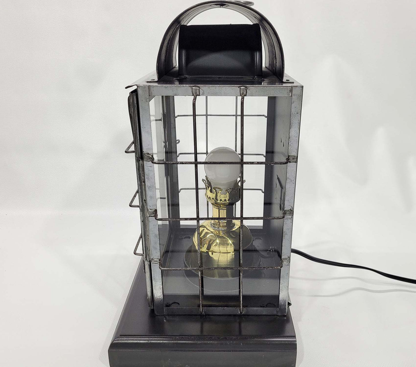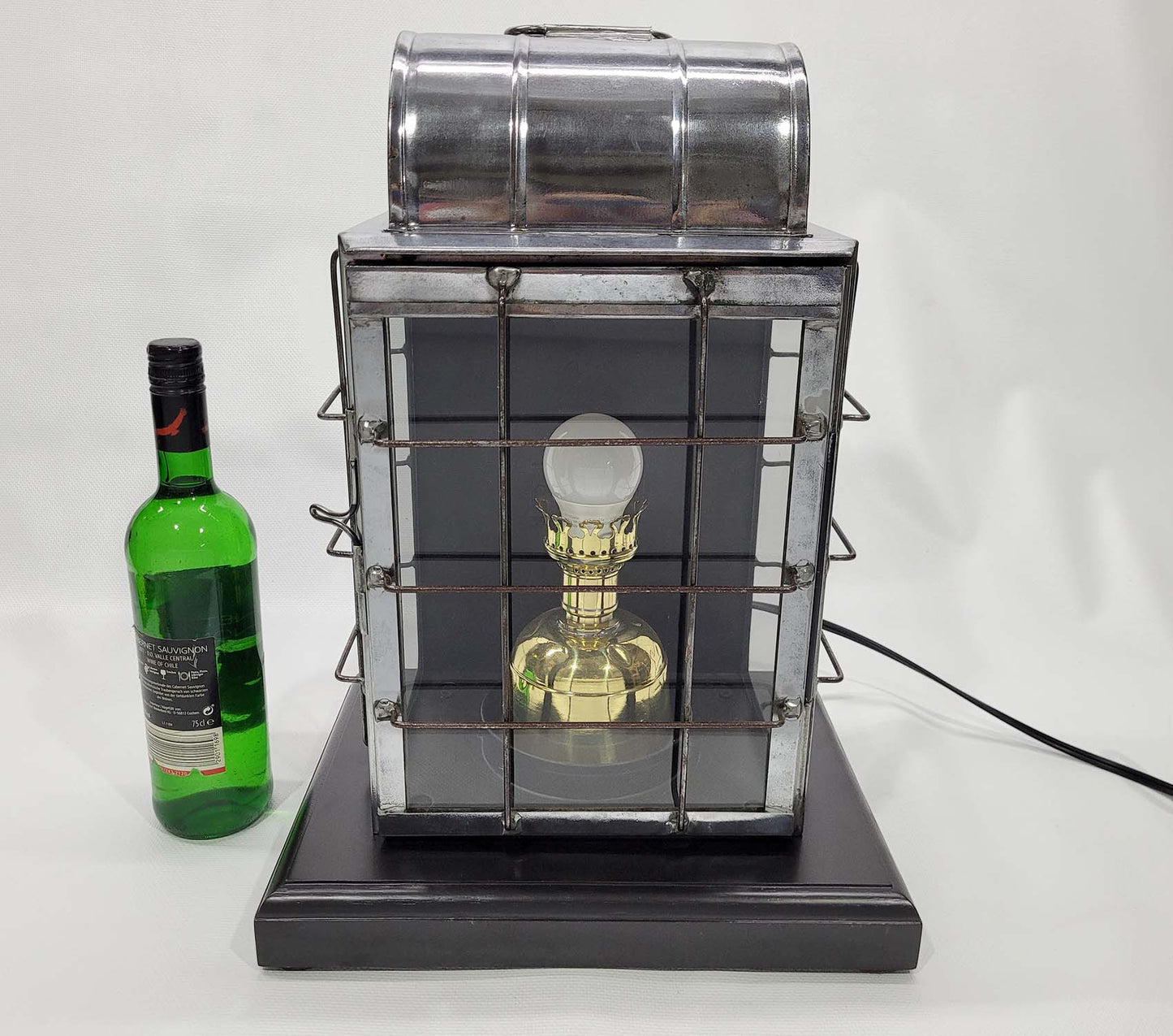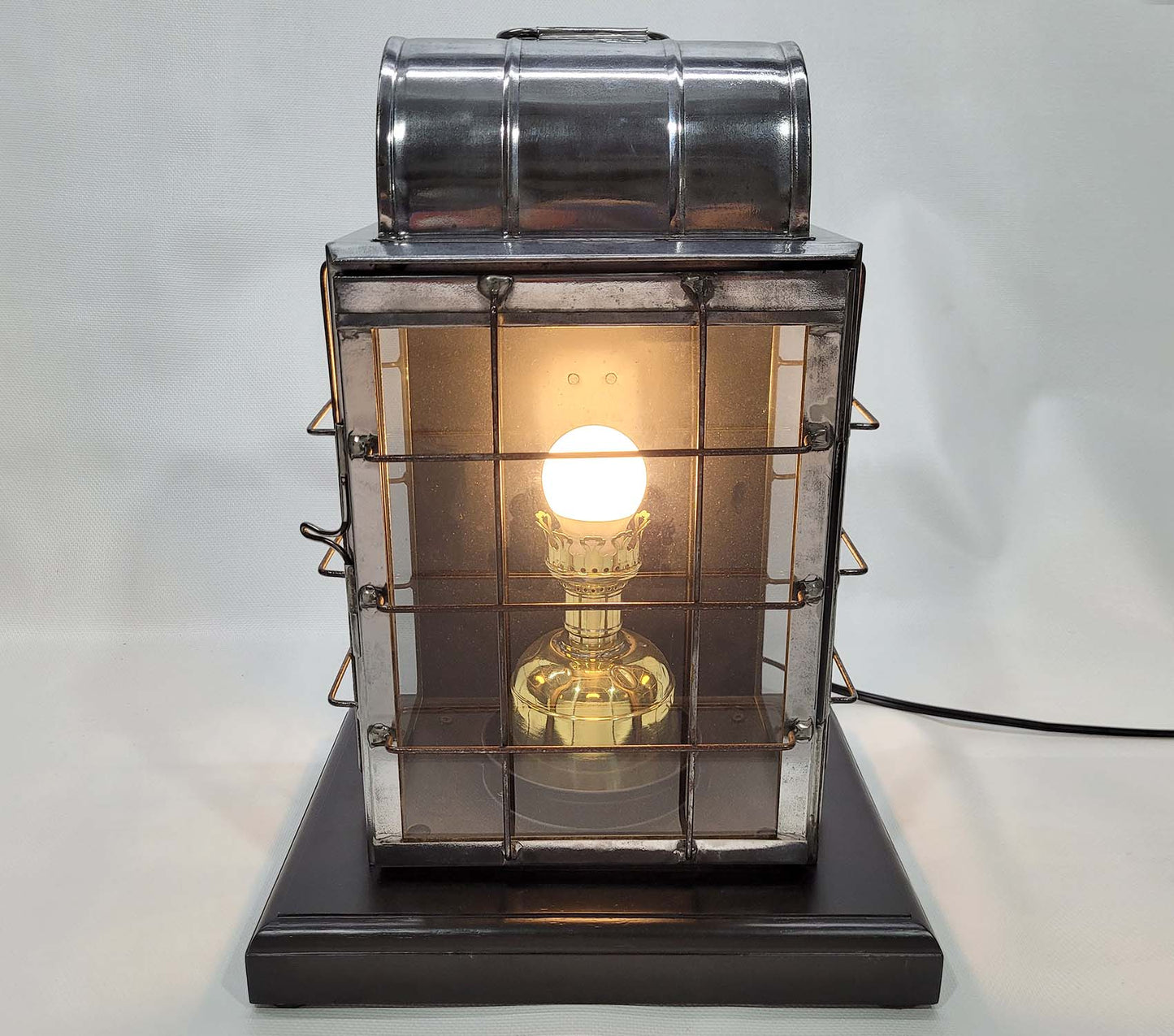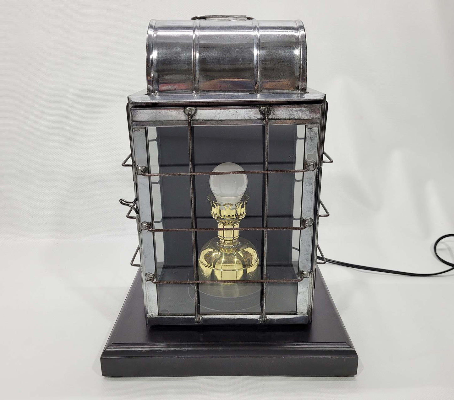 Ships lantern by the National Marine Lamp Company. Polished steel case with protective wire cage. The brass burner has been fitted with an electric socket. The lantern has been mounted to a custom-made wood base. Circa 1910
