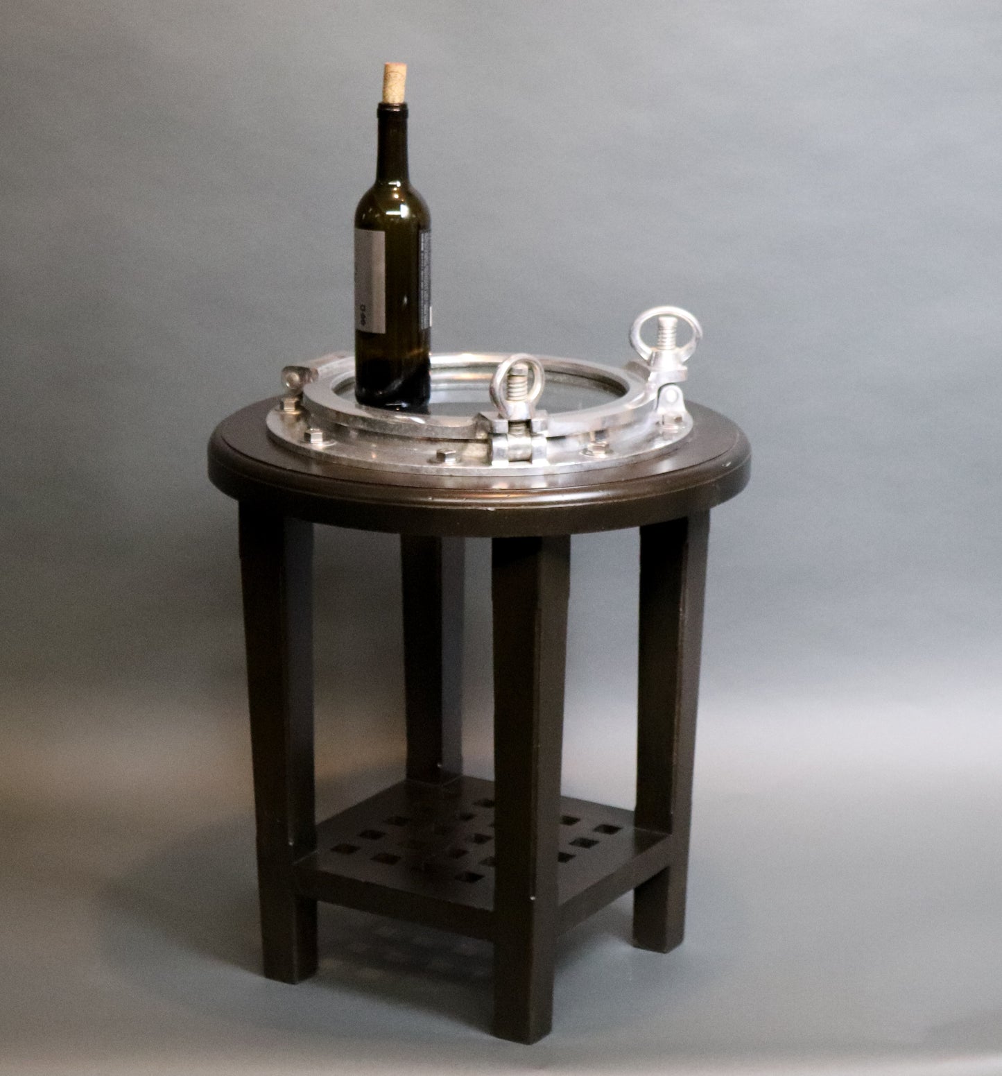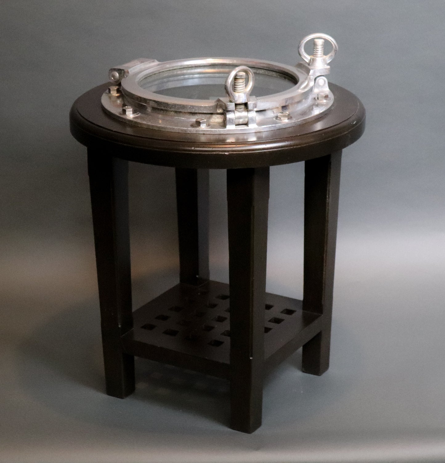 Mahogany cocktail table with authentic aluminum porthole top with glass window. Dark finish. Grating shelf. 24 1/2" high x 22" diameter.
