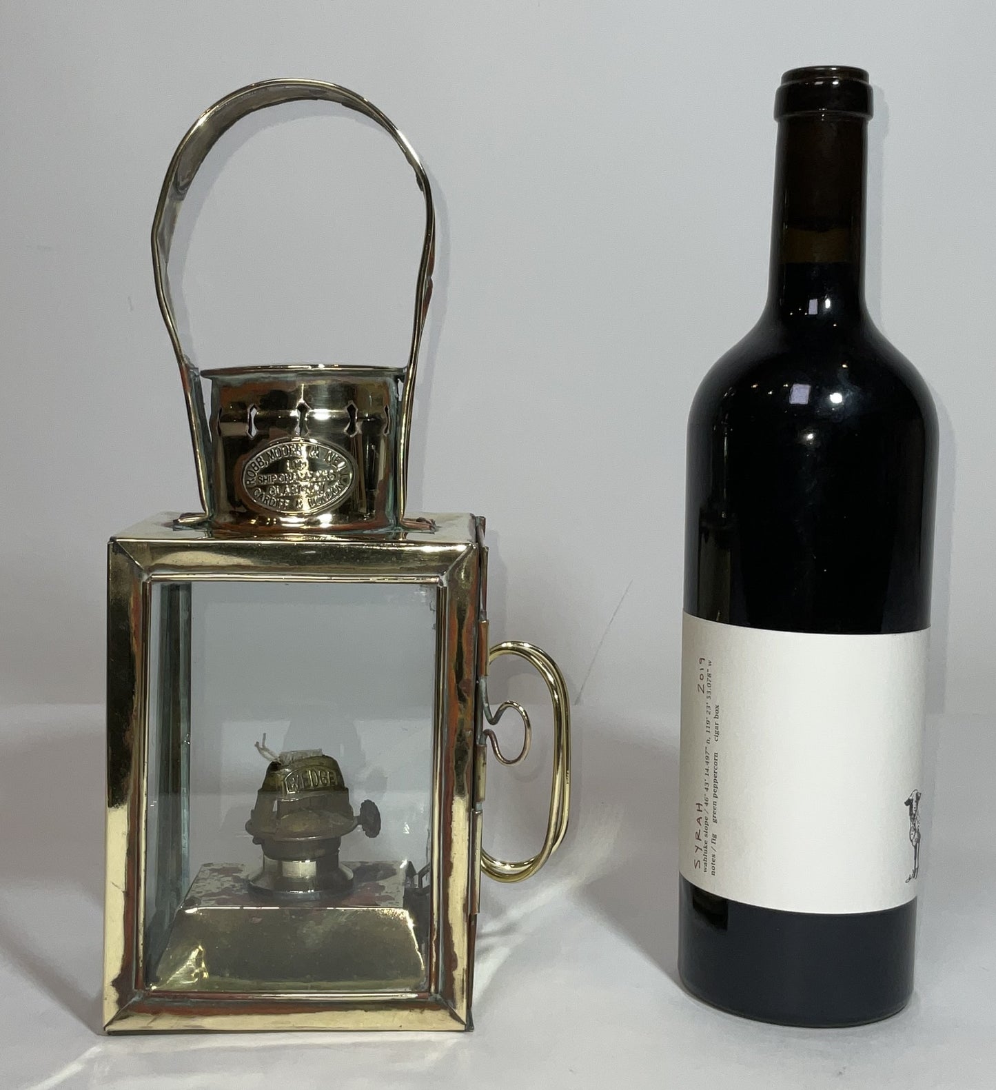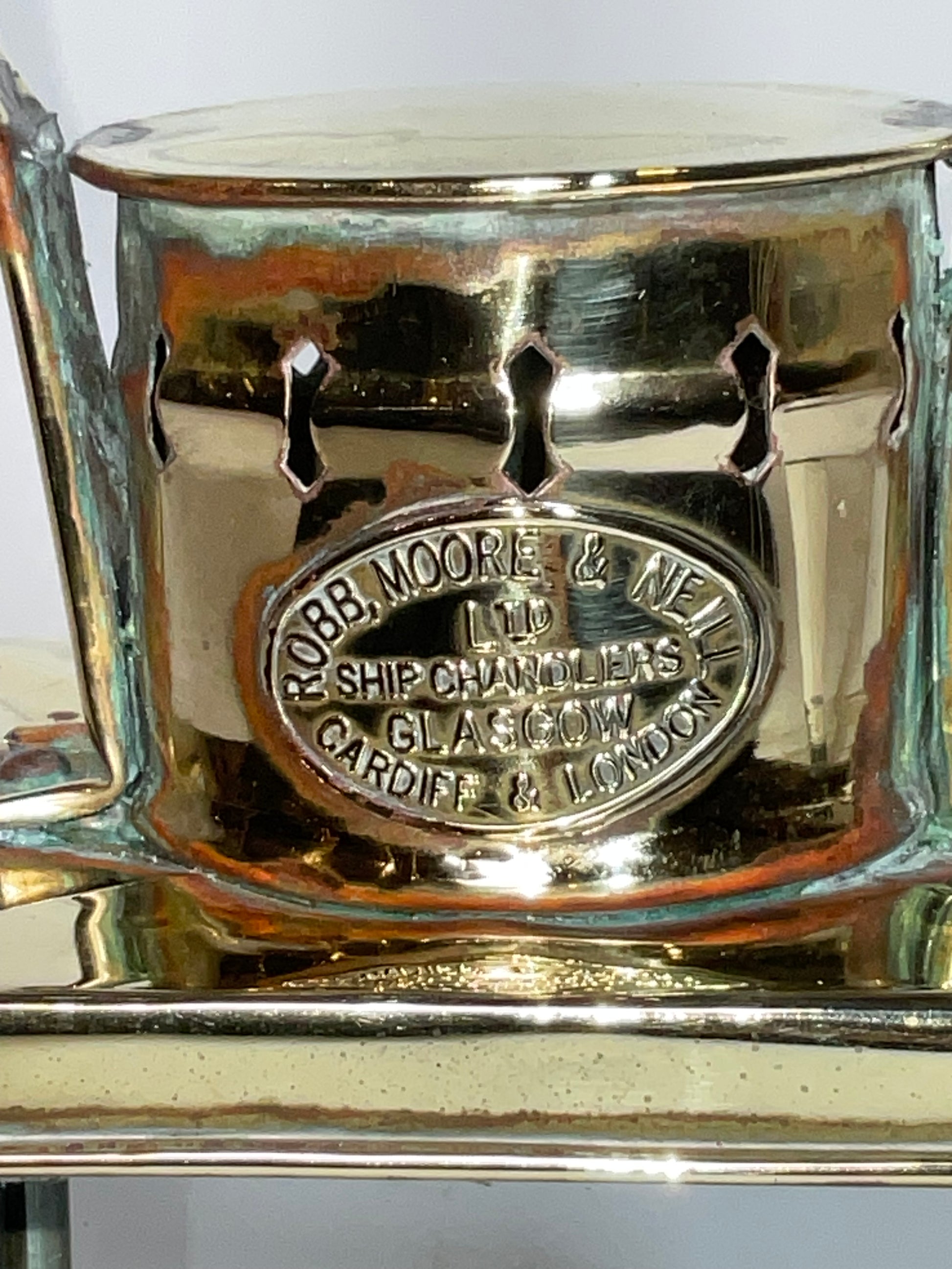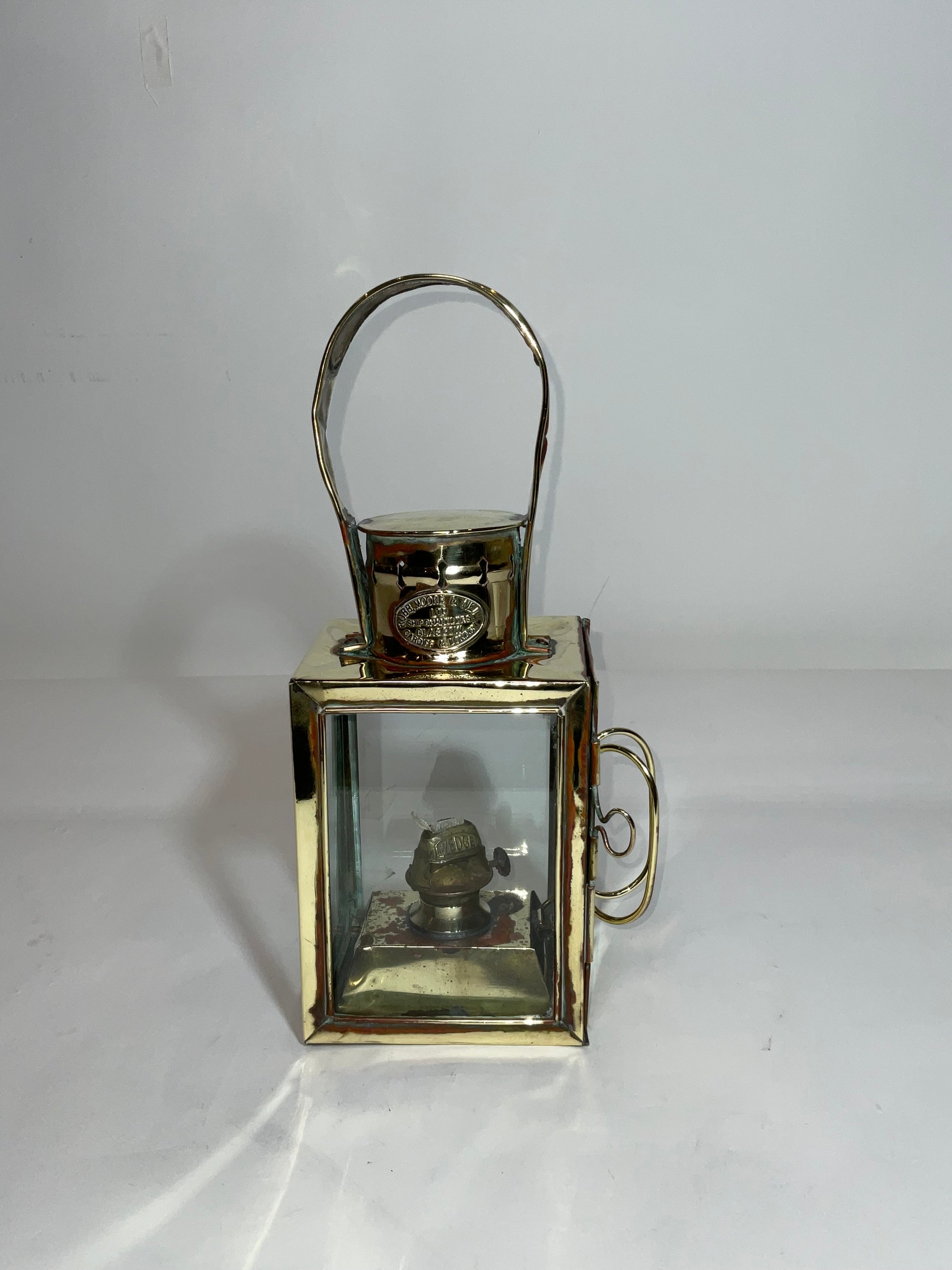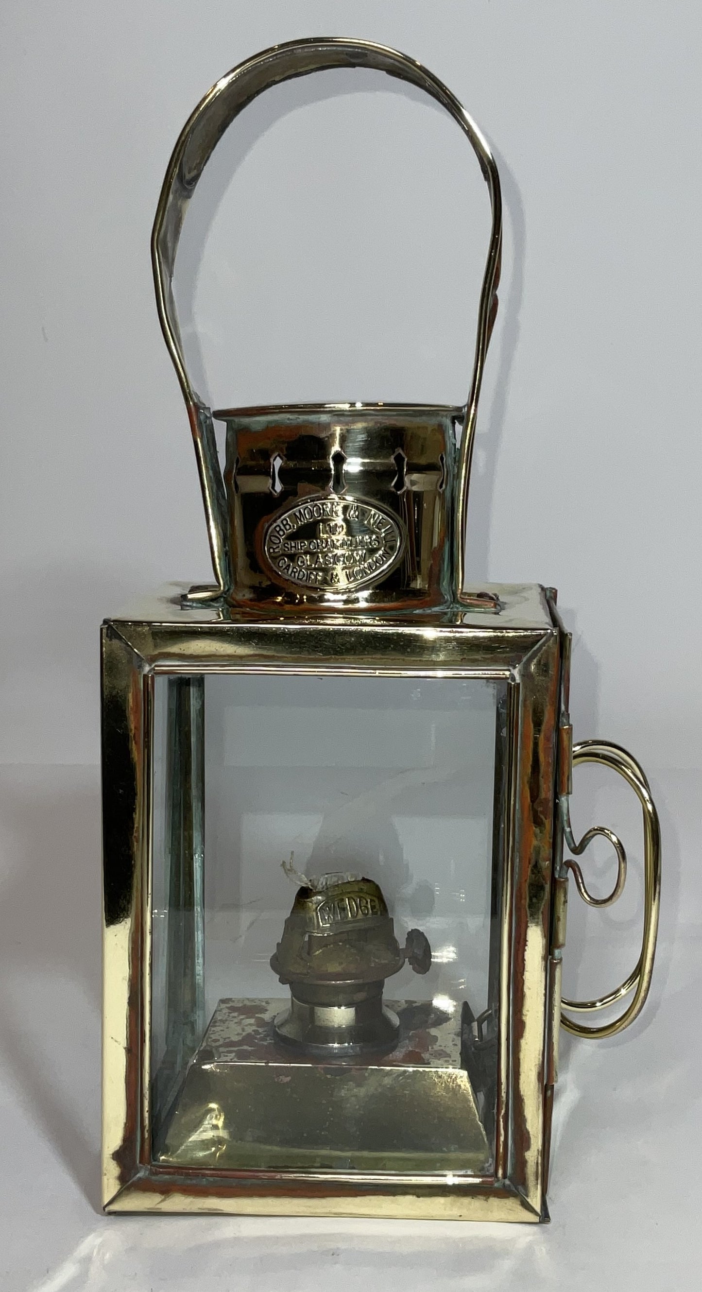 Maritime deck lantern with a brass maker's badge from Robb, Moore & Neill Ltd., ship chandlers, Cardiff, Glasgow, and London. With carry handle, burner, hinged rear door, and three glass panels.