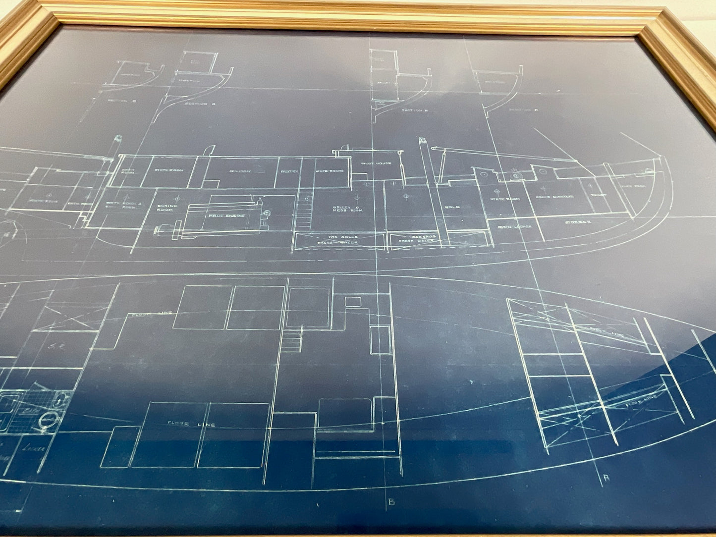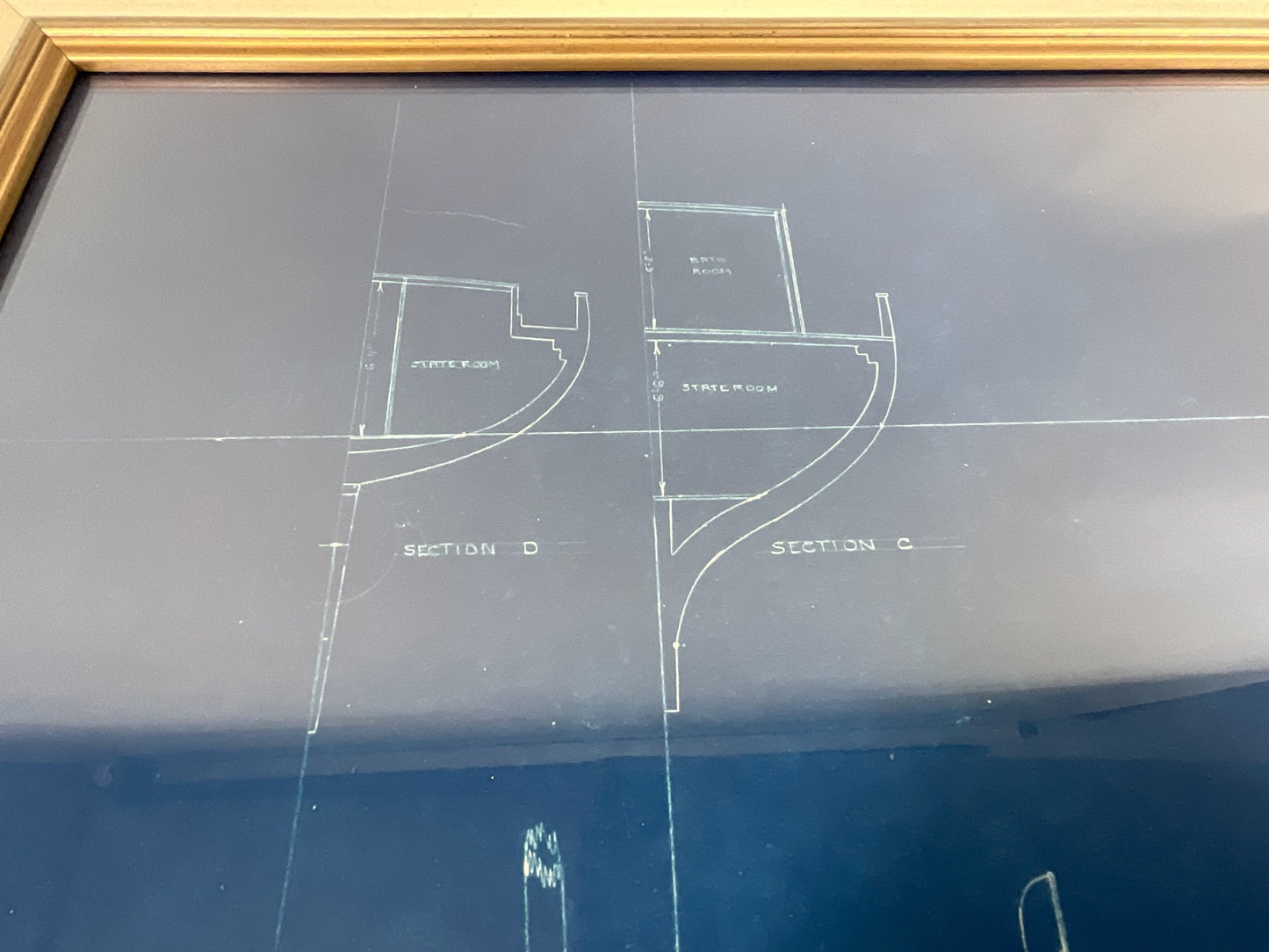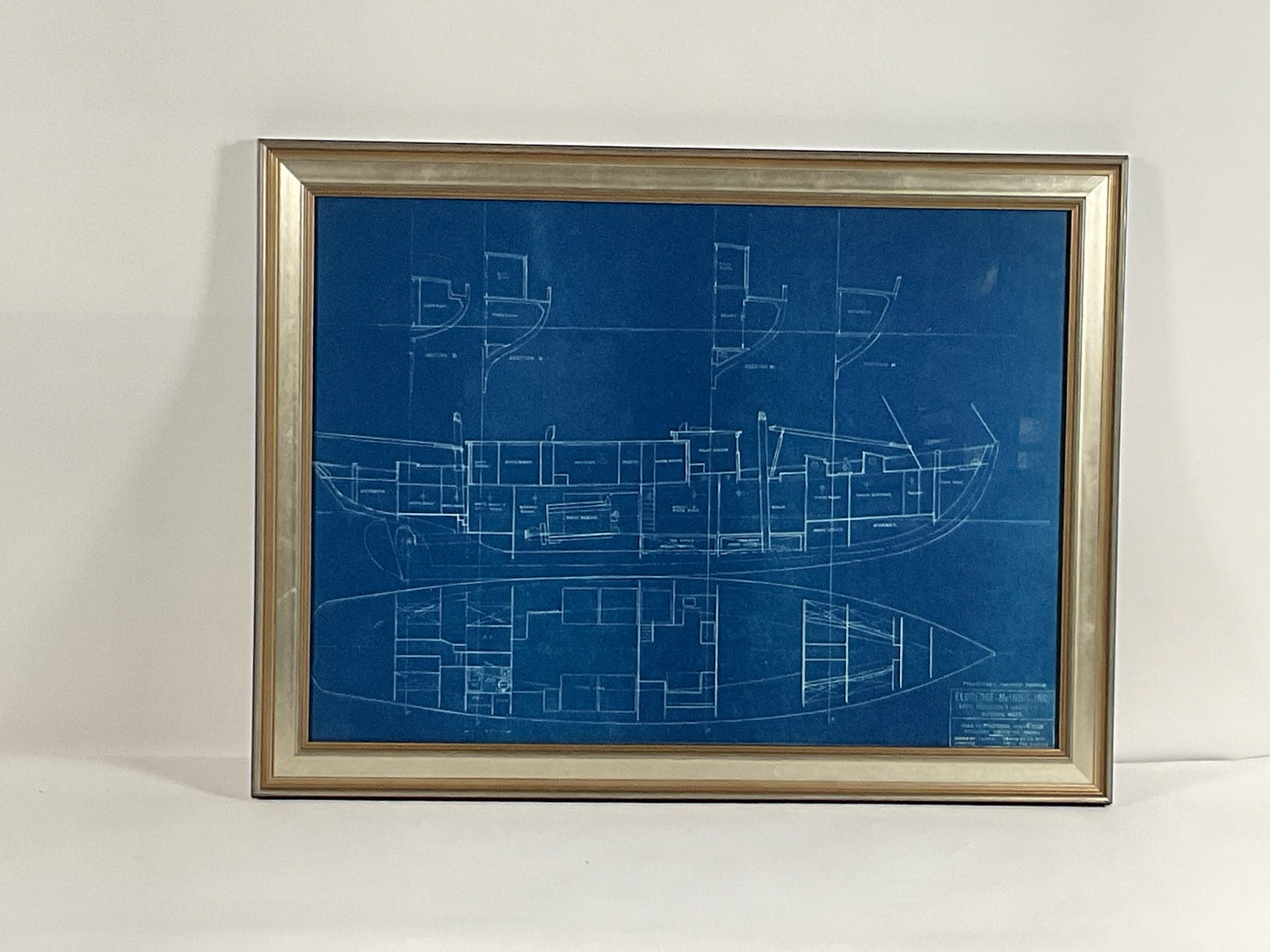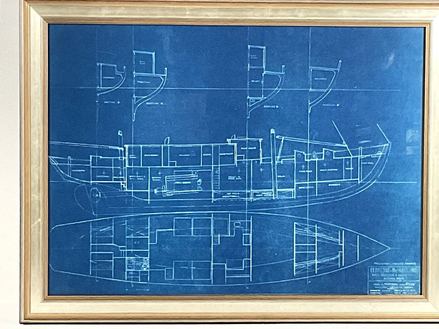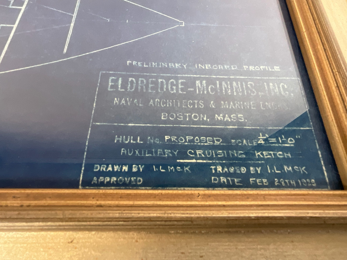 Rare yachting blueprint with legend plate showing the "Inboard Profile Plan of an Auxiliary Cruising Ketch", Eldredge McInnis Inc.. Naval architects and marine engineers, Boston Mass. Hull of proposed ketch scale quarter inch equals one foot. Drawn by I.L. McK, traced by I.L. McK. Dated Feb 28th 1929. The detailed plan shows cabins, galley, pilot house, hold, mess room, engine room, five staterooms, saloon, pantry crews quarters, Lazarette, bathrooms, etc. Also showing hull sections.