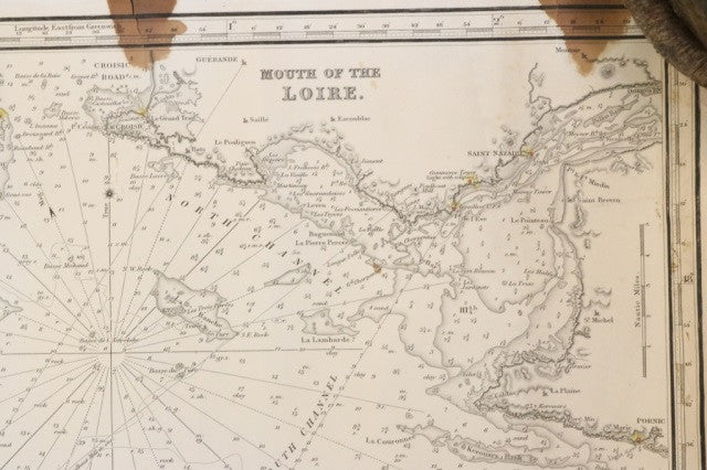 Original J.W. Norie chart of the Bay of Biscay, circa 1855. Chart shows the Atlantic Ocean and coast of France. Details about coast include Bordeaux, Rochfort, Nantes, Bay of Brest, Brest, and many more. Chart shows mouth of the Loire, entrance to Rochelle & Rochfort, River Gironde, Saint and the Passage du Raz, and Saint Vincent Channel. Water depth, bays, rivers and other details included on the chart. With stains. Unframed, matted to blue paper.