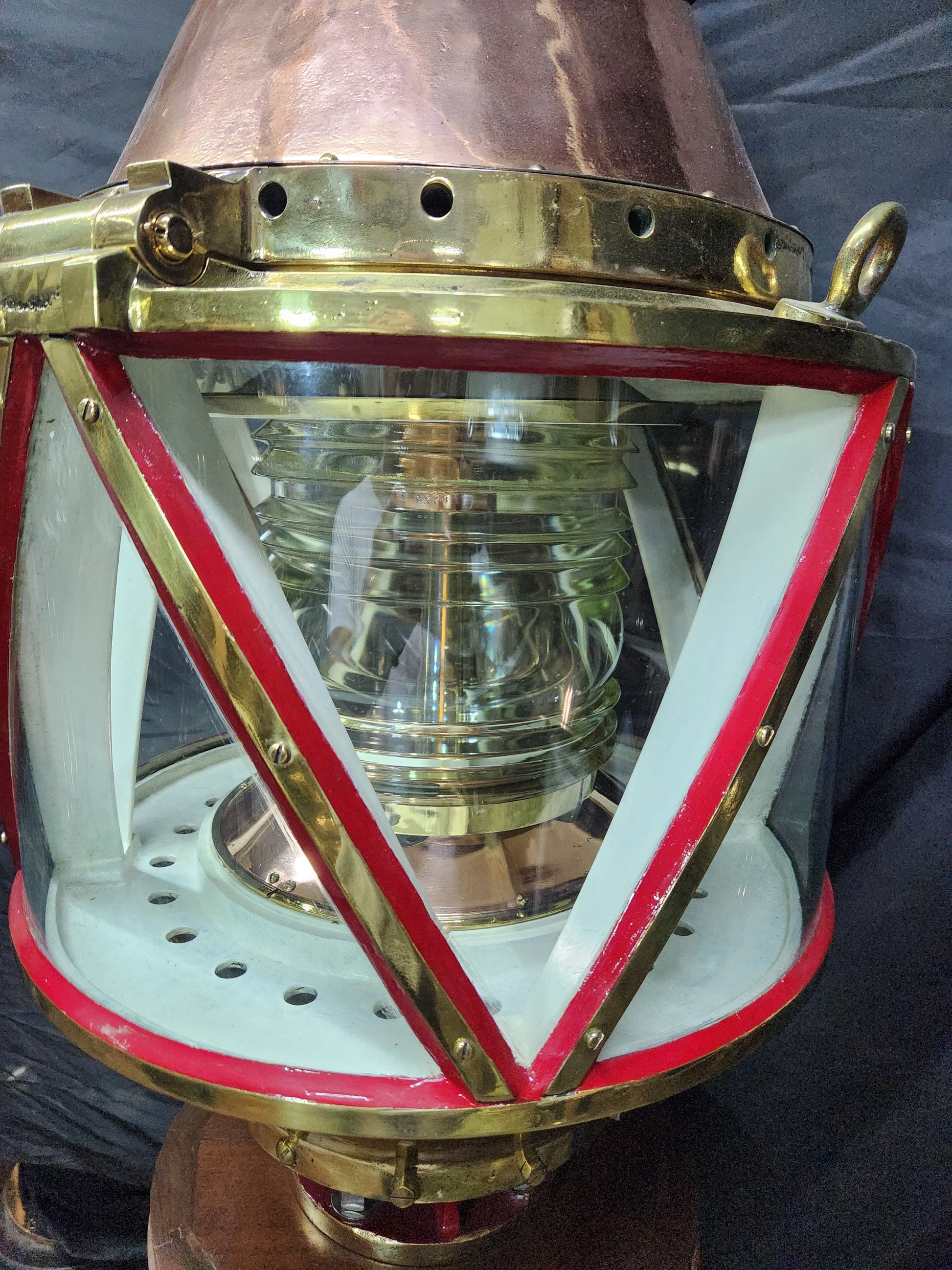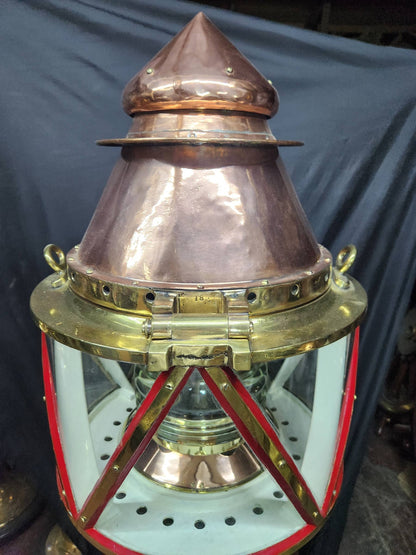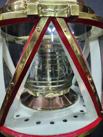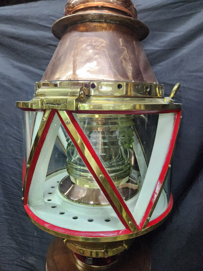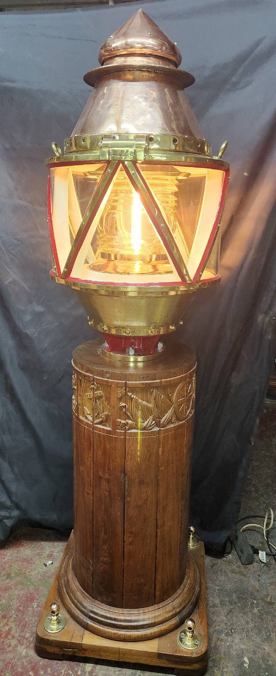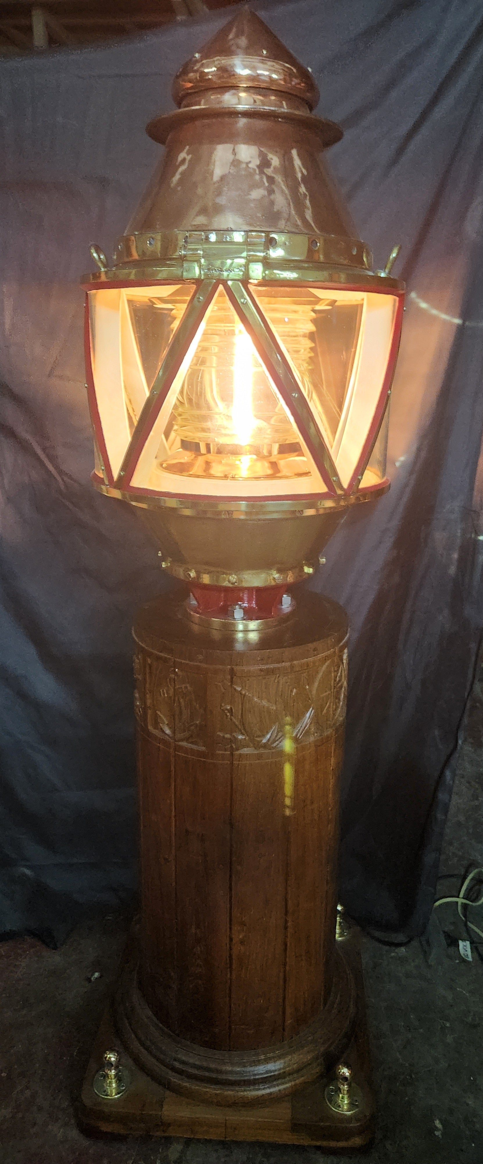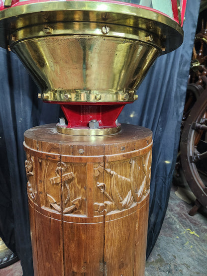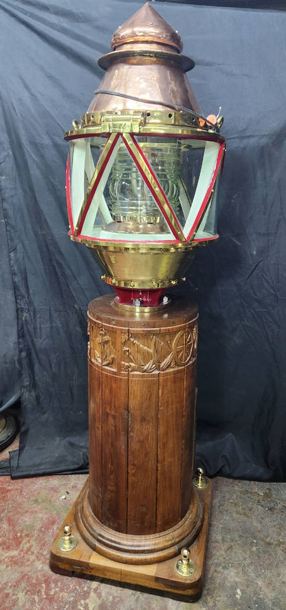 Giant copper and brass marine beacon with Fresnel lens. Highly polished copper case with brass bezel, hinge, base mount and trim. The Fresnel lens sets on a brass bezel. Hinged and vented top. This beacon is mounted to a custom mahogany plinth that was once ships binnacle base. Deeply incised carvings of anchors, masts, sails, badges, etc.. The base is fitted with substantial brass mounting hardware.