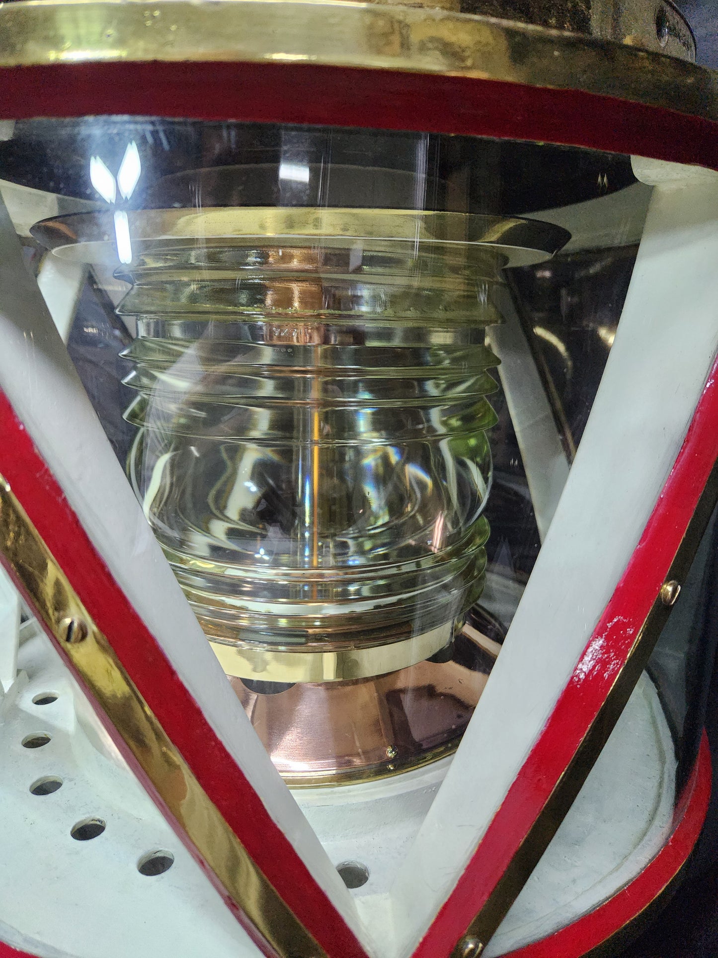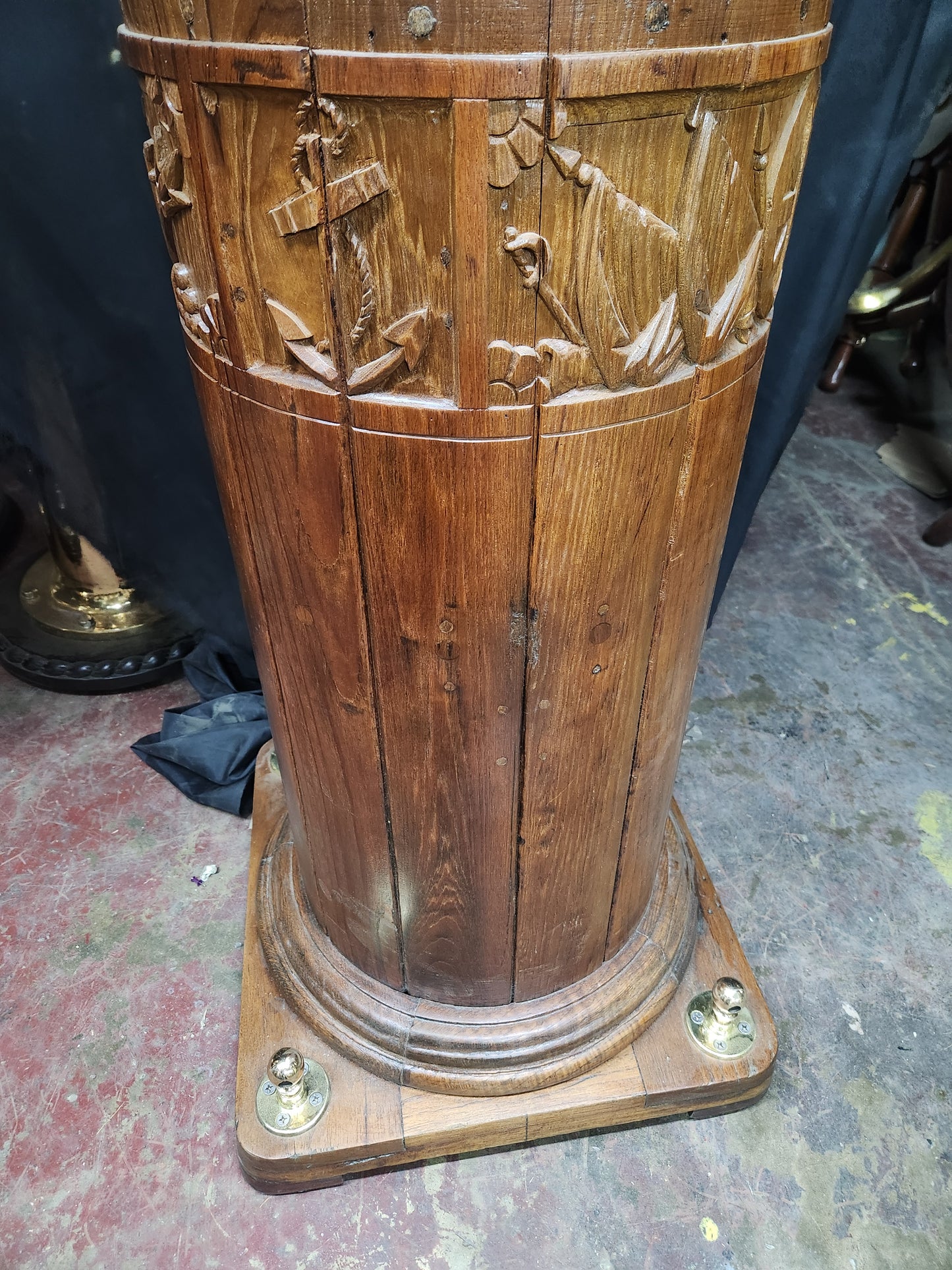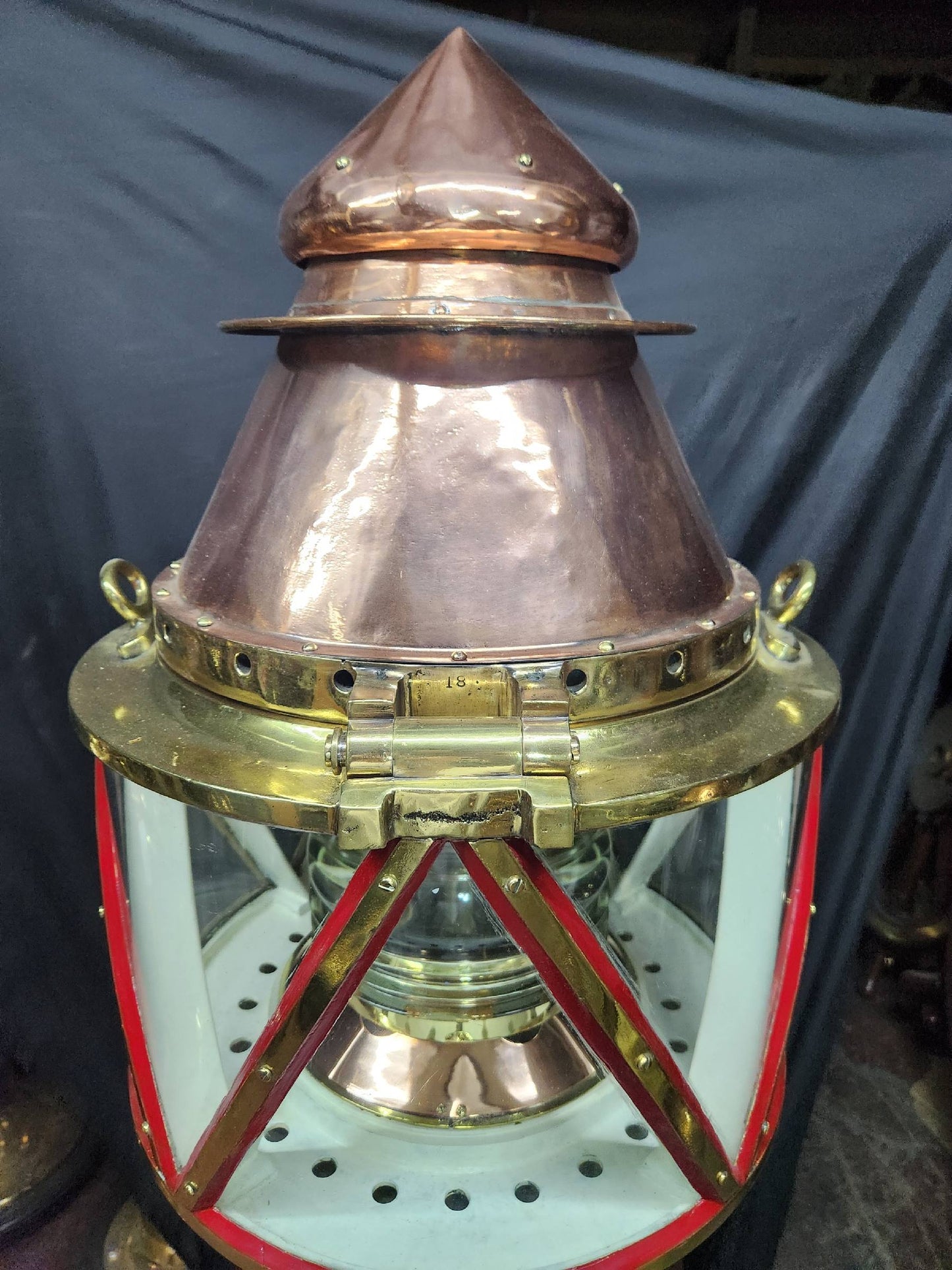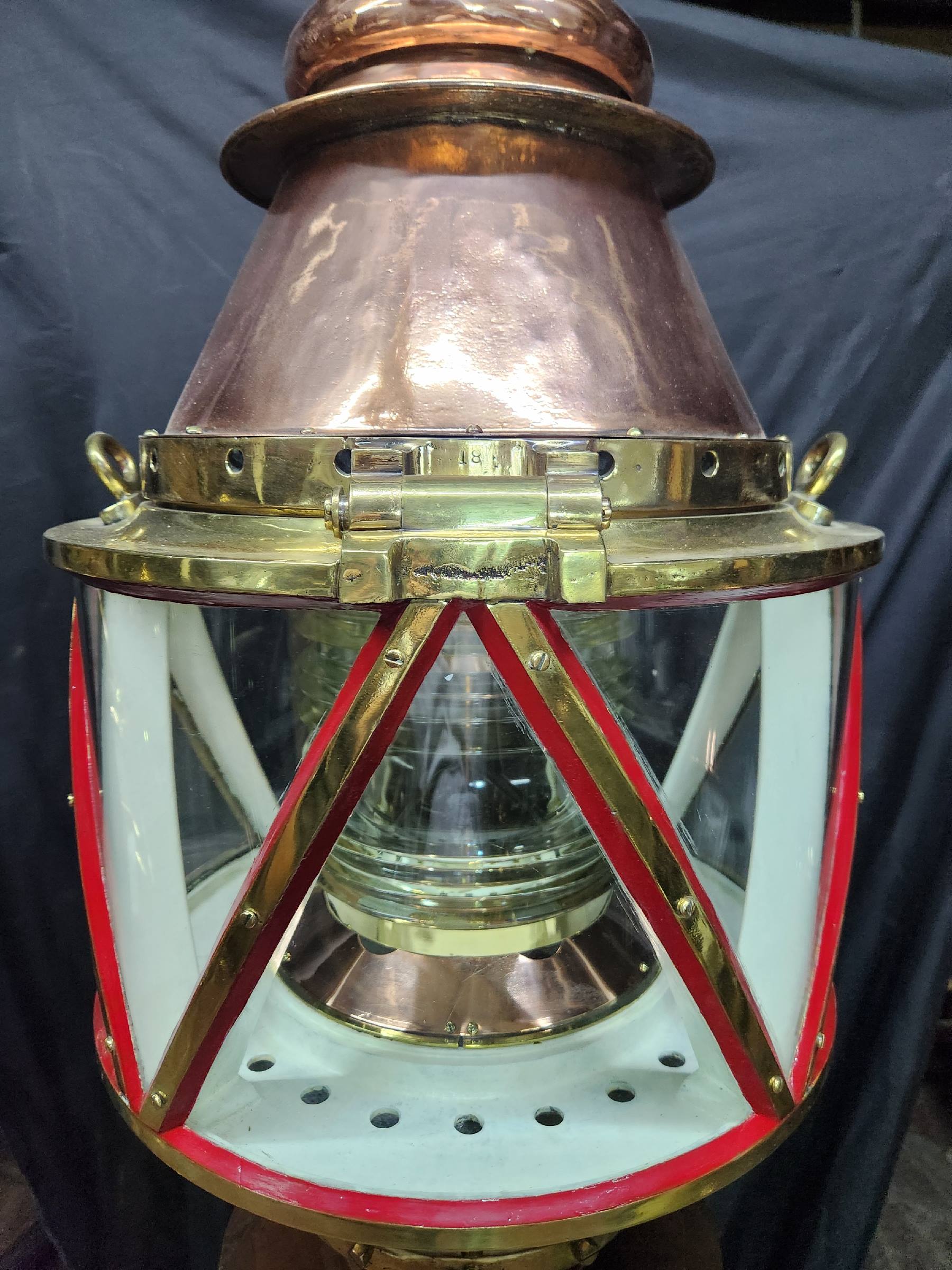 Giant copper and brass marine beacon with Fresnel lens. Highly polished copper case with brass bezel, hinge, base mount and trim. The Fresnel lens sets on a brass bezel. Hinged and vented top. This beacon is mounted to a custom mahogany plinth that was once ships binnacle base. Deeply incised carvings of anchors, masts, sails, badges, etc.. The base is fitted with substantial brass mounting hardware.