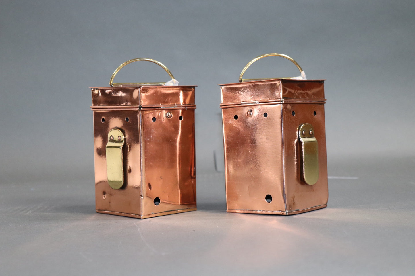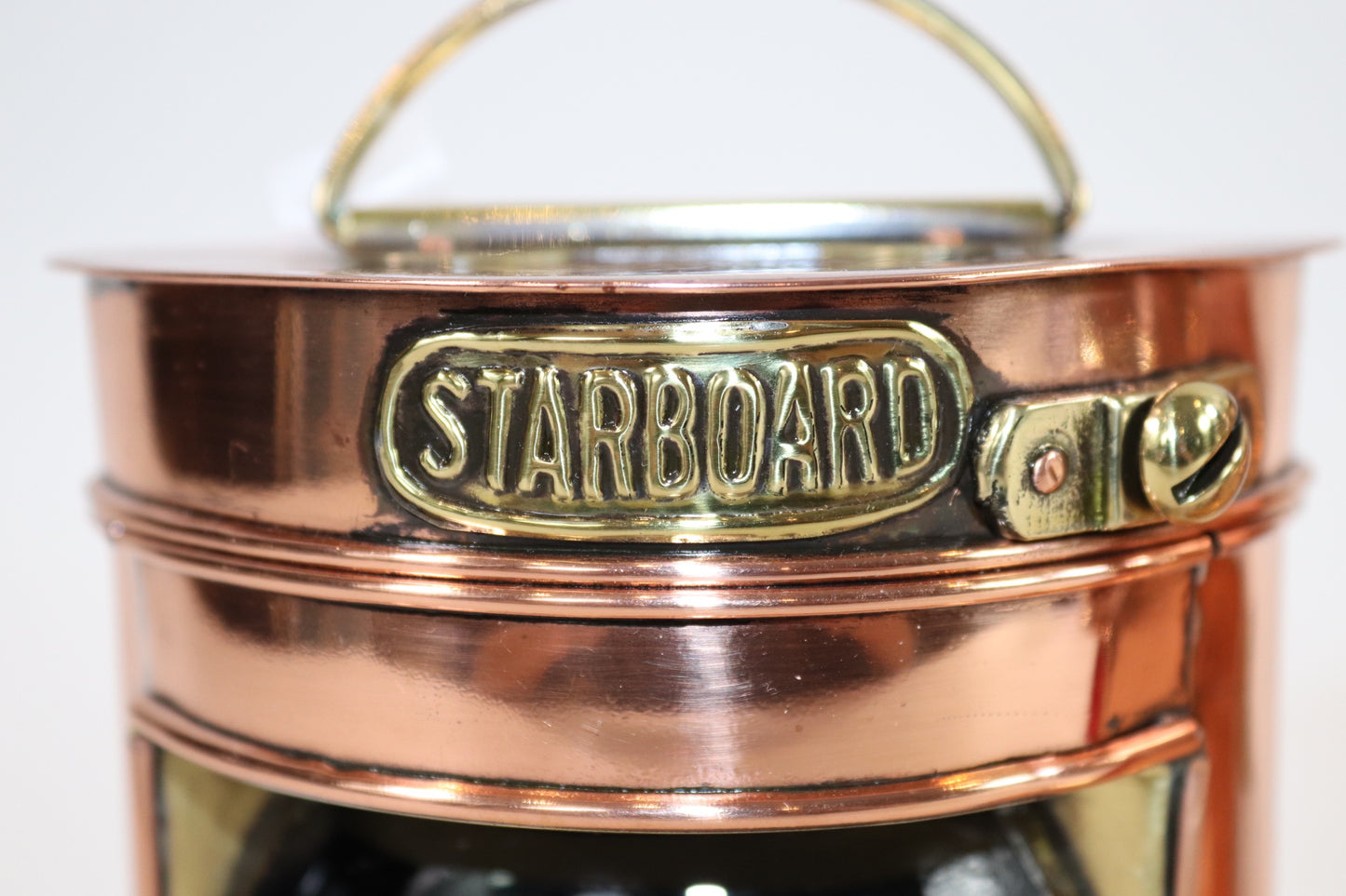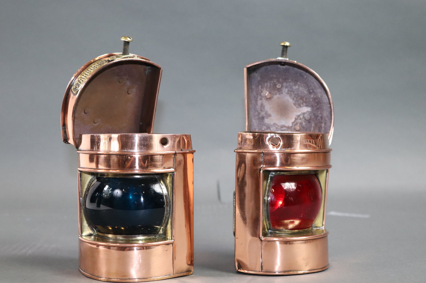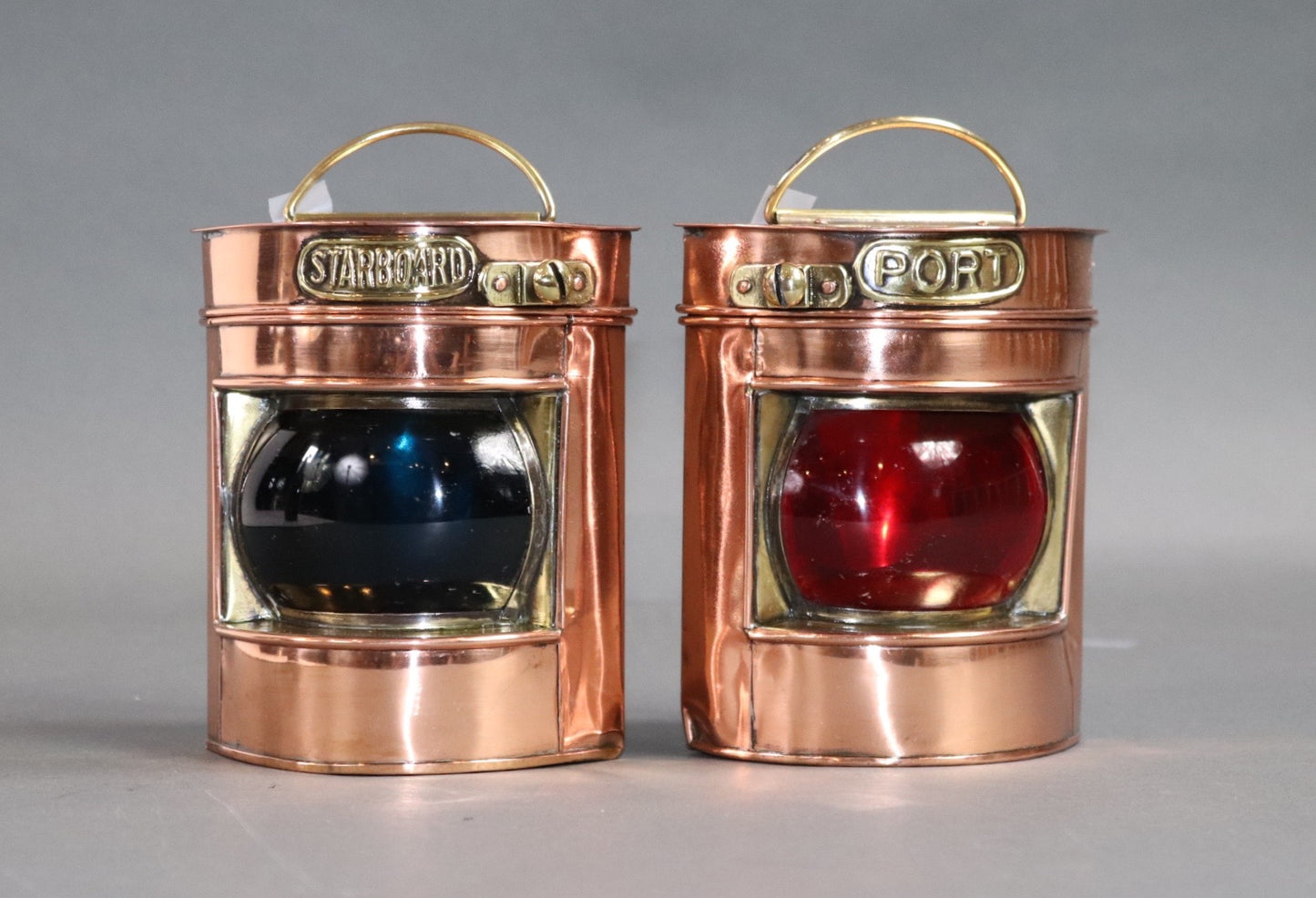 Pair of polished copper port and starboard lanterns with brass name tags for port and starboard and brass carry handles. Fitted with old electric sockets. Weight is 2 pounds for the pair.