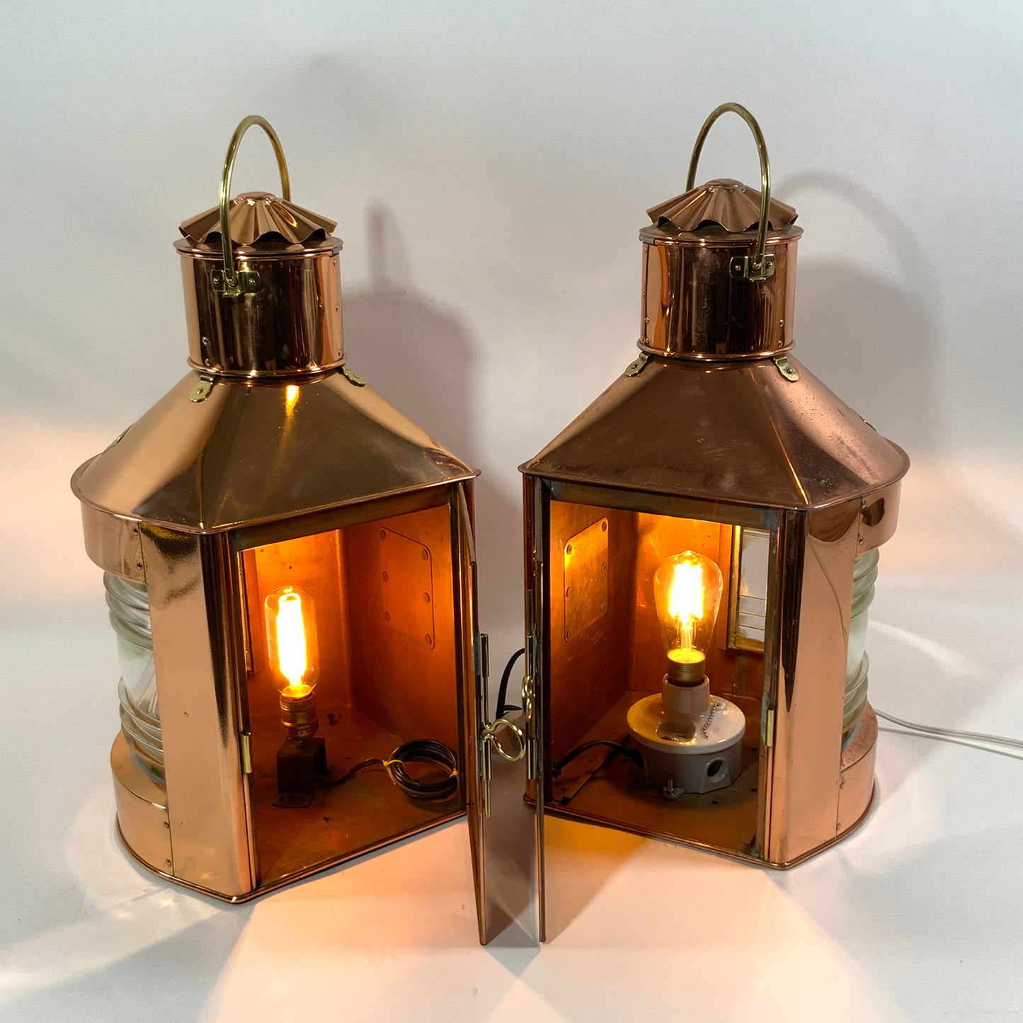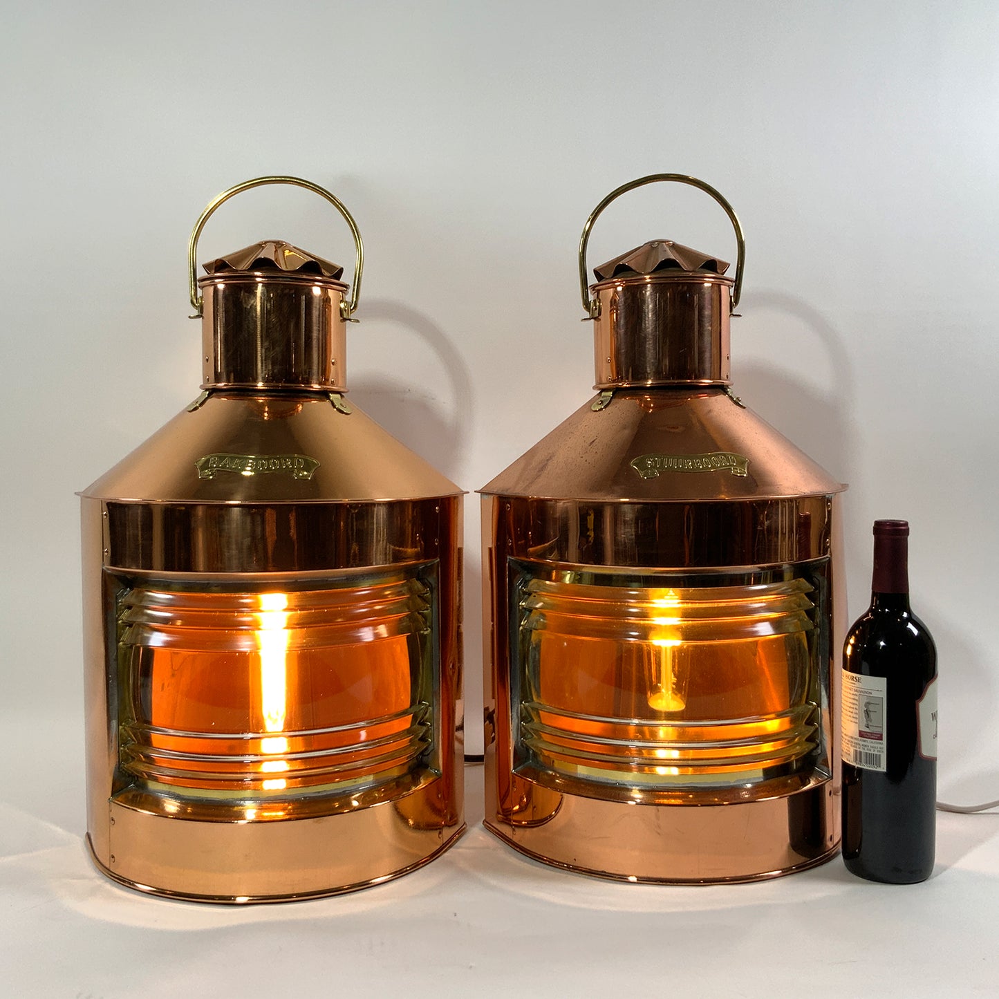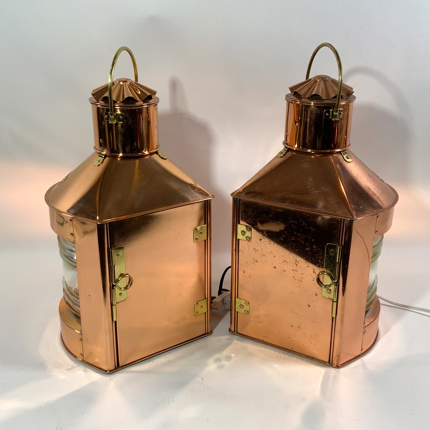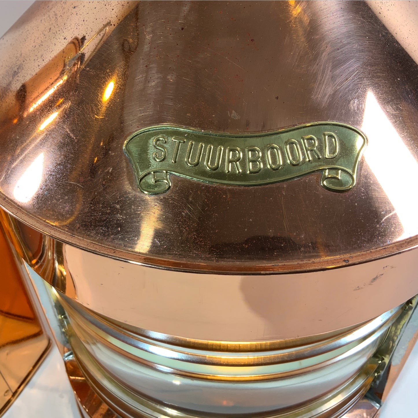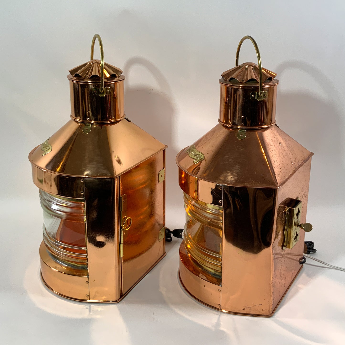 Highly polished ships lanterns with Fresnel glass lenses. Vented tops with fluted chimney and brass carry handles. Fitted with brass "Stuurboord" en "Bakboord" badges on the lantern cases. Wired for home use. Circa 1950.