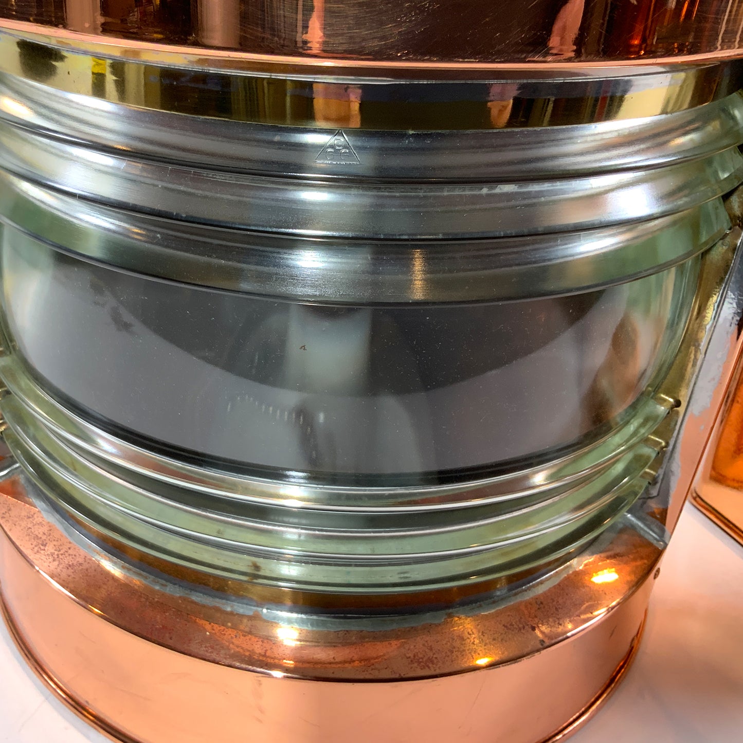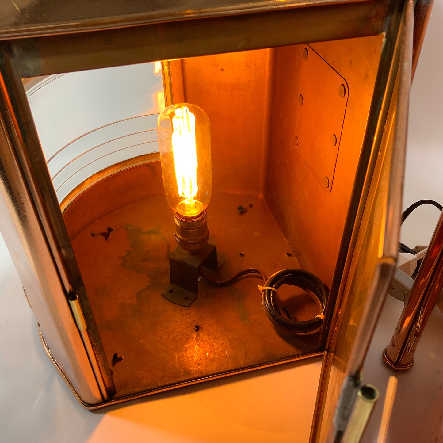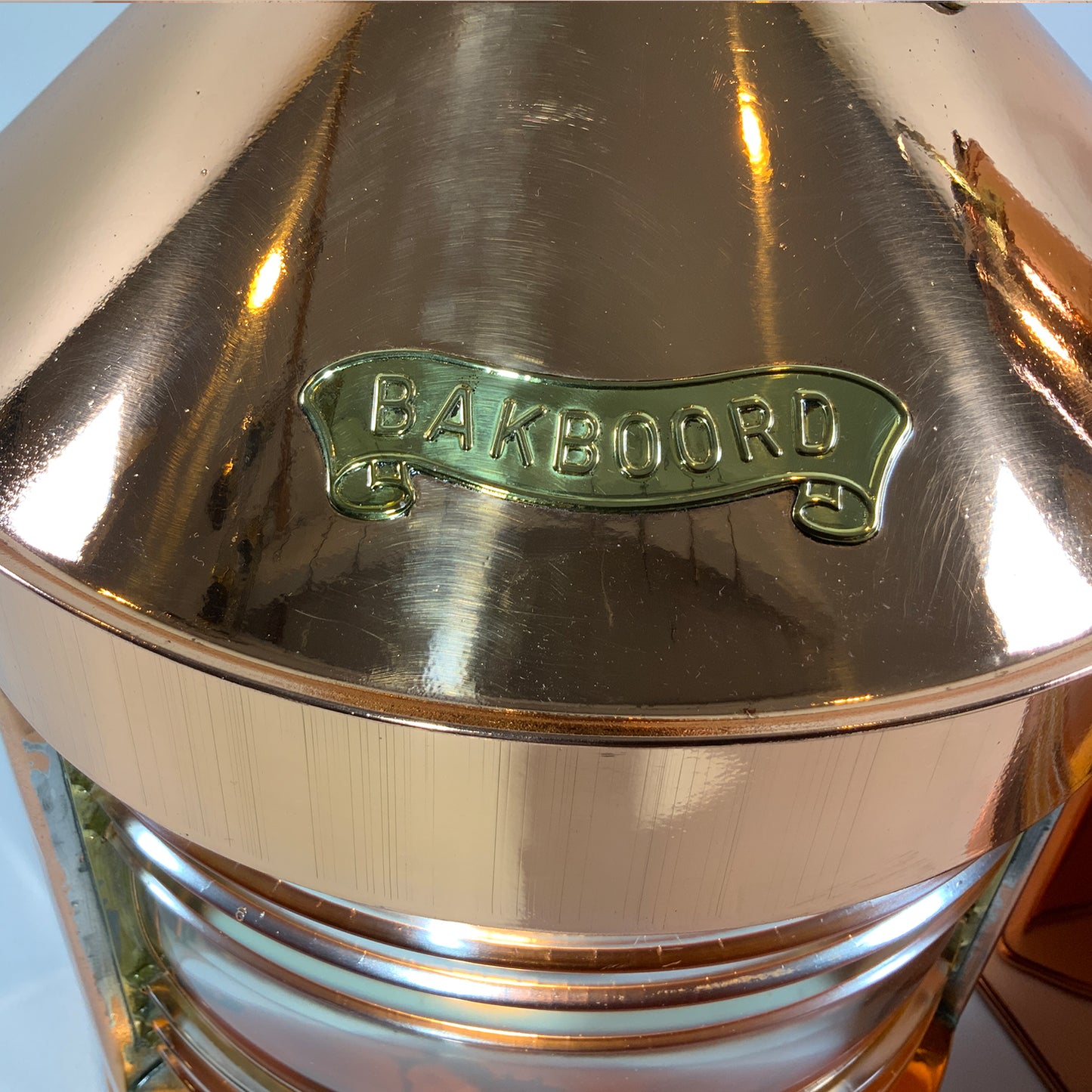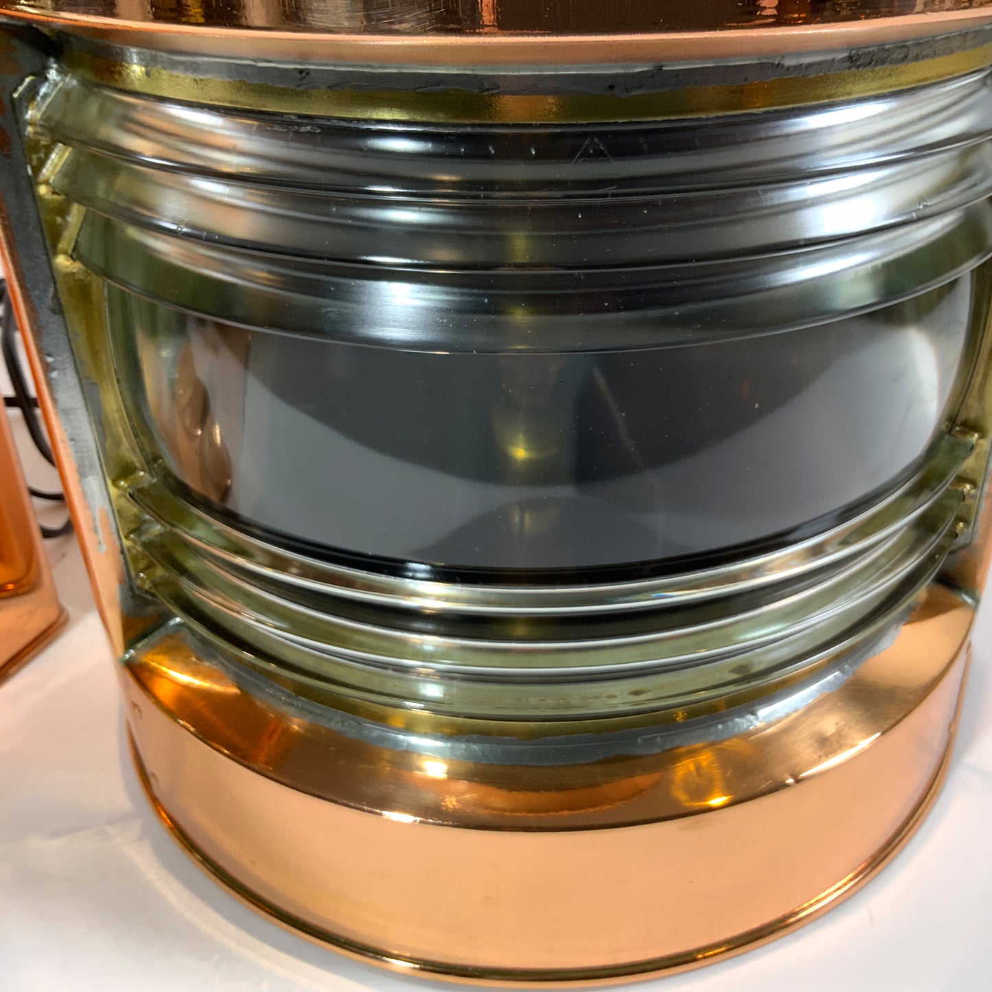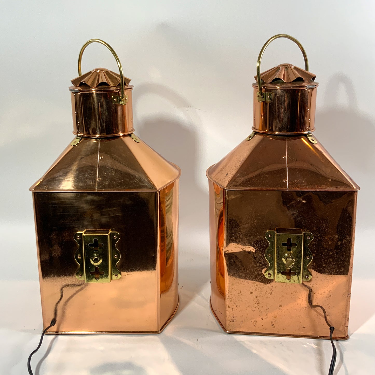 Highly polished ships lanterns with Fresnel glass lenses. Vented tops with fluted chimney and brass carry handles. Fitted with brass "Stuurboord" en "Bakboord" badges on the lantern cases. Wired for home use. Circa 1950.