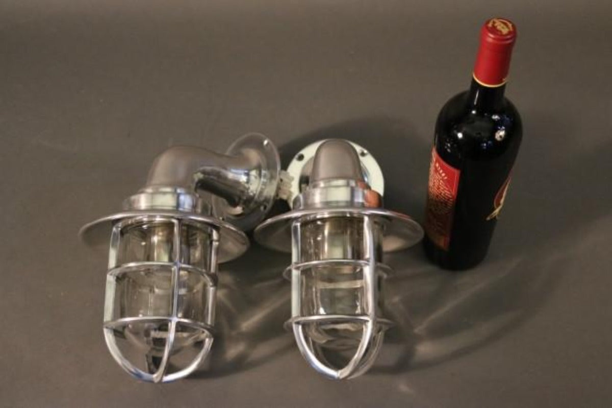 Two solid polished aluminum ships lights with hoods, protective cages, glass jars, and etc. Dimensions: 7" L x 8" W x 10" H Weight: 7lbs (pair)