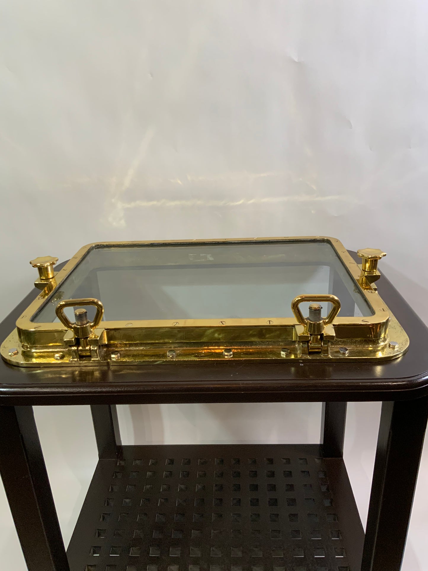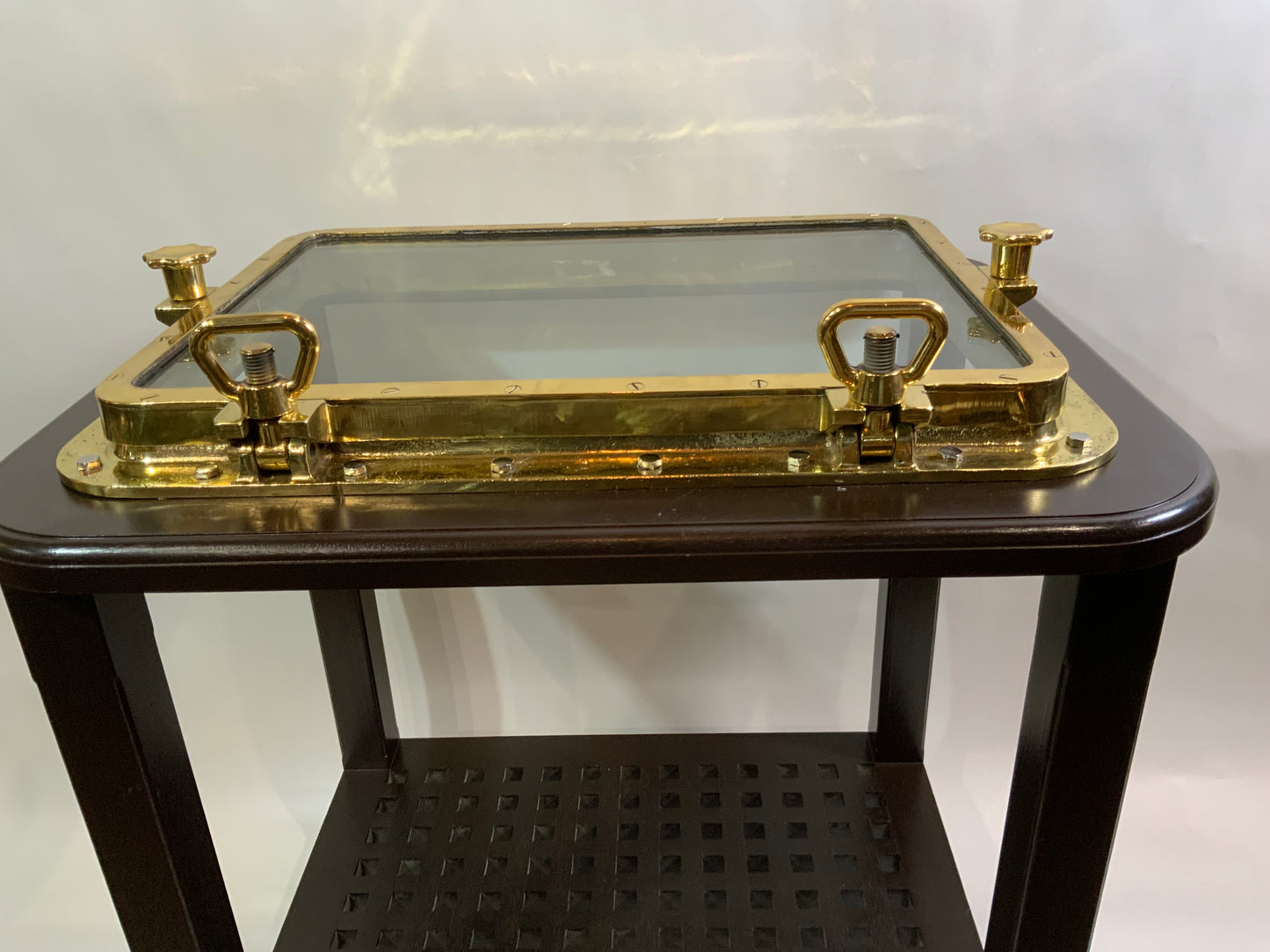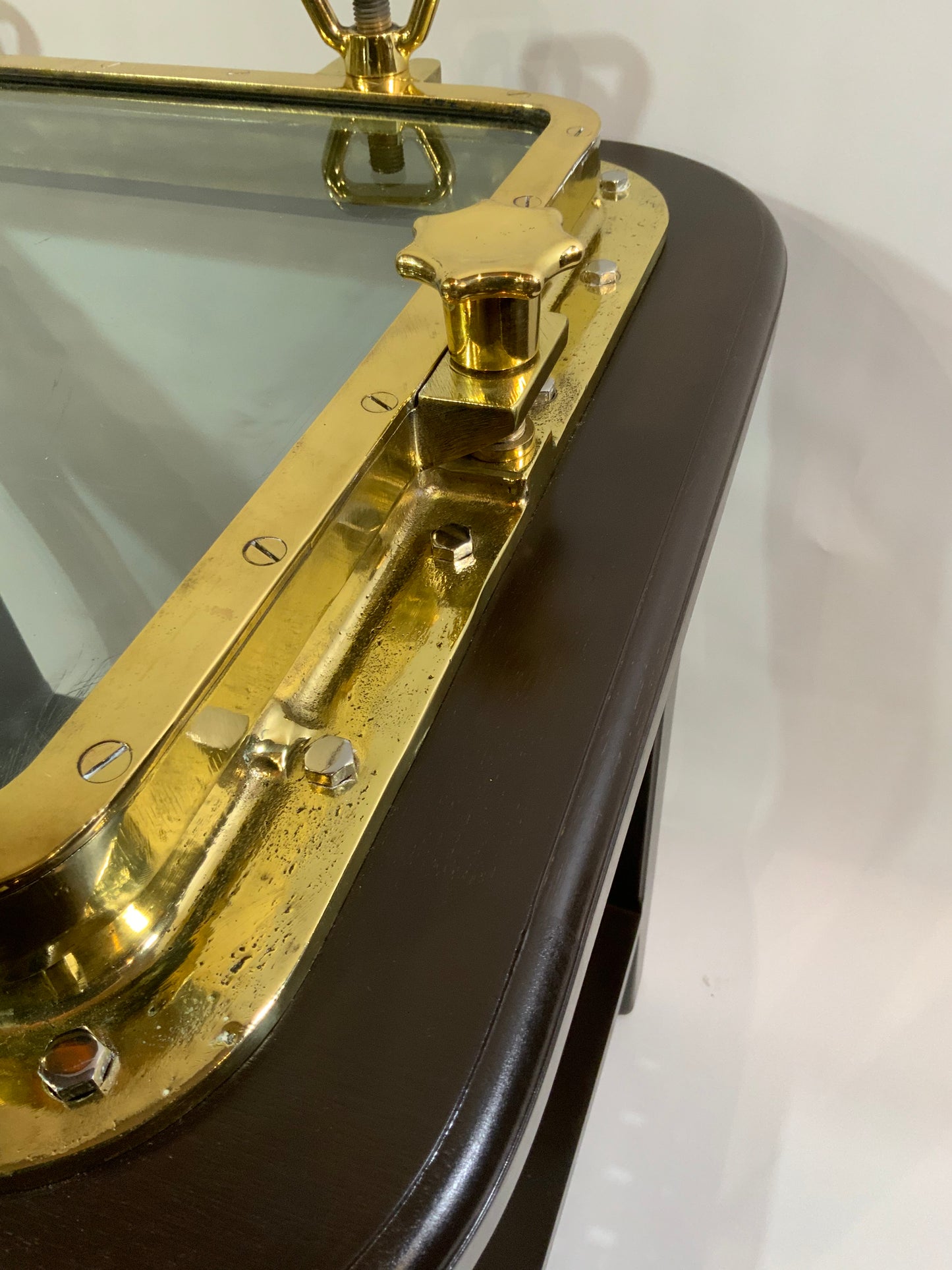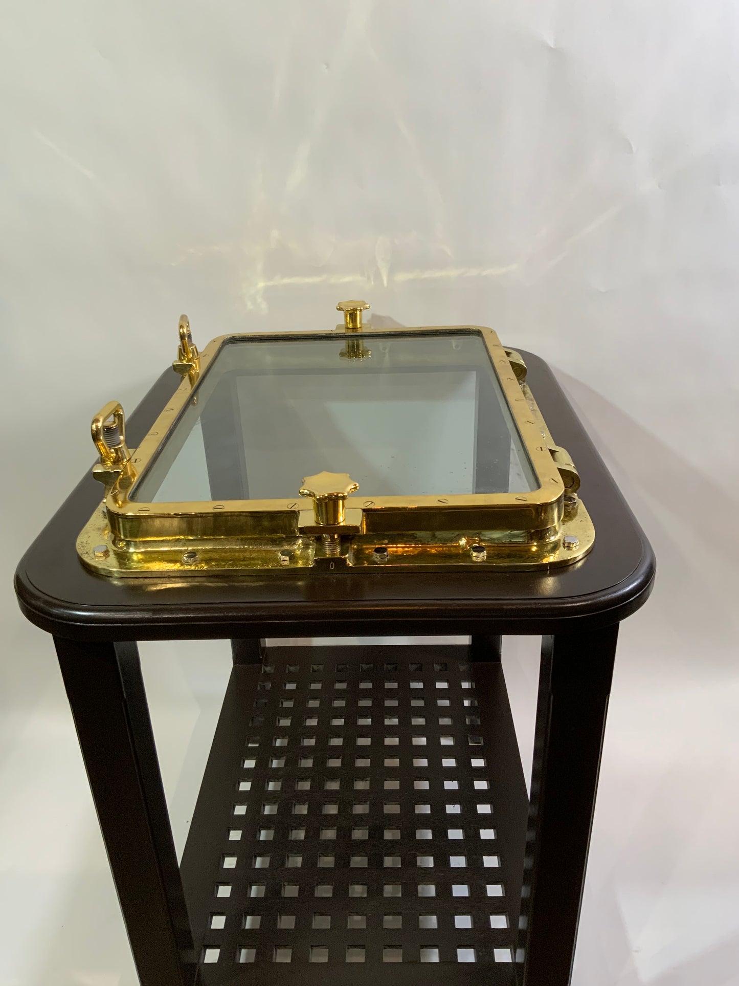 Massive ships porthole that has been meticulously polished and lacquered. Hinged top. Bolted to a mahogany table at Bistro Height. There is a lower shelf in the form of a ships grating.