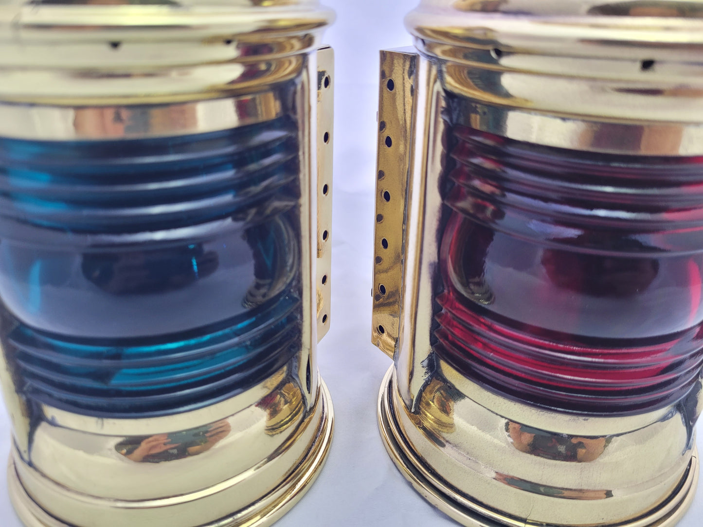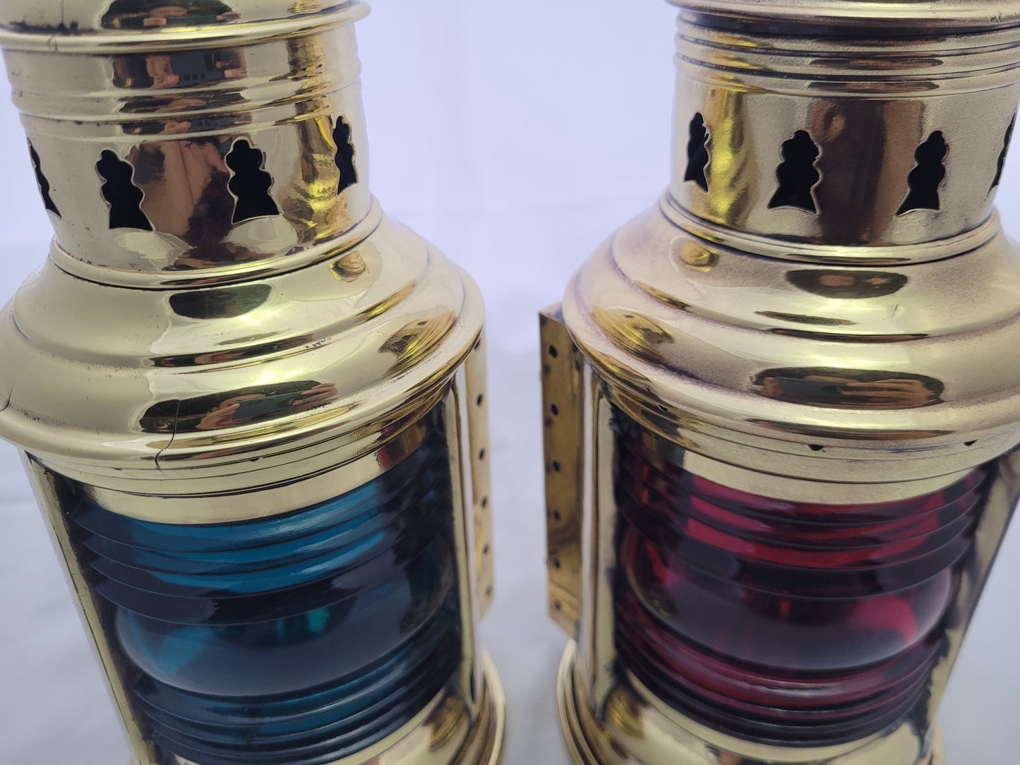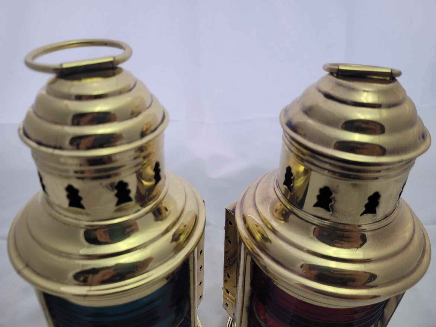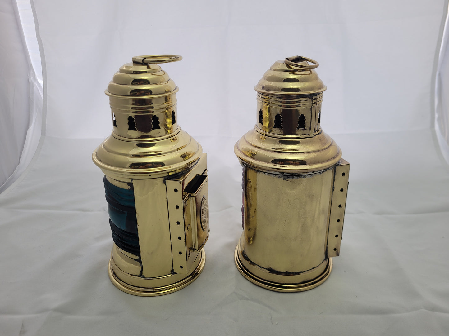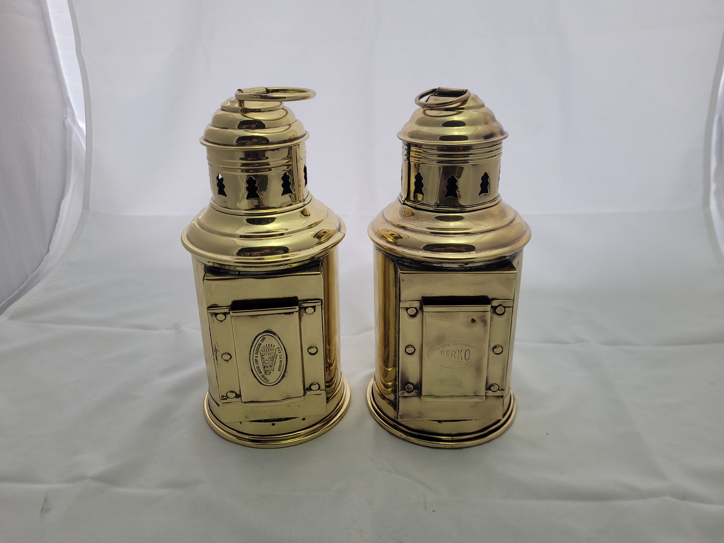 Pair of yacht lanterns with red and green Fresnel glass lenses. The brass has been meticulously polished and lacquered. With oil tanks inside. The lanterns are marked with makers name Perkins Marine Lamp Corporation "PERKO" of Brooklyn, New York. Early twentieth Century. awesome pair of antique ships lanterns