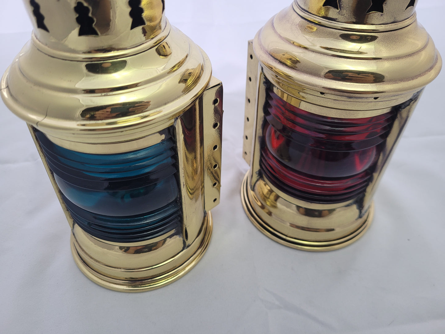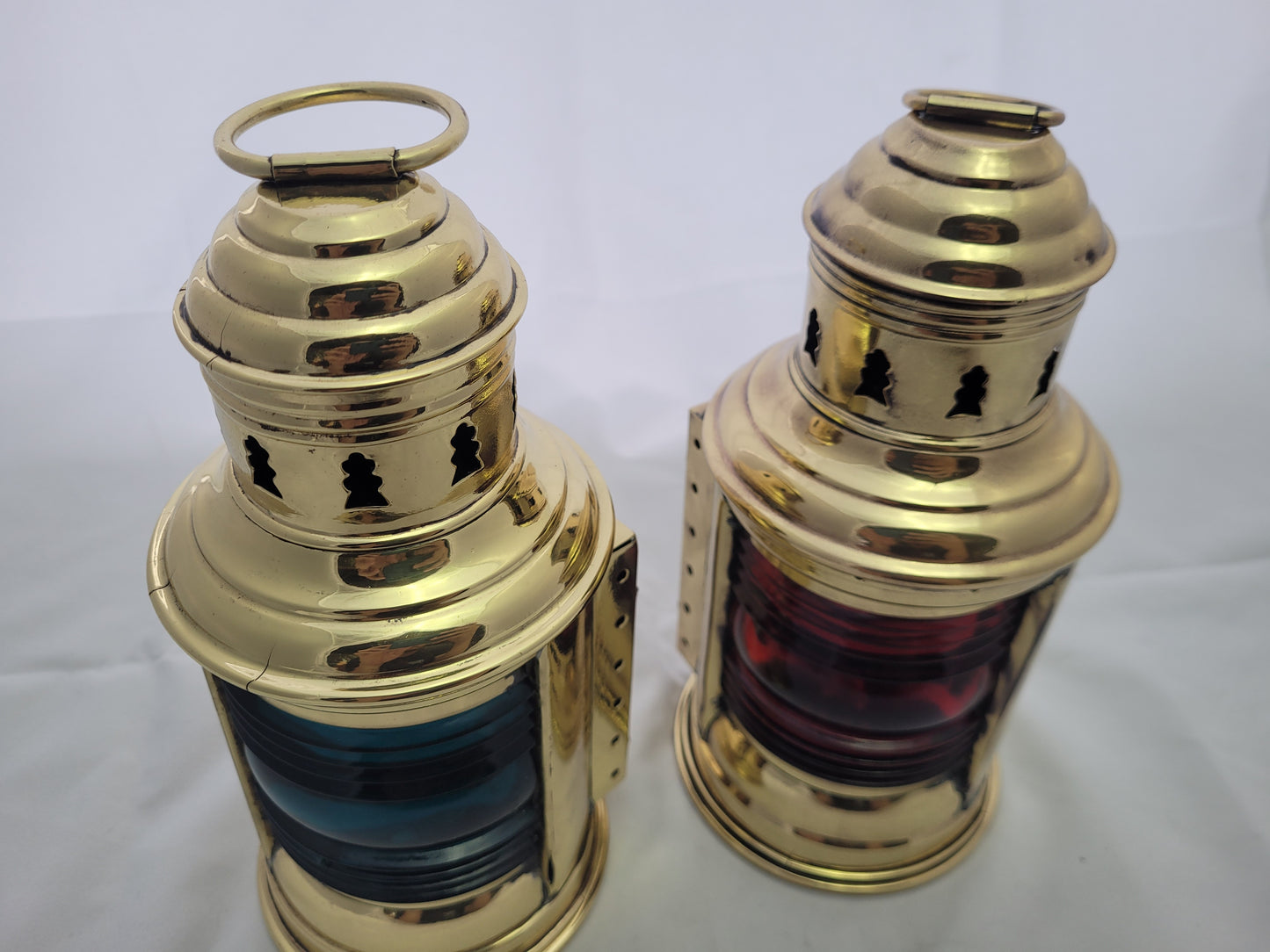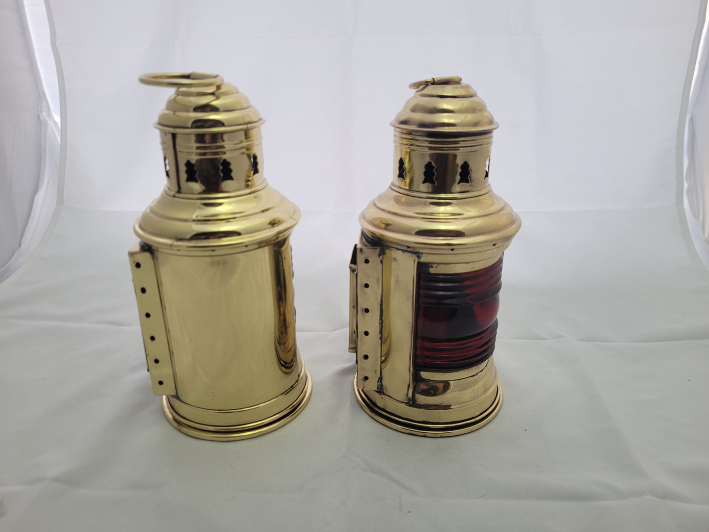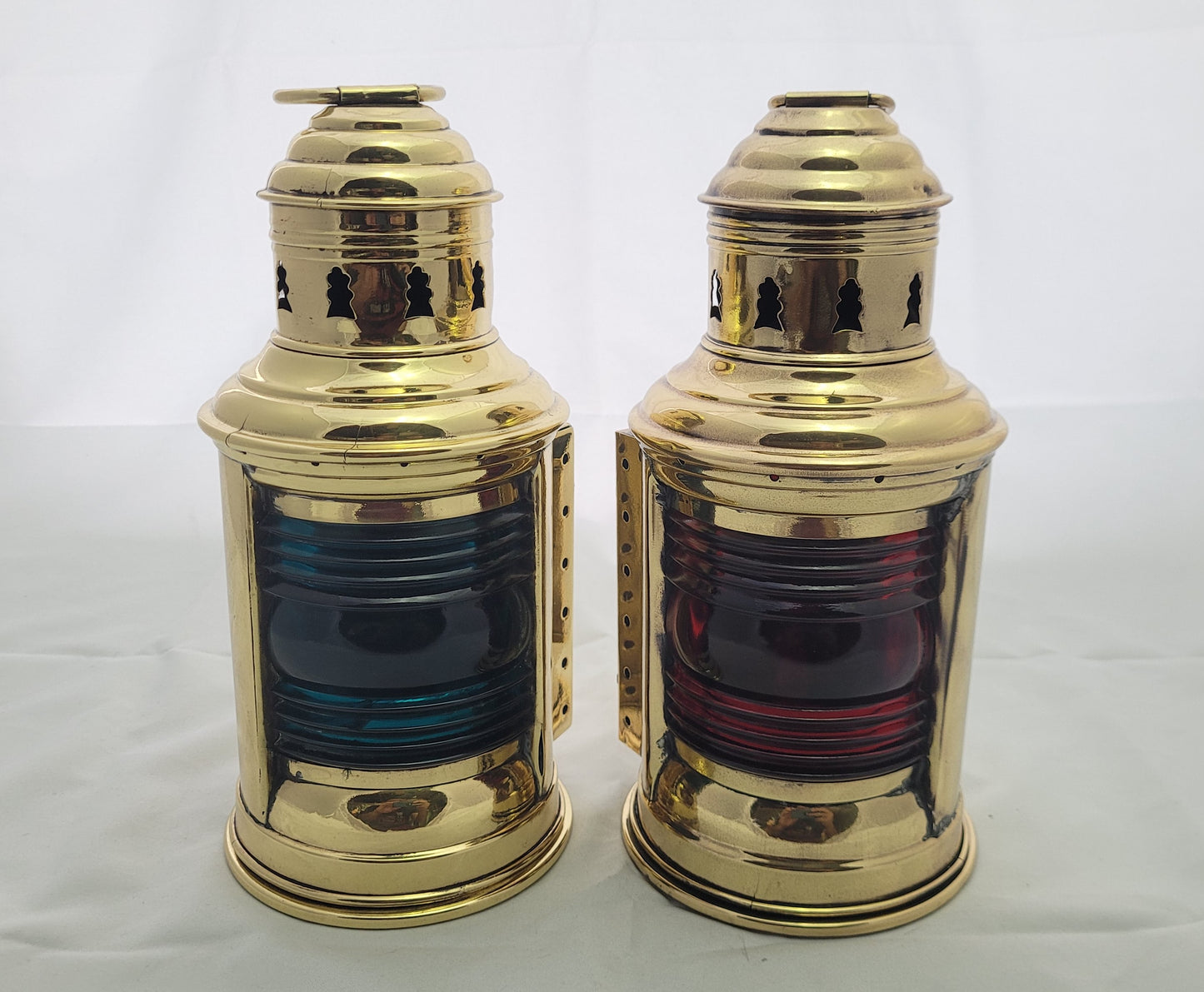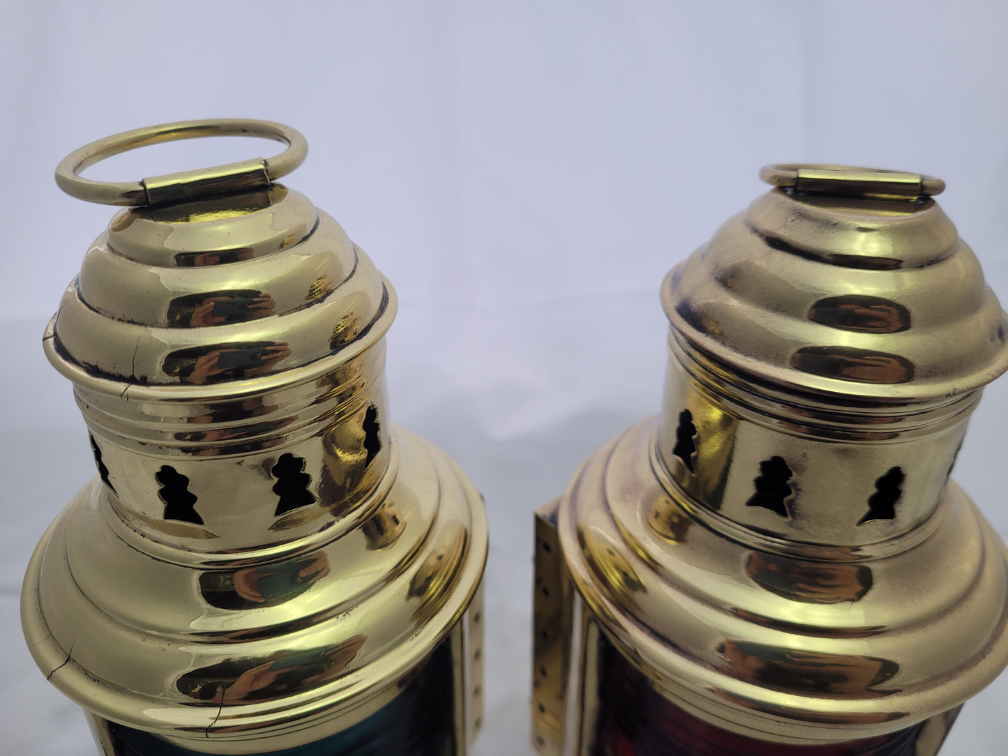 Pair of yacht lanterns with red and green Fresnel glass lenses. The brass has been meticulously polished and lacquered. With oil tanks inside. The lanterns are marked with makers name Perkins Marine Lamp Corporation "PERKO" of Brooklyn, New York. Early twentieth Century. awesome pair of antique ships lanterns