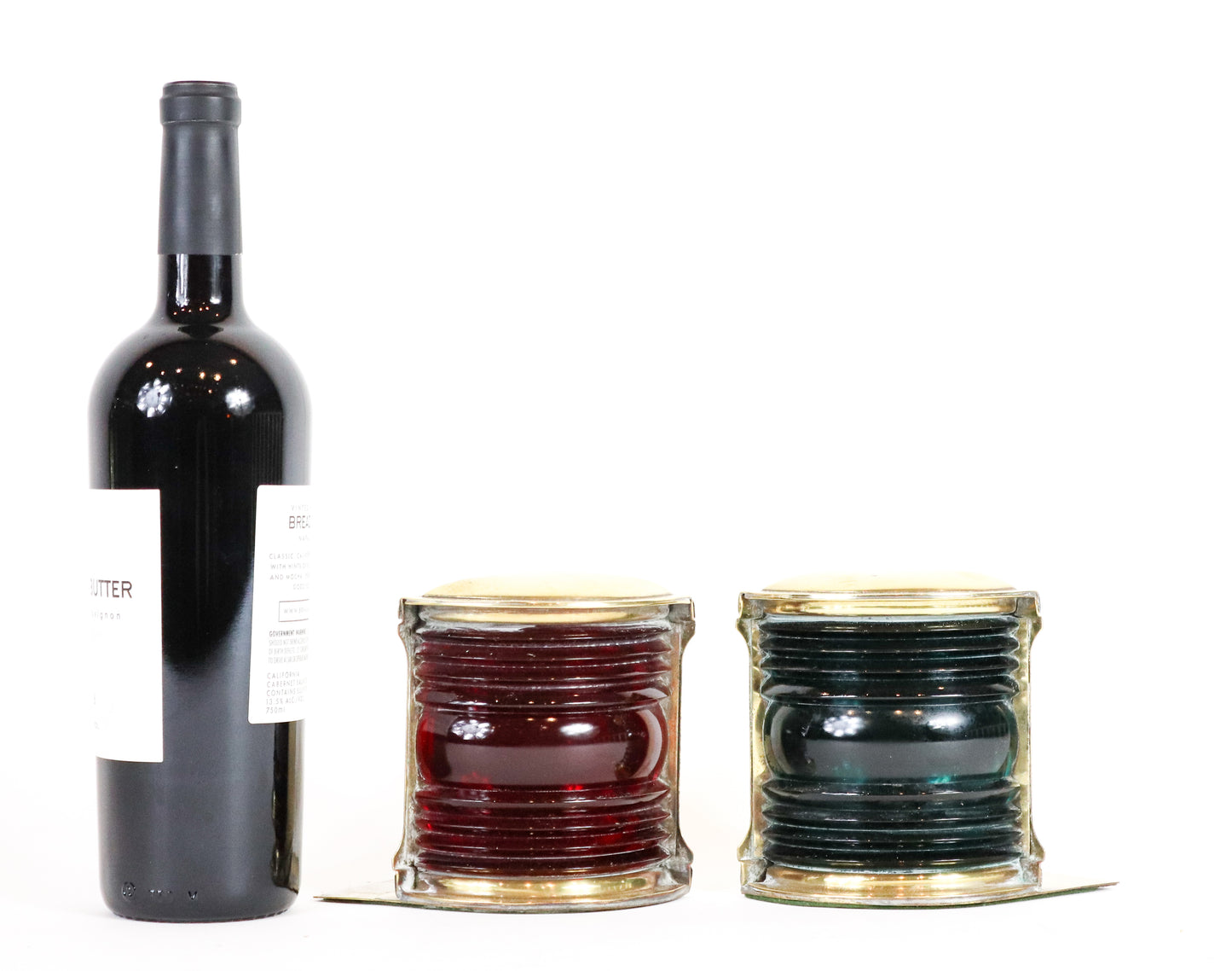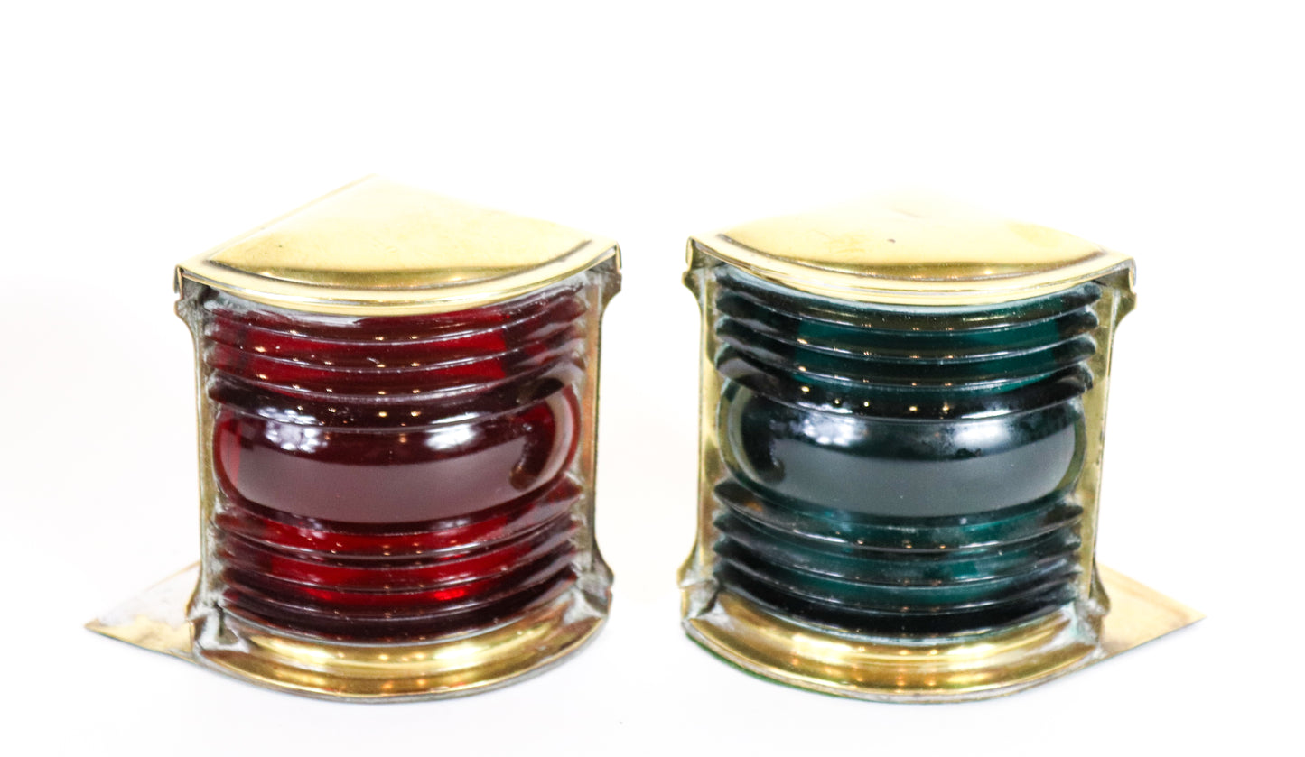 Pair of brass port and starboard lanterns wtih red and blue/green fresnel lenses. 4.5 x 4 x 3.25