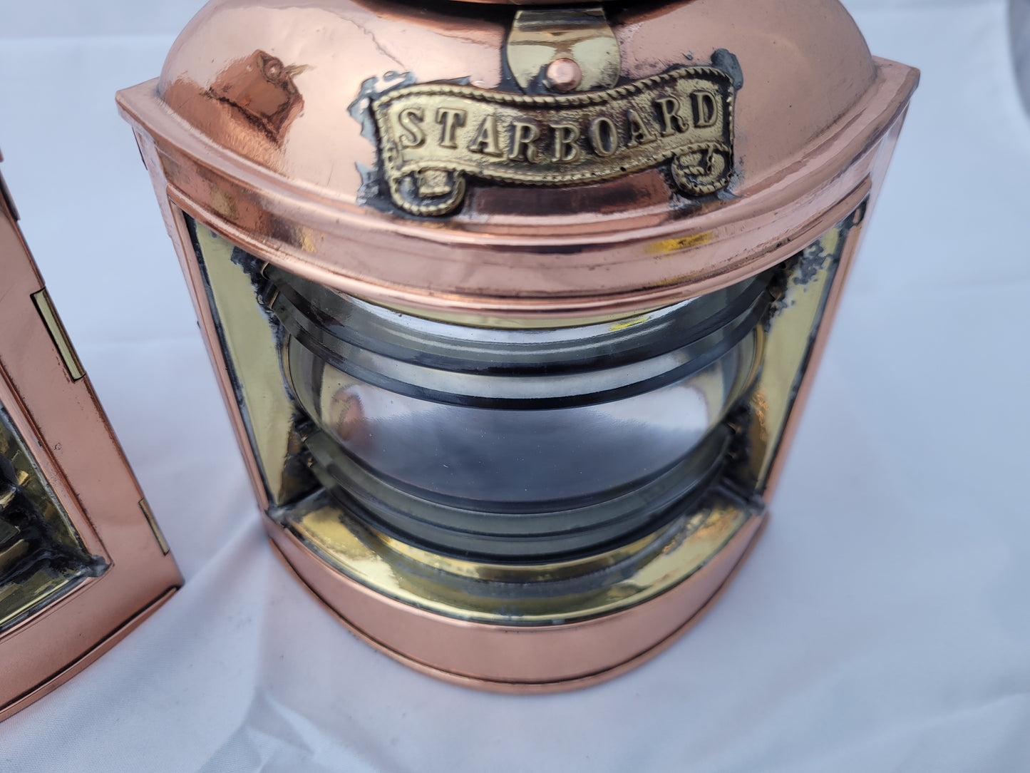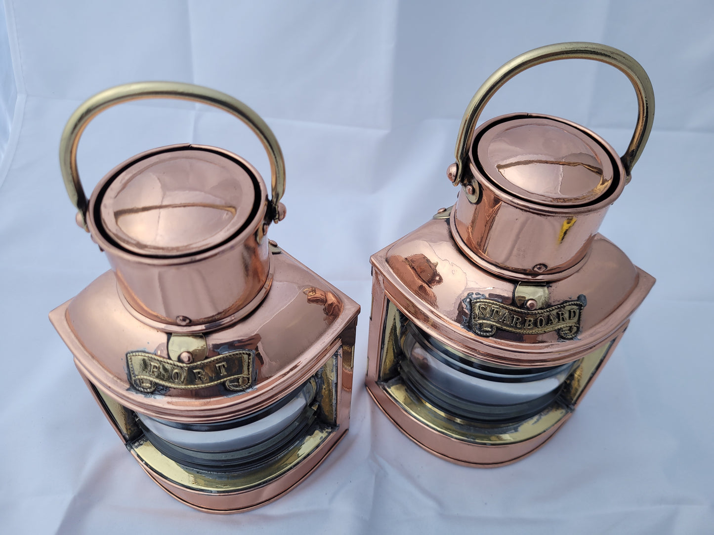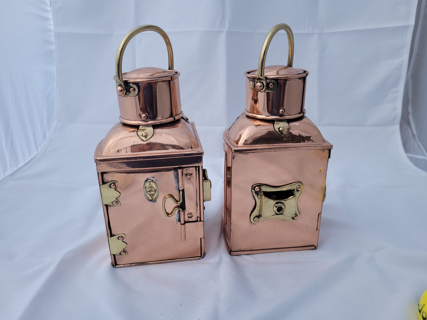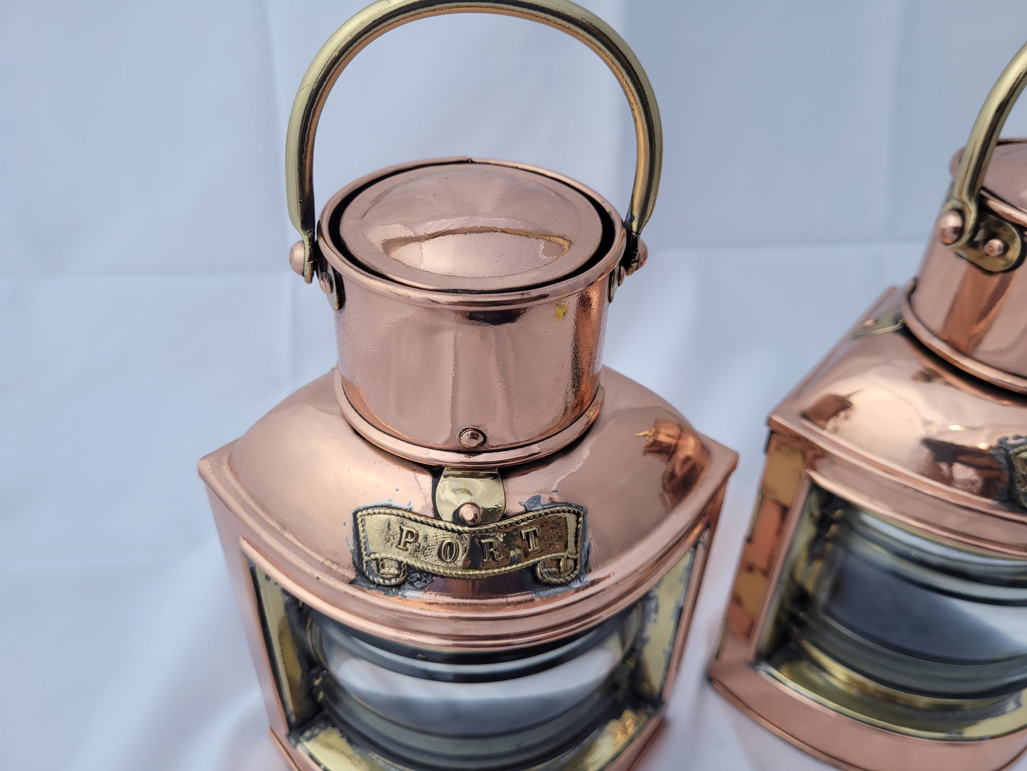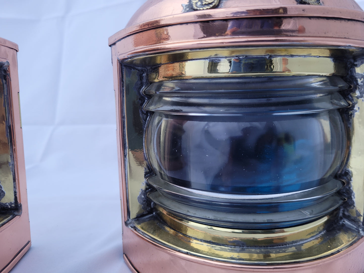 Pair of polished and lacquered port and starboard boat lanterns by Den Hann of Rotterdam Holland. Nice sturdy pair with clear Fresnel lenses in red and blue filters. With hinged rear doors, brass carry handles and mounting brackets. Den Hann was founded in 1922. These are Circa 1950. Great Pair