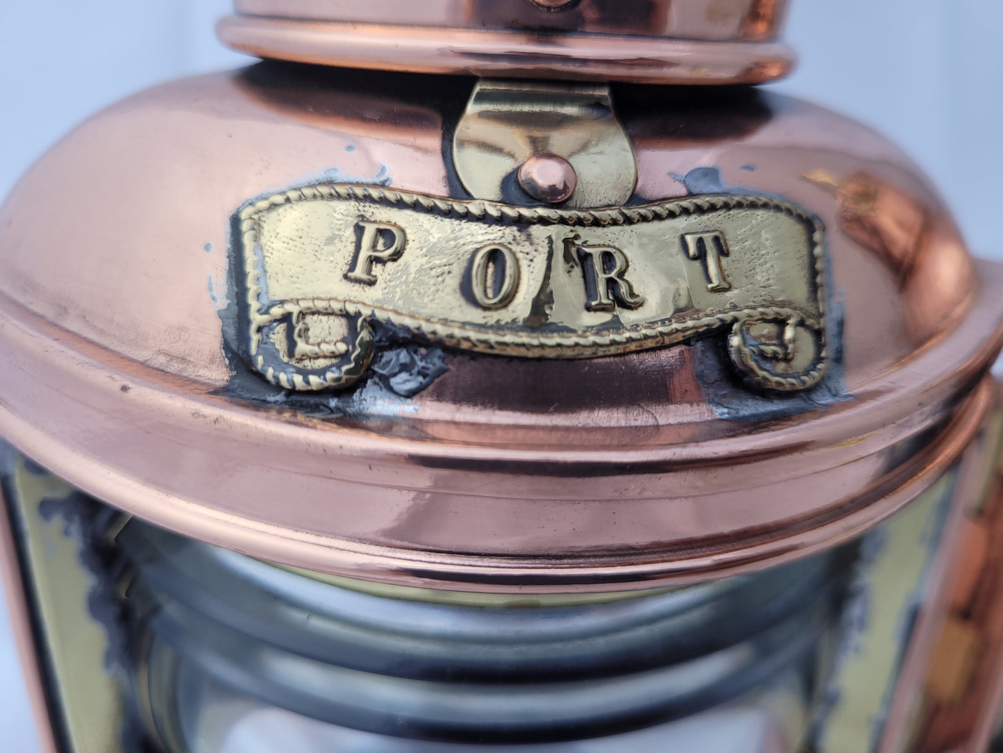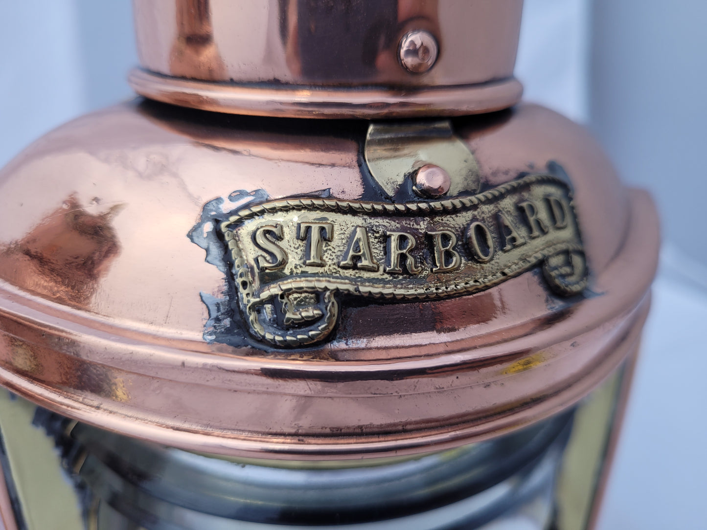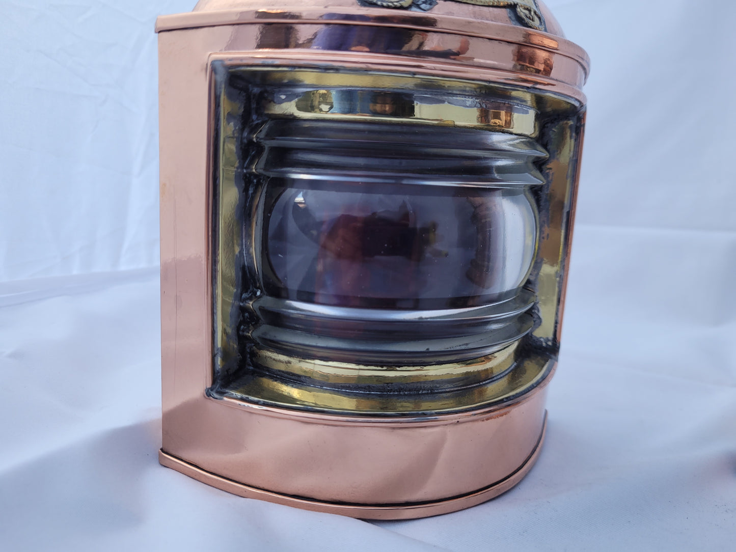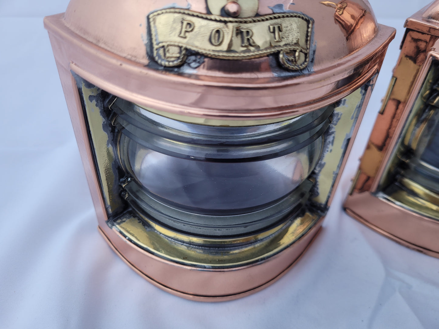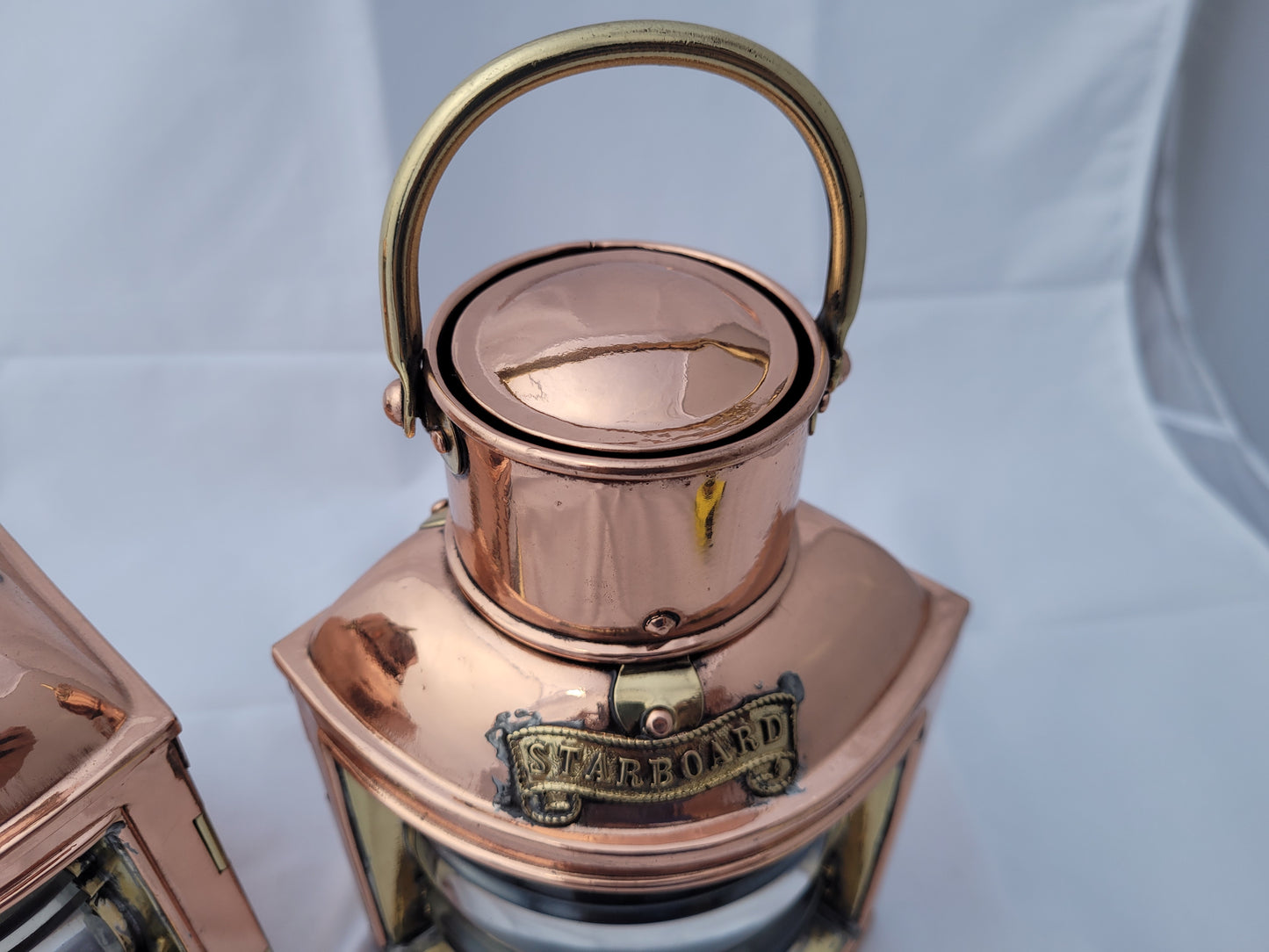 Pair of polished and lacquered port and starboard boat lanterns by Den Hann of Rotterdam Holland. Nice sturdy pair with clear Fresnel lenses in red and blue filters. With hinged rear doors, brass carry handles and mounting brackets. Den Hann was founded in 1922. These are Circa 1950. Great Pair