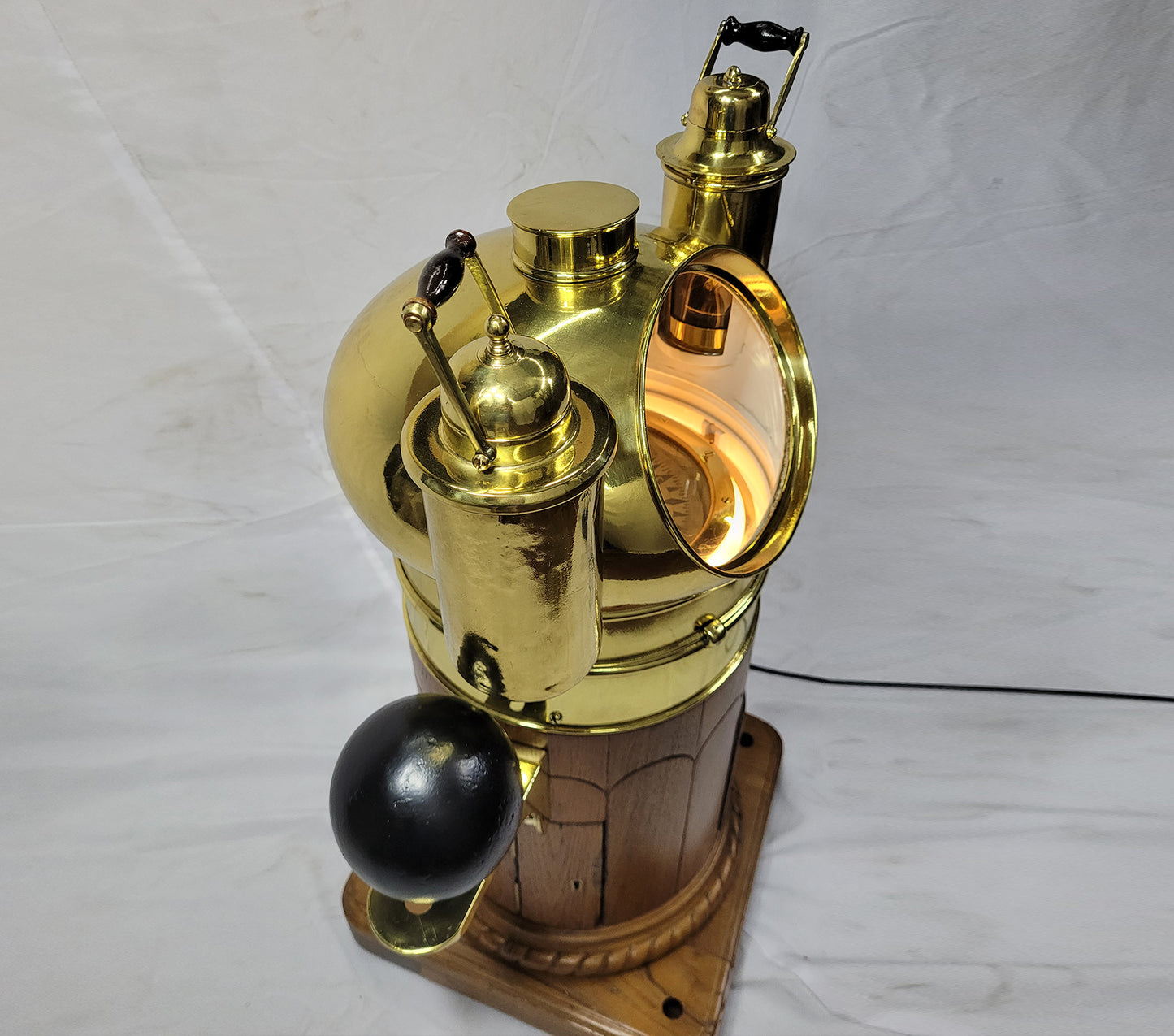 Absolutely awesome yacht binnacle by New York maker T.S & J.D Negus of New York. Varnished base with intricate rope carving. The brass binnacle carries 2 oil lanterns, Iron compensating balls are mounted to brass brackets. This is a fabulous opportunity to acquire a very fine binnacle.