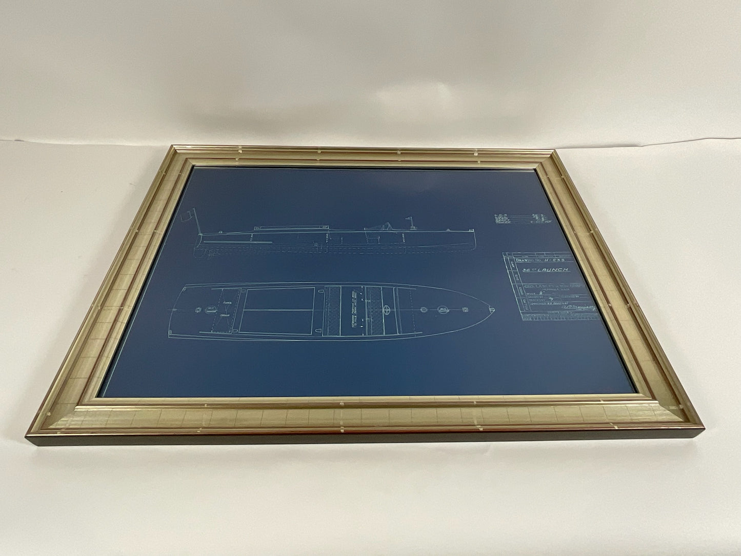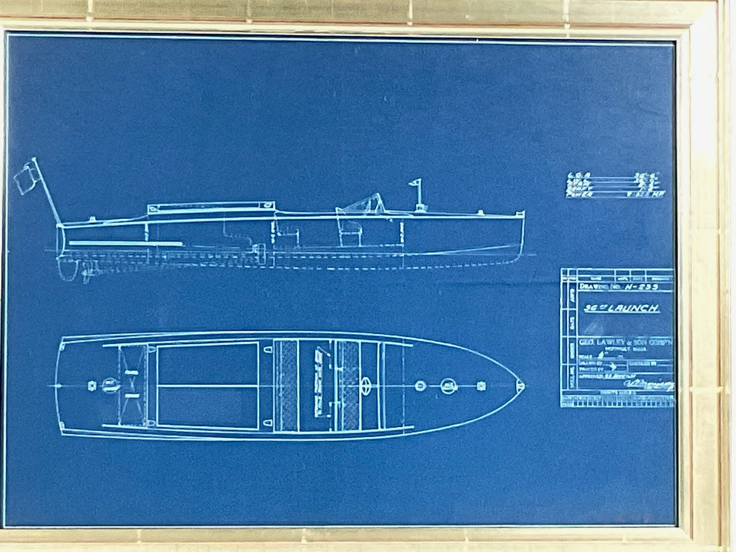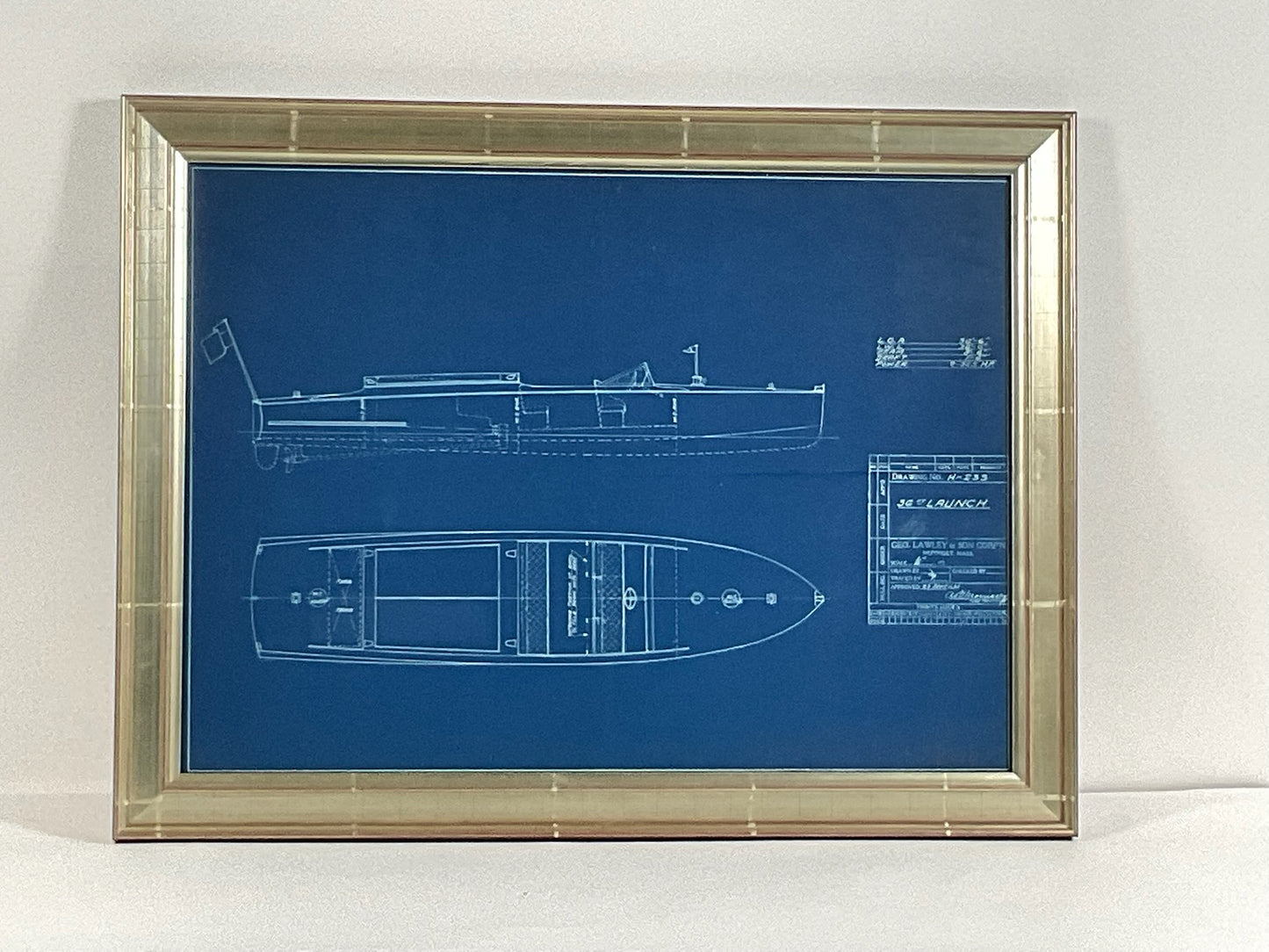 George Lawley blueprint of a thirty six foot launch. The legend shows drawing H-233, 36 ft. launch, one half inch to the foot. George Lawley and Son Corporation, Neponset Mass. Approved 23 September 1931. A Morrisey, Chief Draftsman. L.O.A. 36' 6", L.W.L. 36' 0", Beam 8' 6", Draft 1' 6", Power 2 - 325HP. This is amazing polder for the day.
