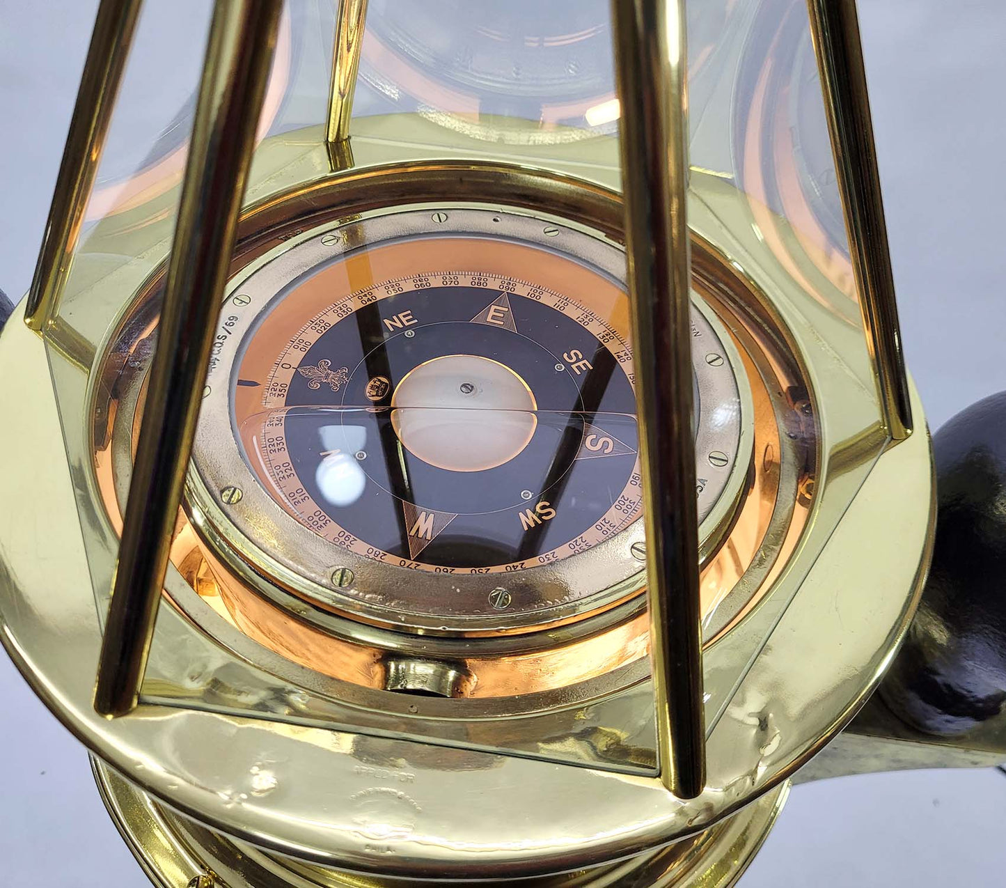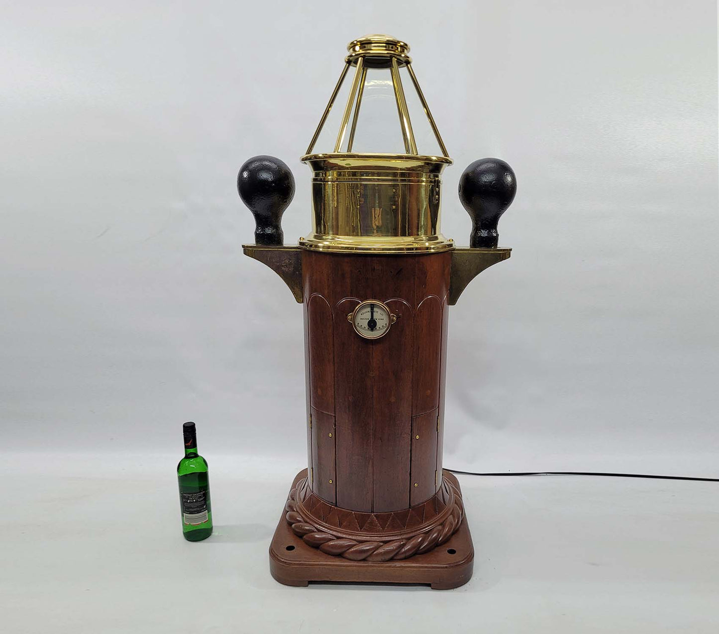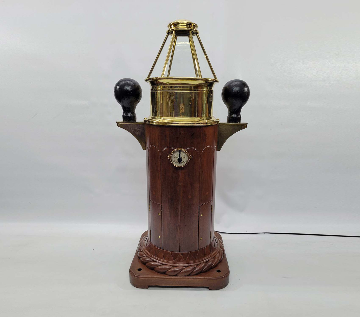 Fine early 20th Century Skylight Yacht Binnacle. Amazing wood base with intricate rope carving and varnish and varnish finish. The six-sided Skylight top houses. A gimballed Compass. Iron compensating balls are mounted to brackets.