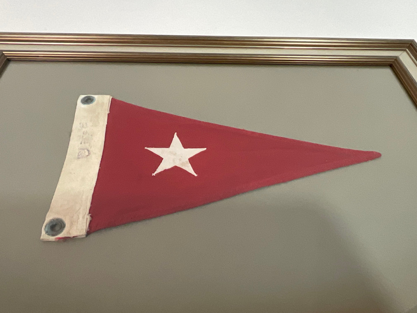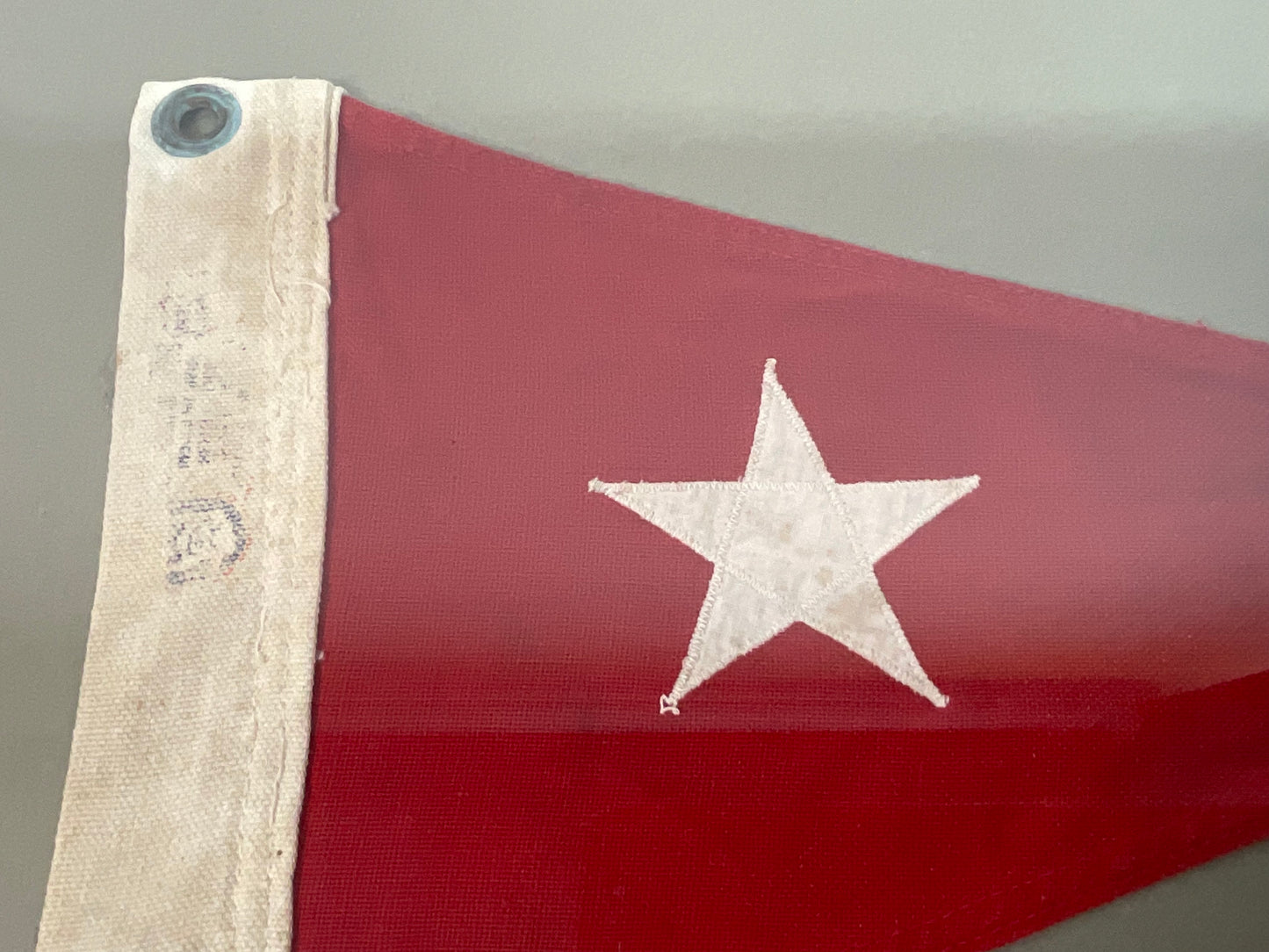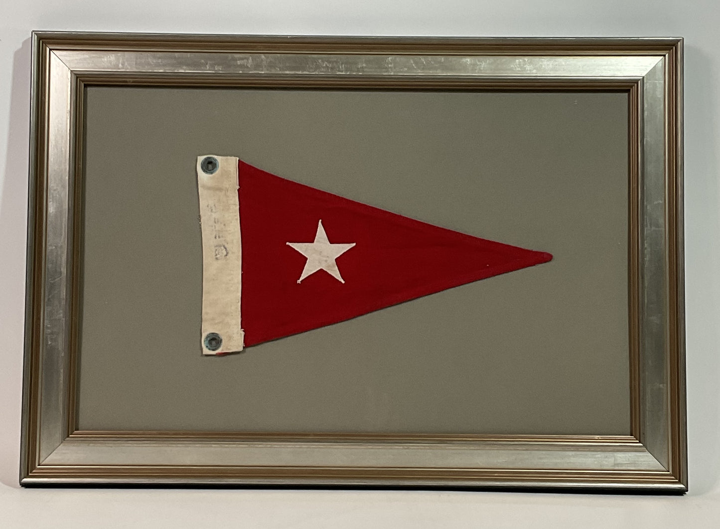 Cotton yachting flag with a red field and stitched white star, and cotton hoist with tarnished brass grommets. Set on gray matting and framed.