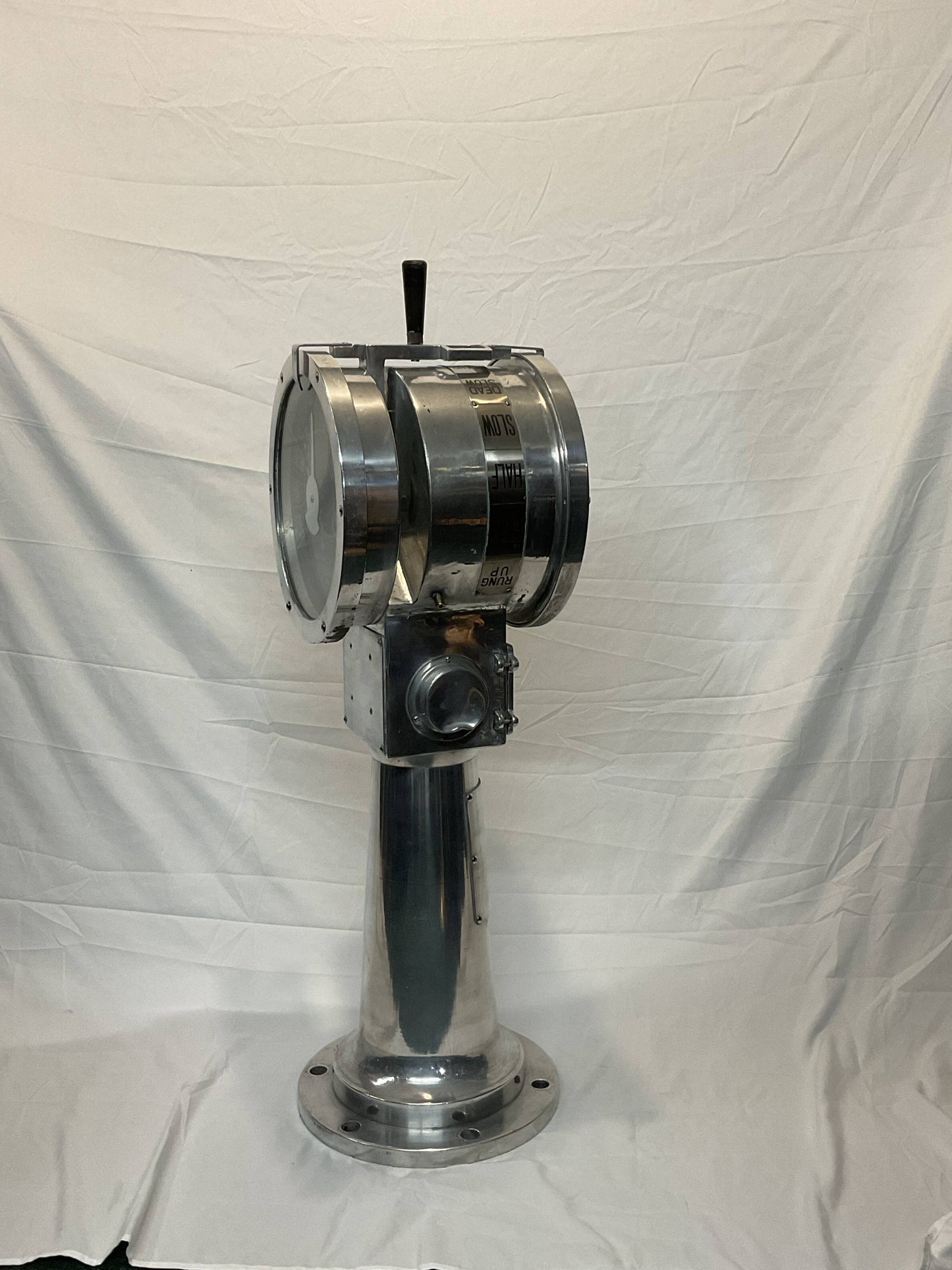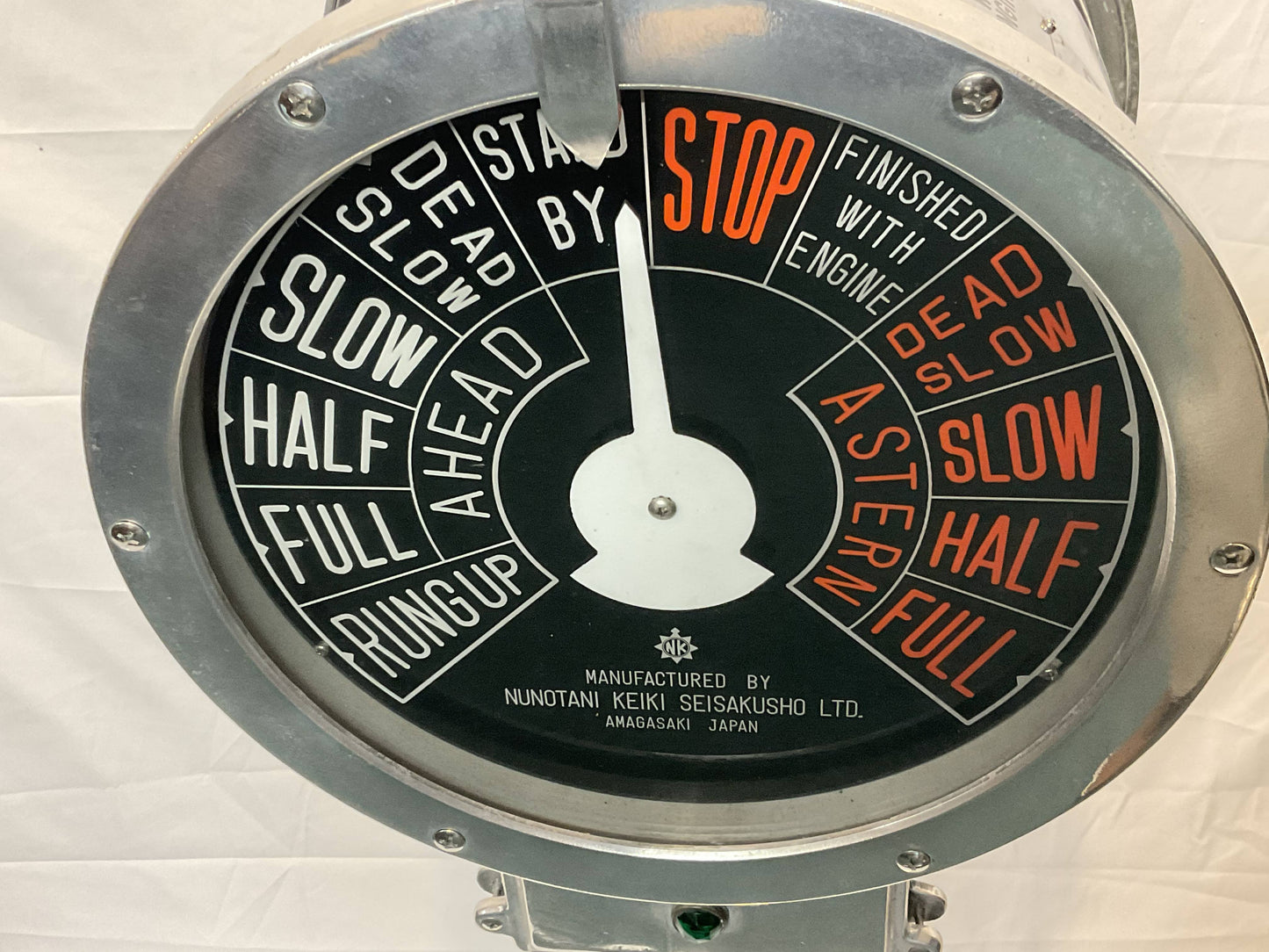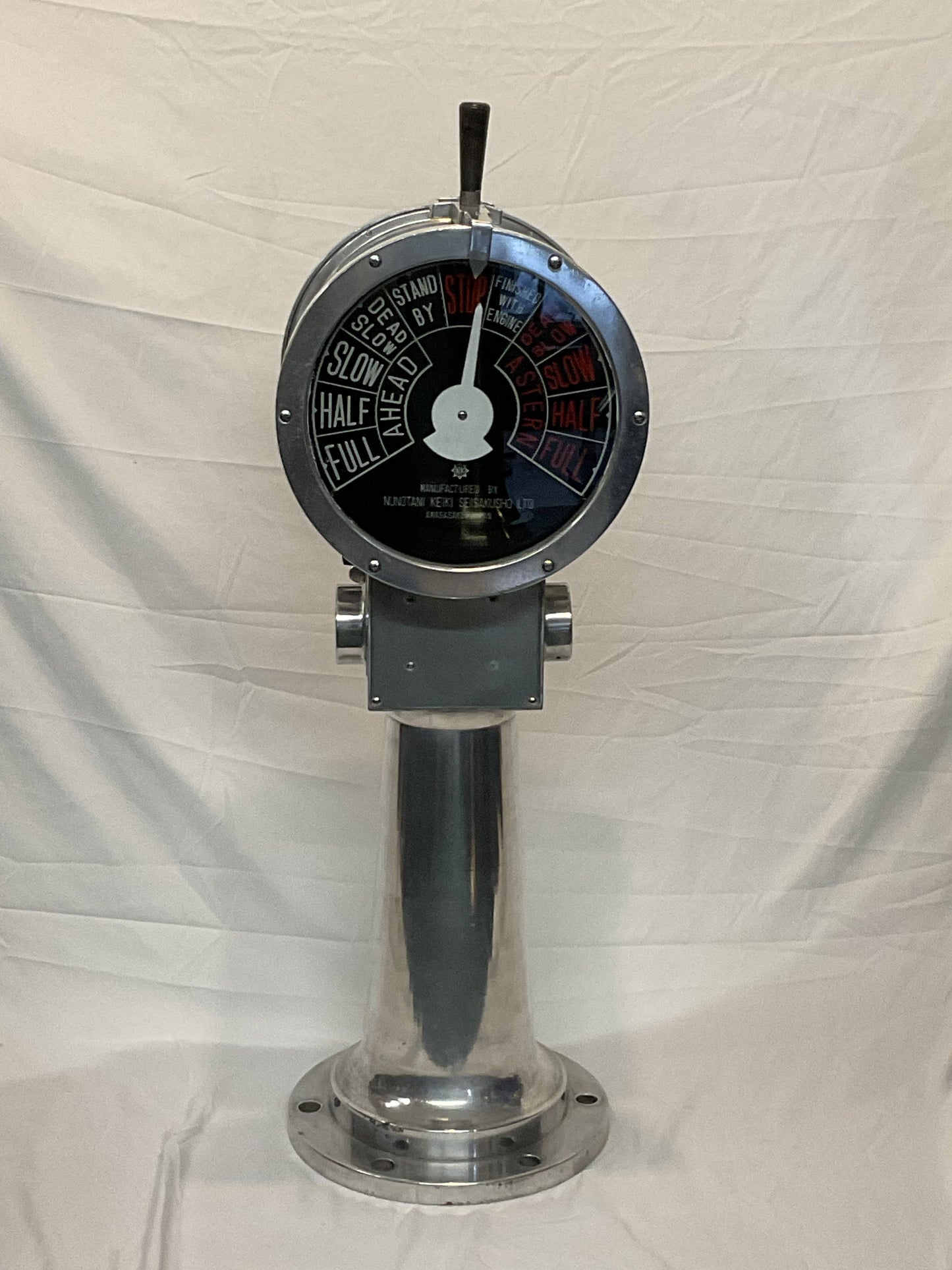 Polished aluminum ships engine order telegraph by Nunotani Keiki Seisakusno Lto, Amgasaki Japan. Twin face design. Faceplate commands are full, half, slow, dead slow, stand by and stop, ahead and astern.