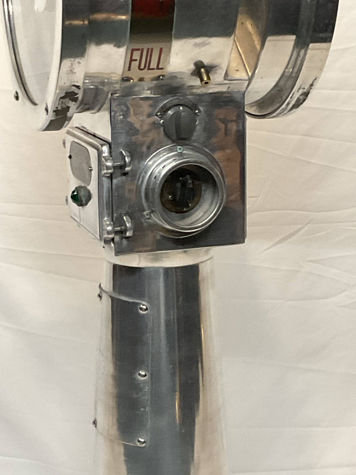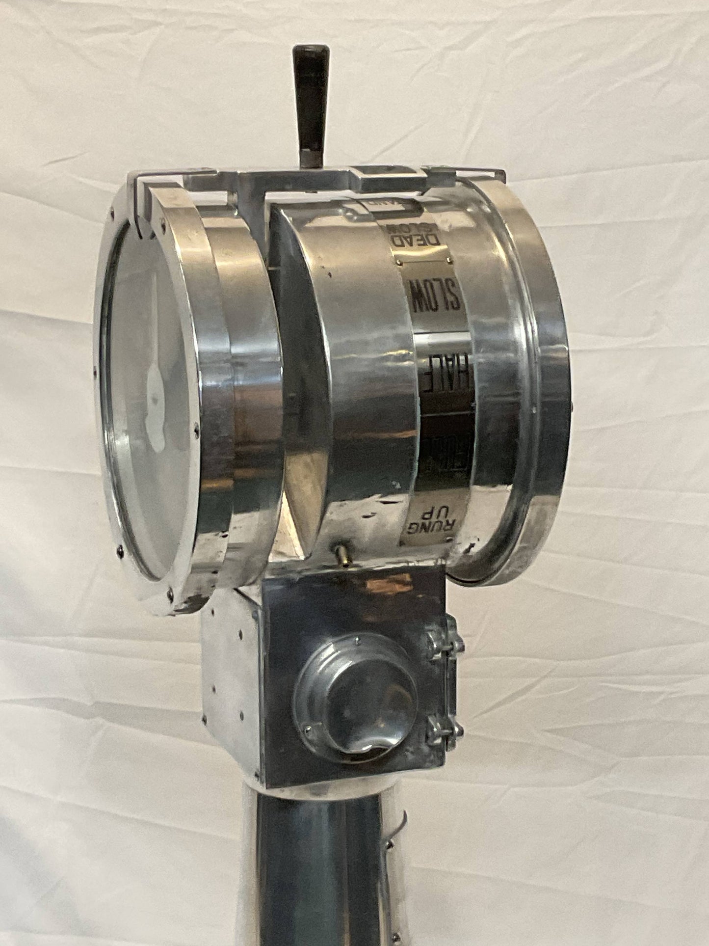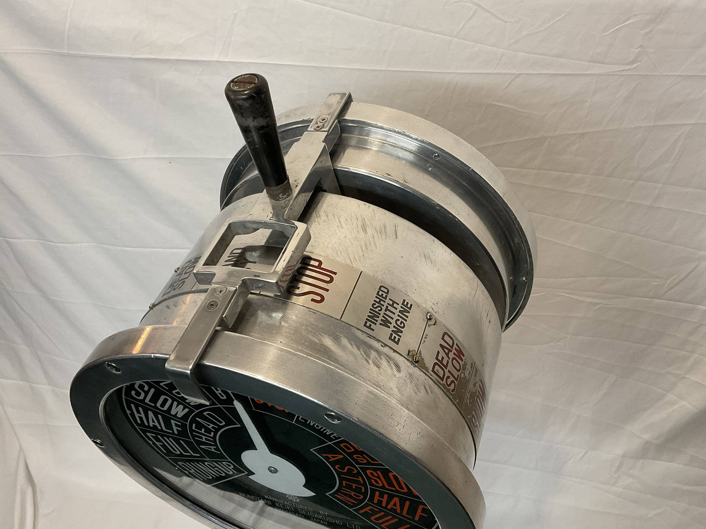 Polished aluminum ships engine order telegraph by Nunotani Keiki Seisakusno Lto, Amgasaki Japan. Twin face design. Faceplate commands are full, half, slow, dead slow, stand by and stop, ahead and astern.