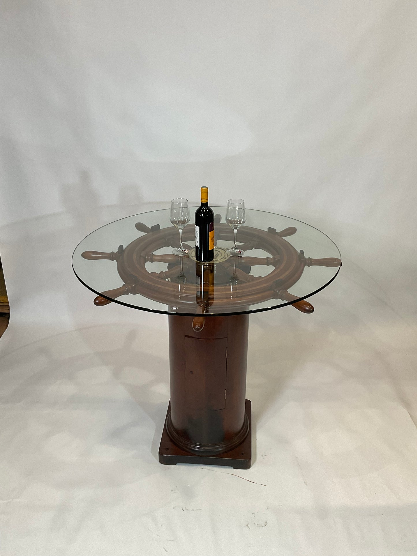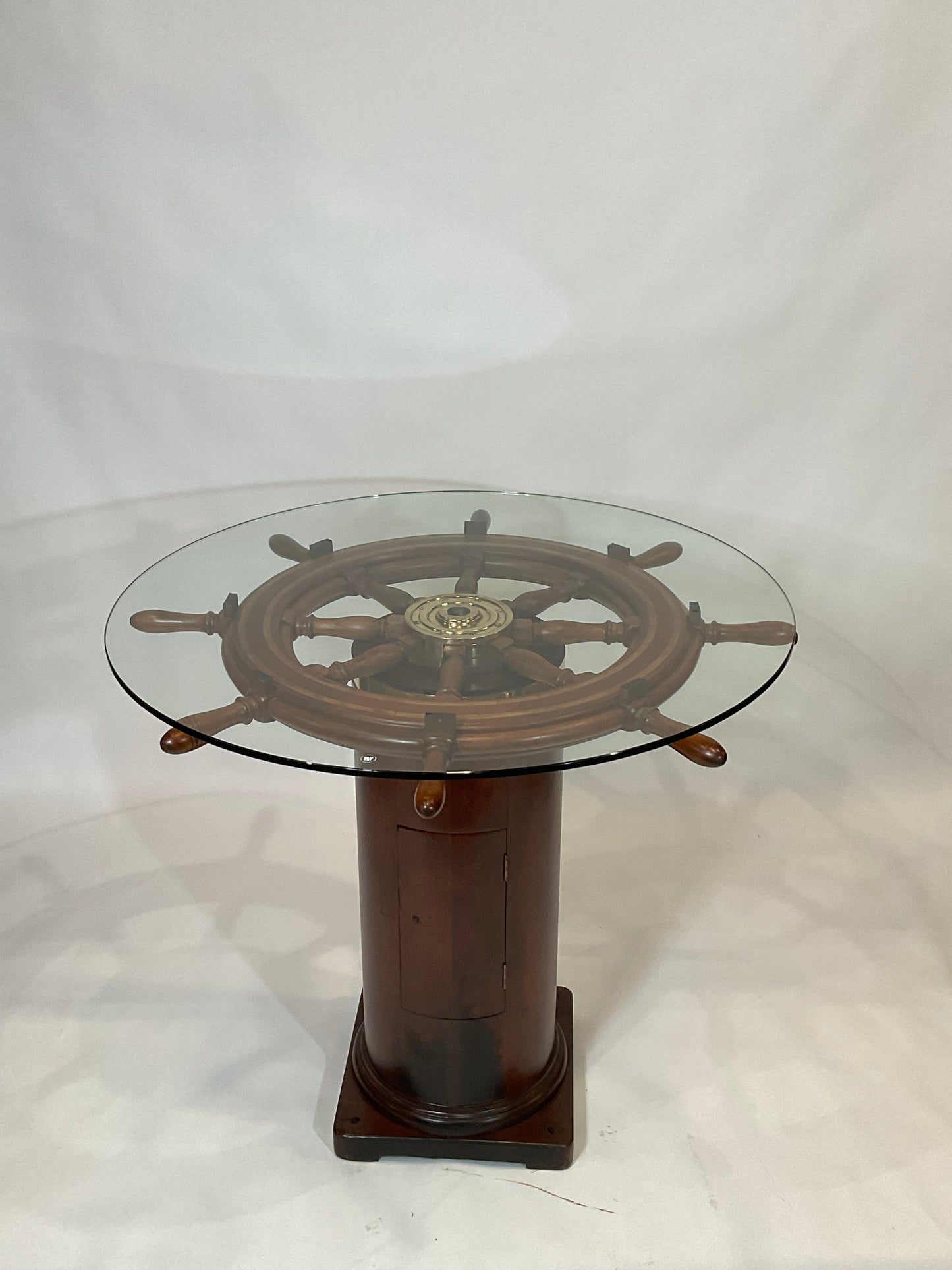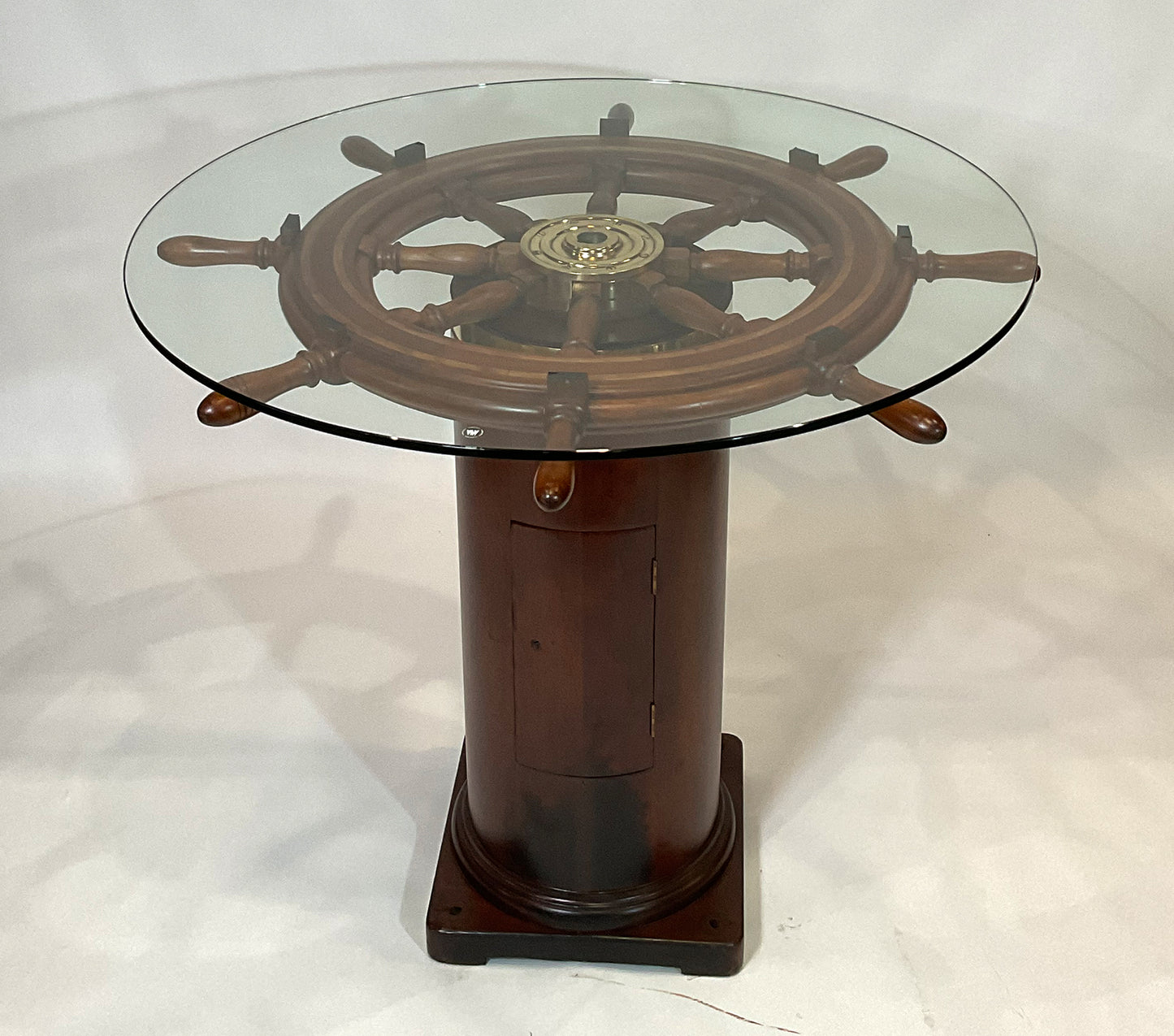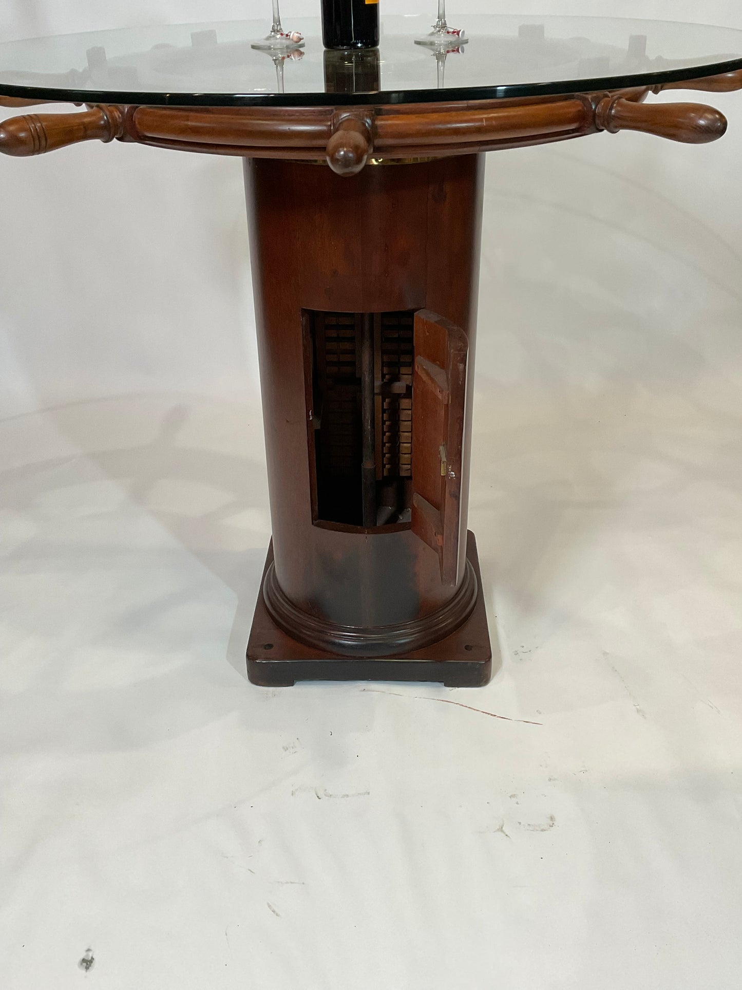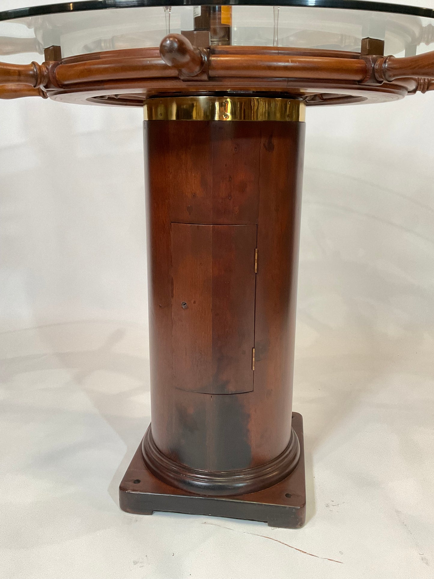 Antique American ships wheel mounted to a ships binnacle base creating an awesome bar height pub table. Perfect for two to four pub stools or chairs. The wheel has been expertly refinished. The brass hub has been highly polished and lacquered. This fabulous nautical accent is fitted with a forty-four-inch tempered glass top that is a half inch thick. The ships wheel is fitted with a ball bearing turntable