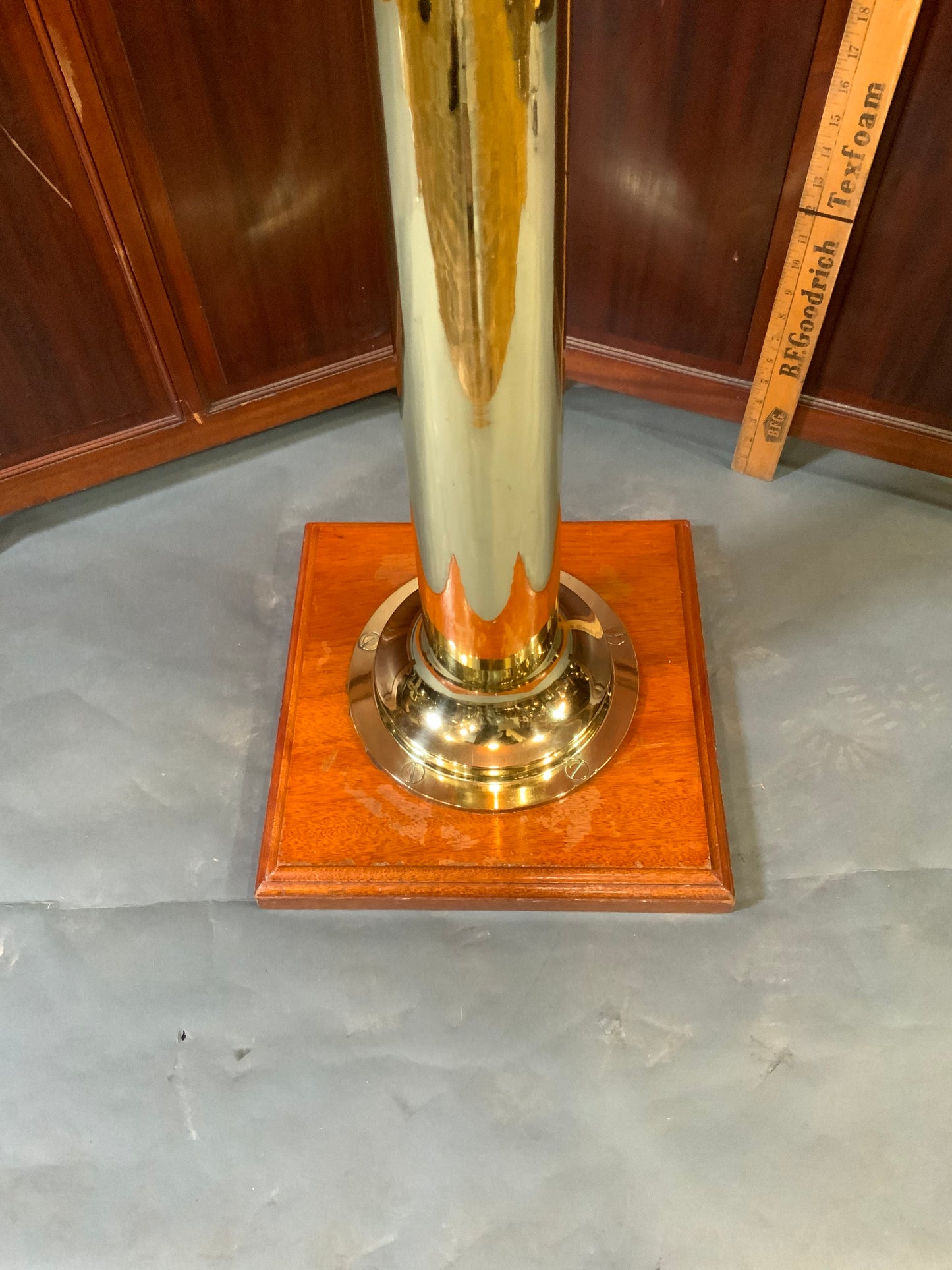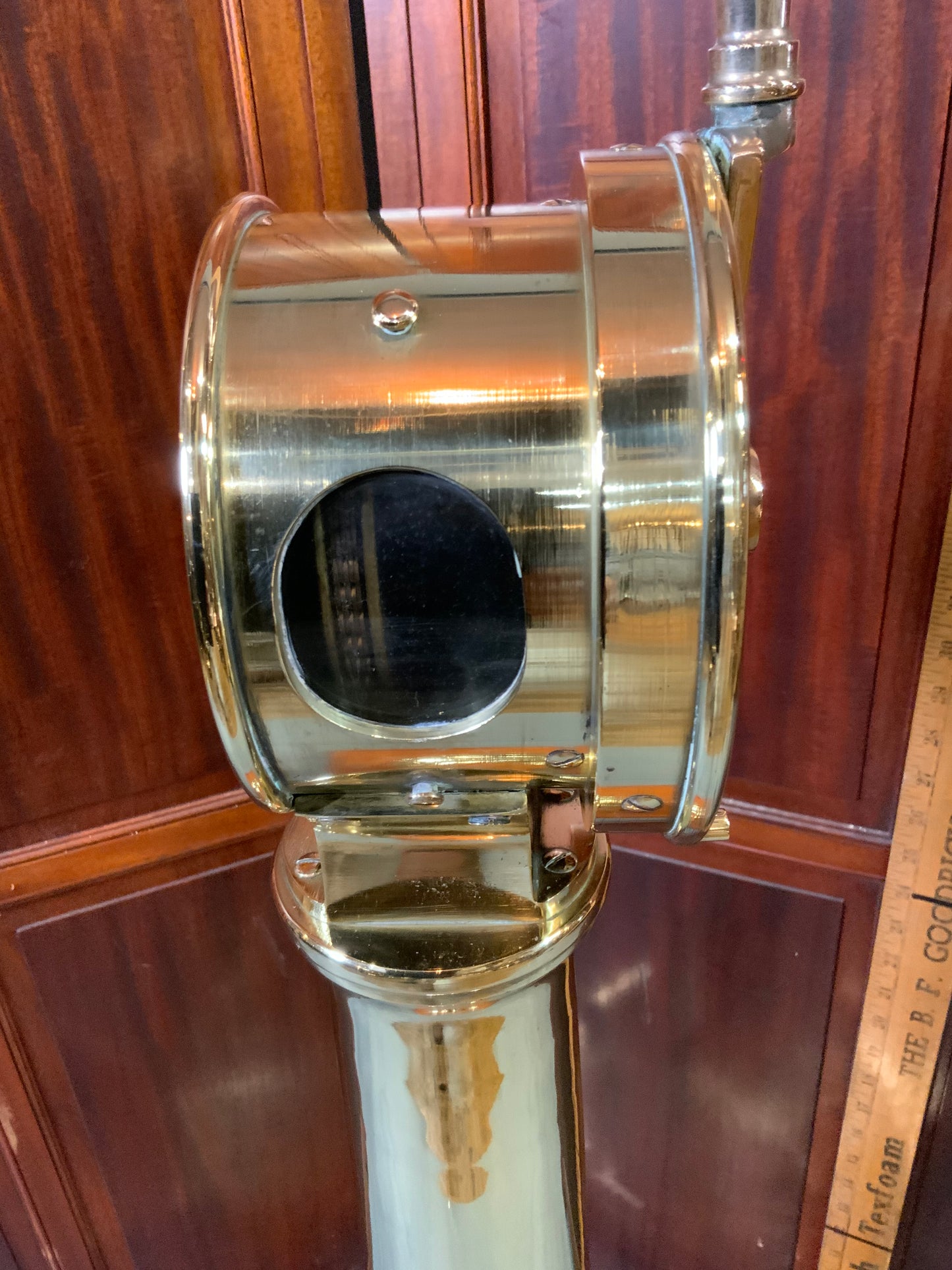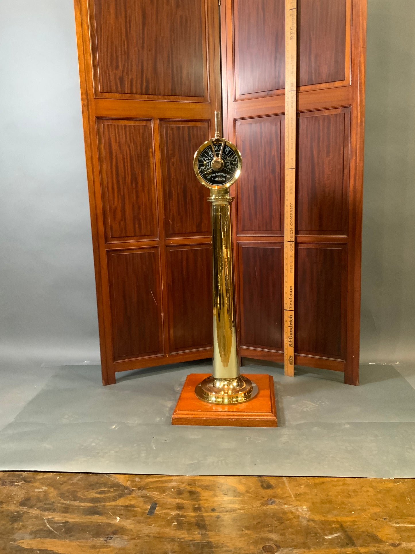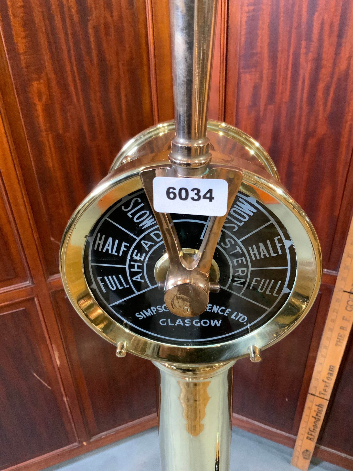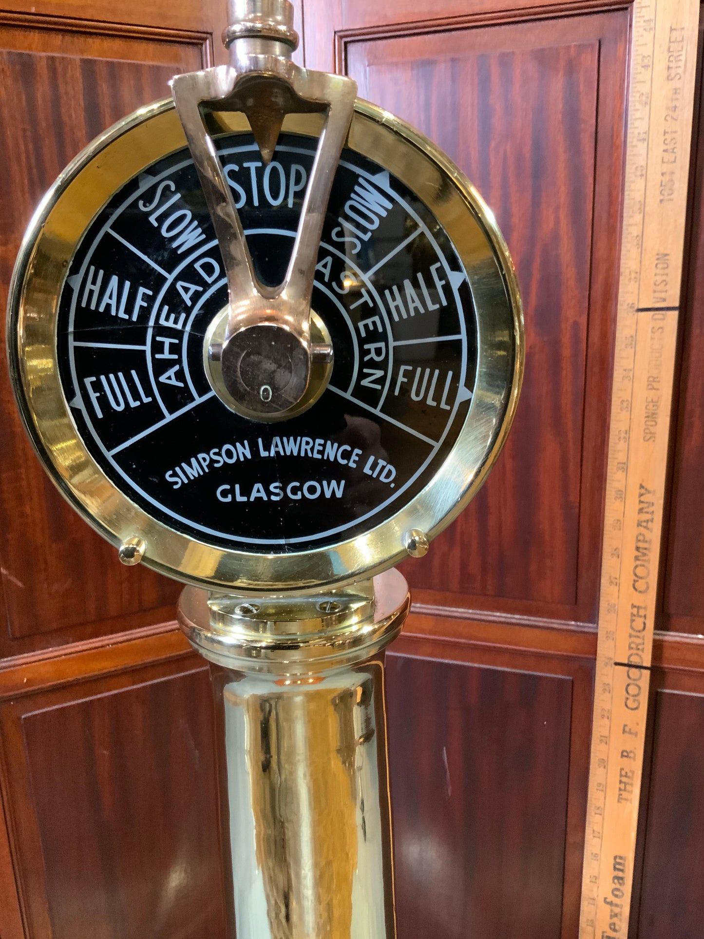 Here is a very sweet solid brass highly polished engine order telegraph by Simpson Lawrence. 43 pounds. Nice slender telegraph mounted to a wood base. Dimensions 40 tall by 7 by 5. Base is 15 by 15 square. $3995.