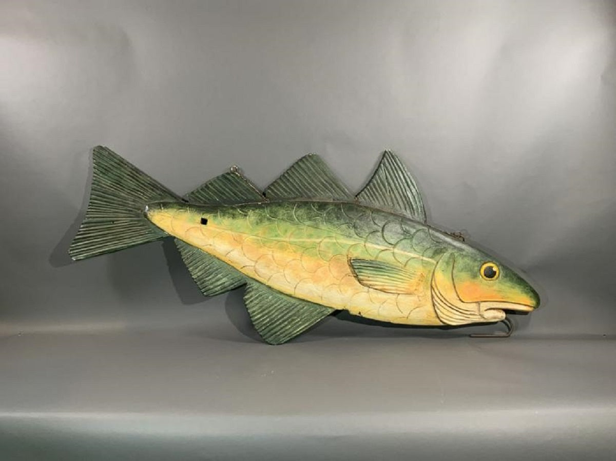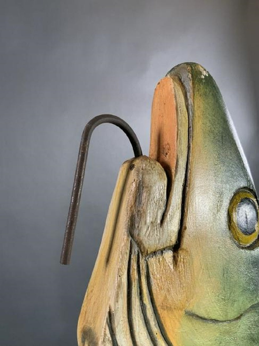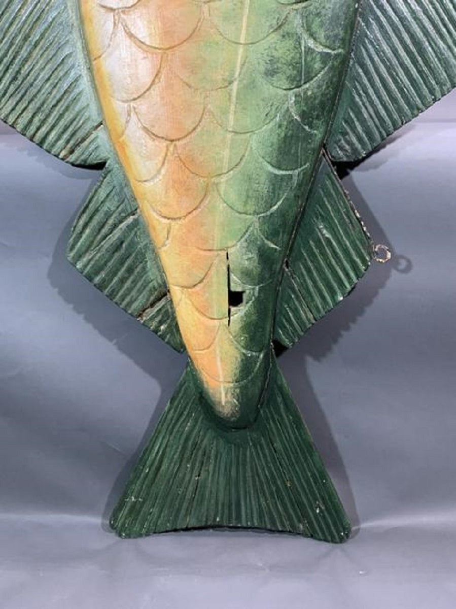 Six foot hand carved fish from England. Most recently from a local seafood restaurant. Nicely painted and carved showing fins, gills, mouth, eyes, etc.
