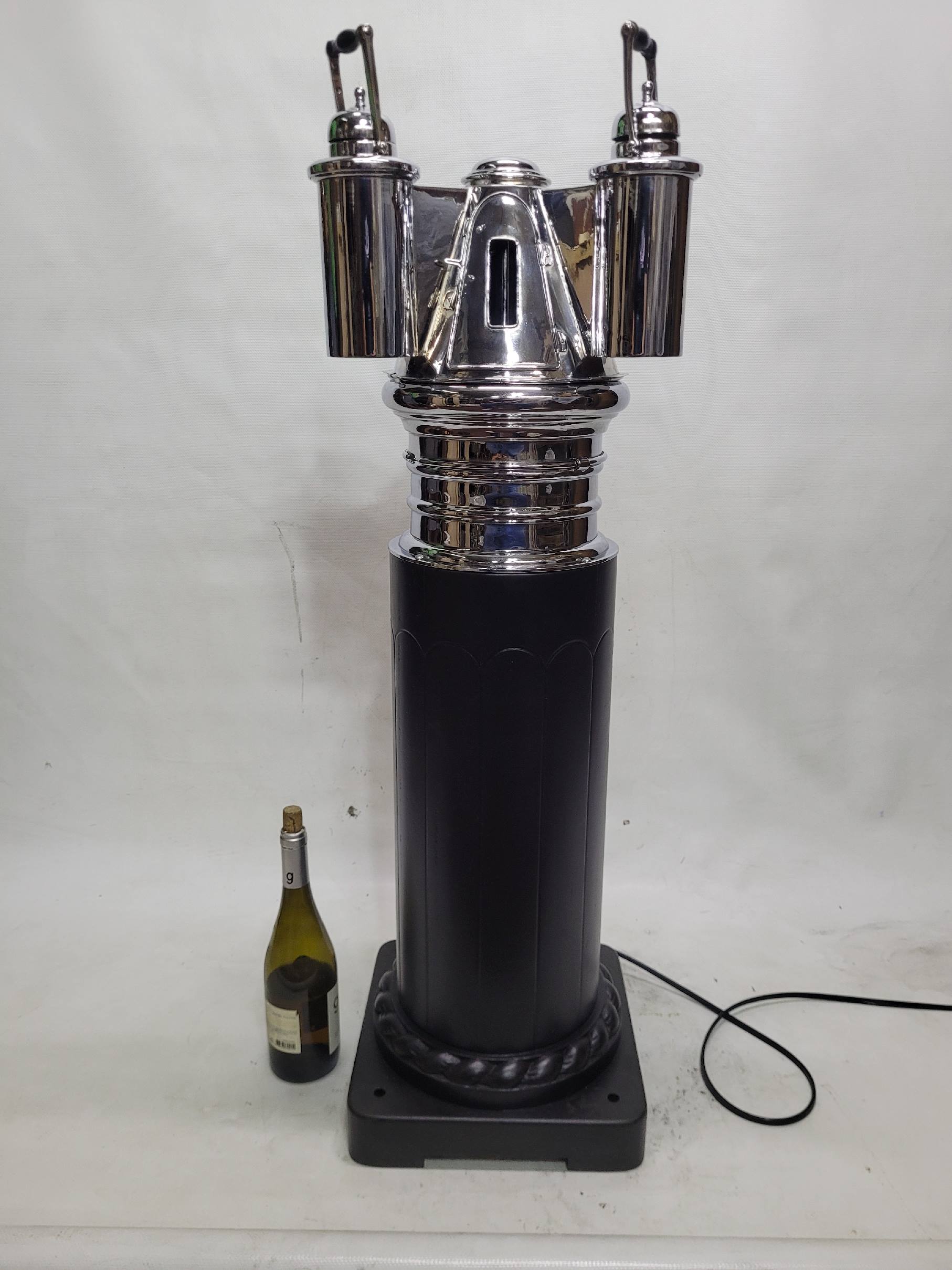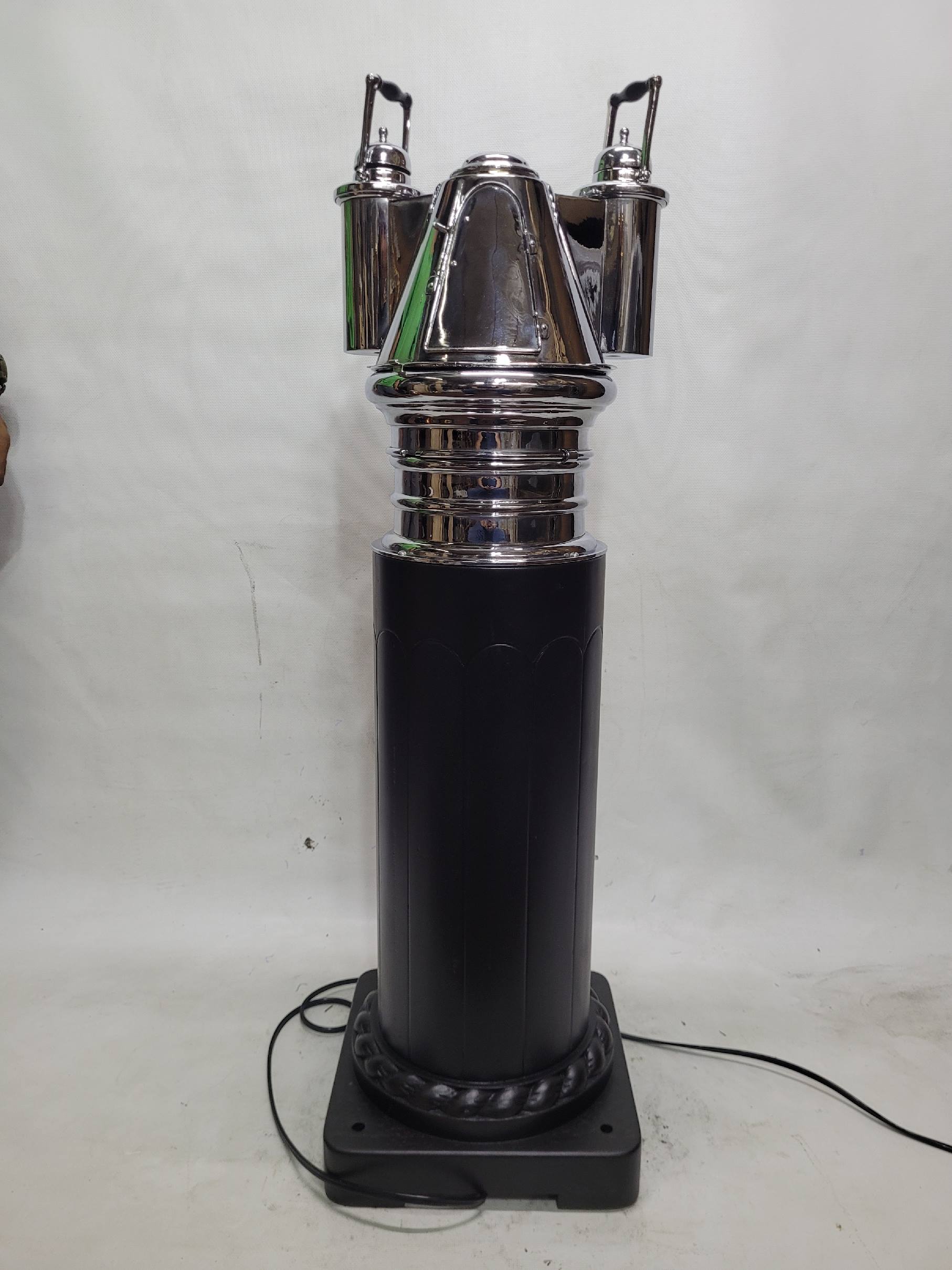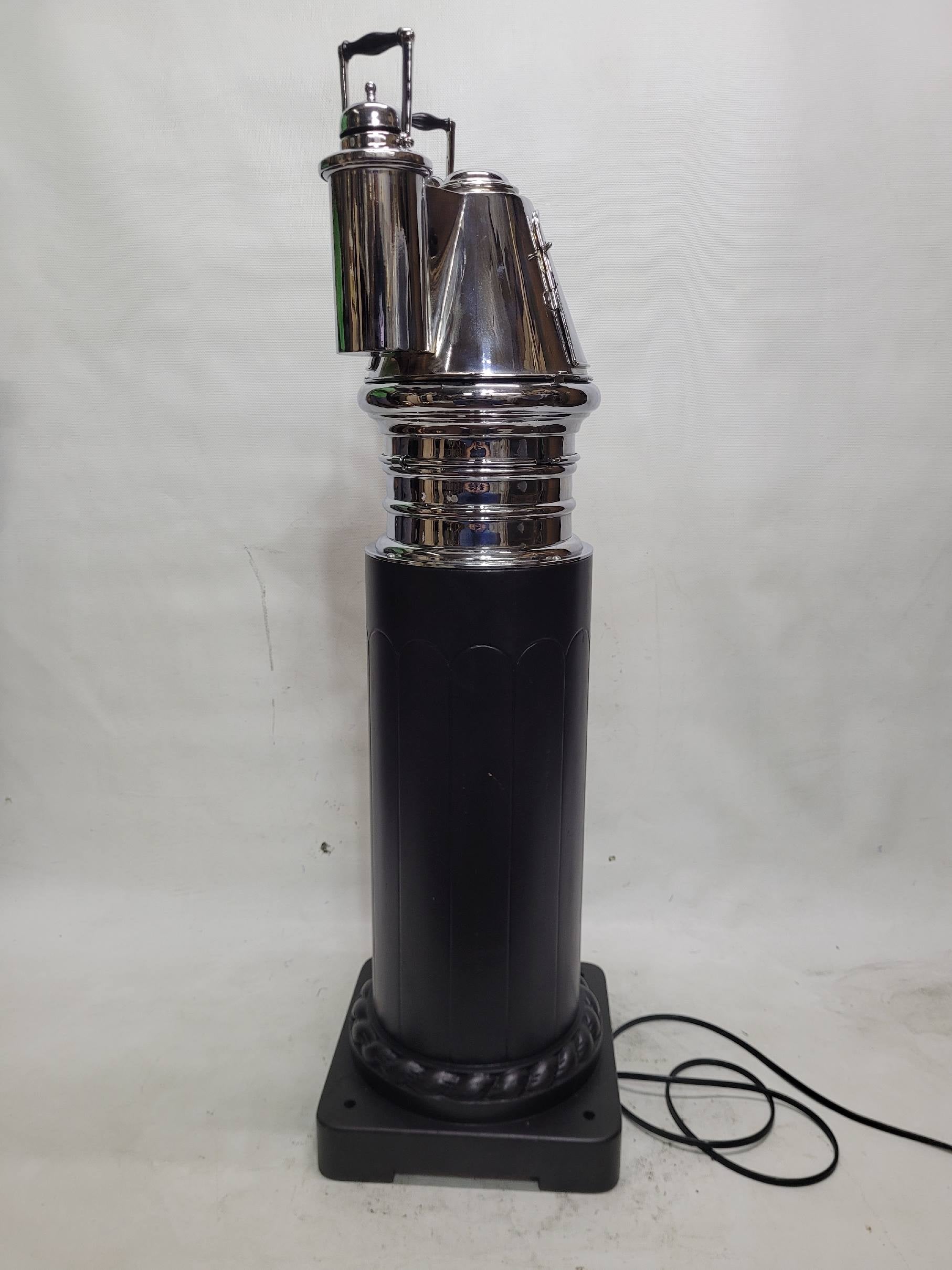 Chrome plated John Bliss & Company skylight yacht binnacle. With gimballed compass engraved with maker’s name. Six sided top with heavy weather shroud and twin oil burners. Highest quality. Wood pedestal base with rope carved border.