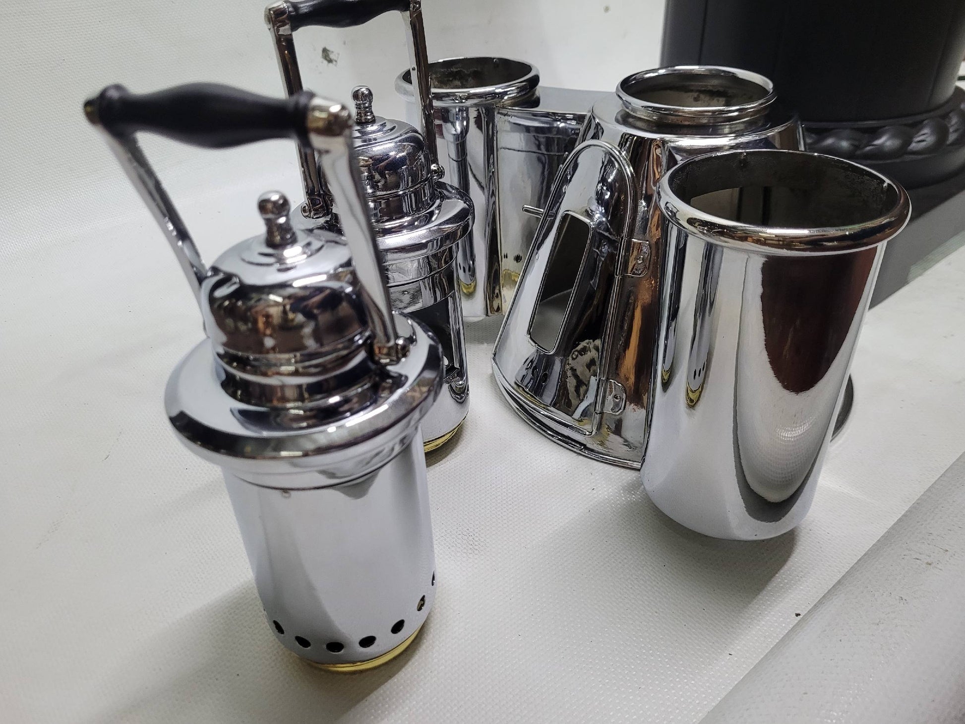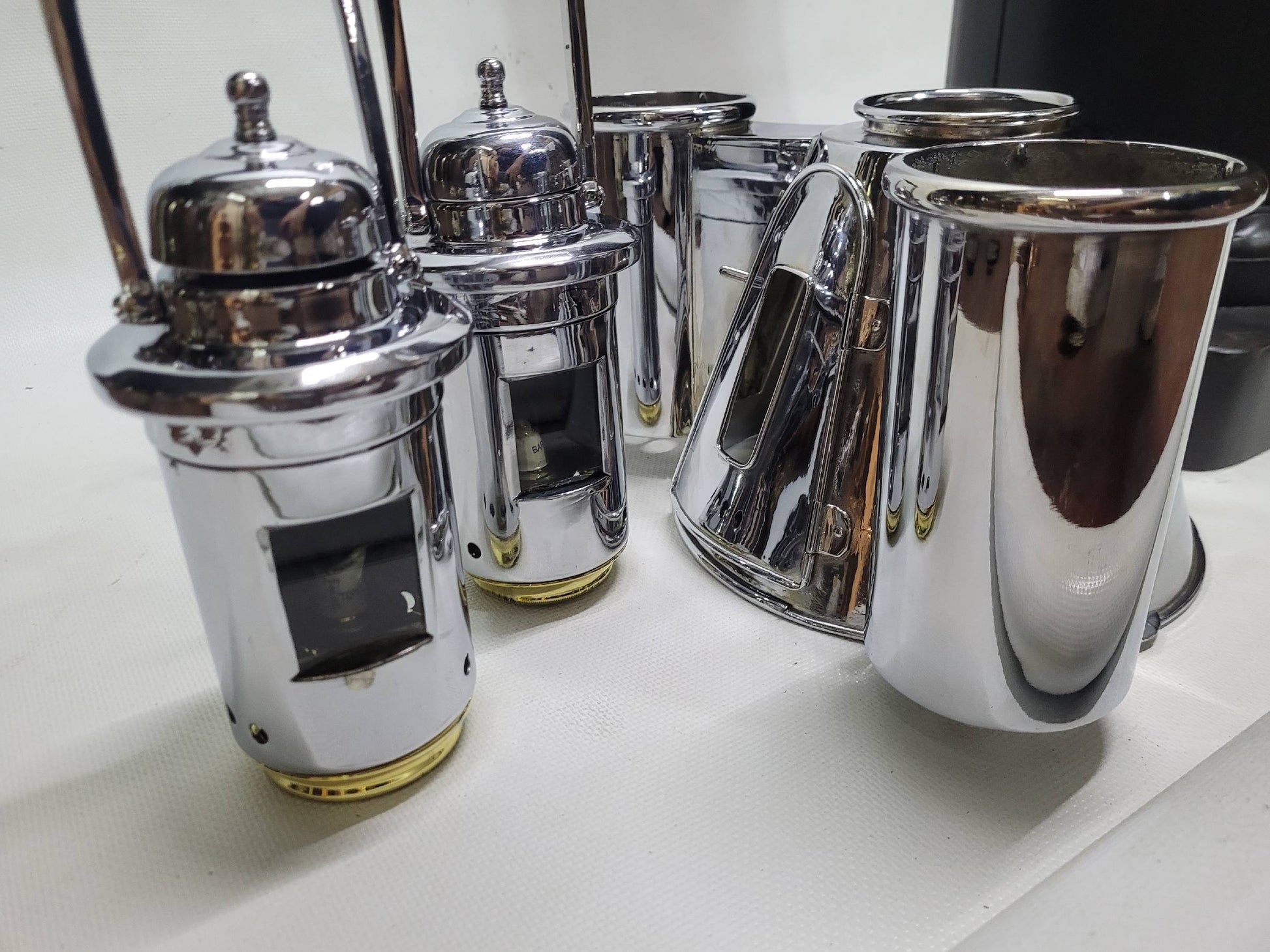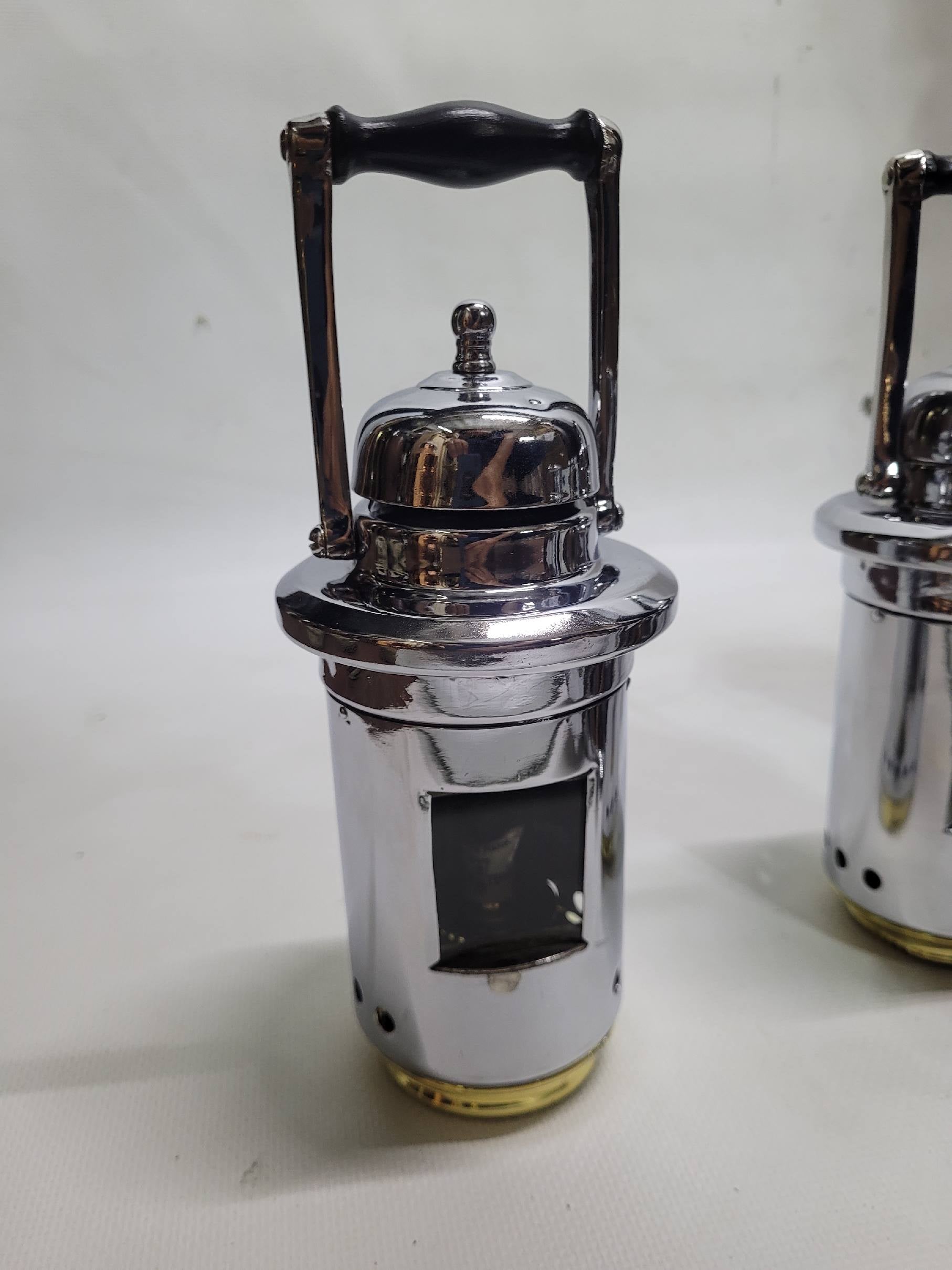 Chrome plated John Bliss & Company skylight yacht binnacle. With gimballed compass engraved with maker’s name. Six sided top with heavy weather shroud and twin oil burners. Highest quality. Wood pedestal base with rope carved border.