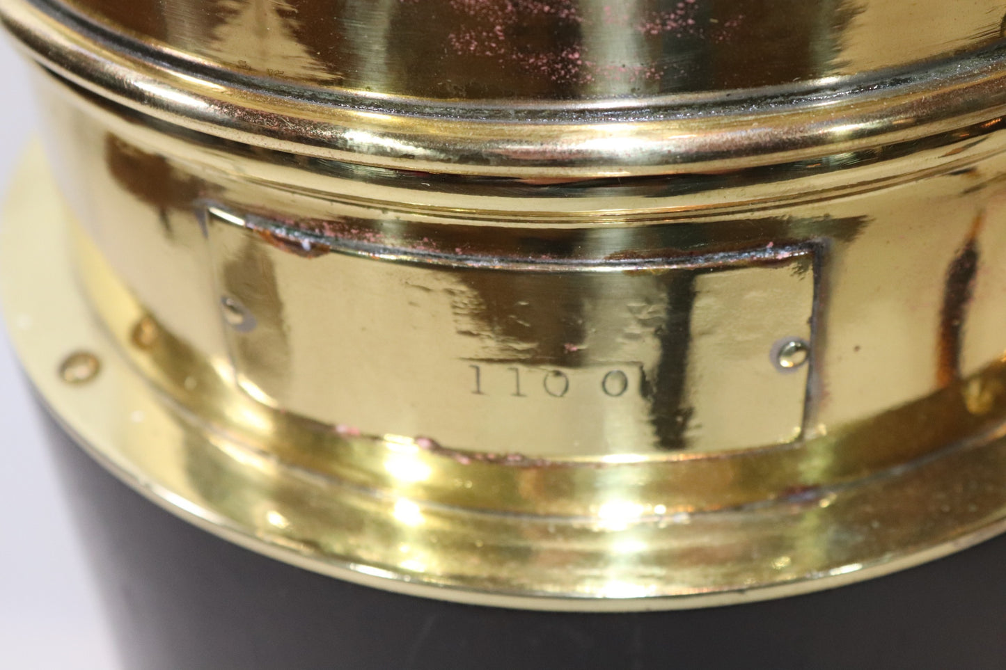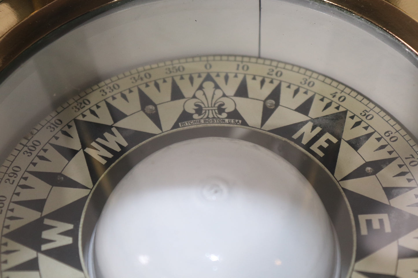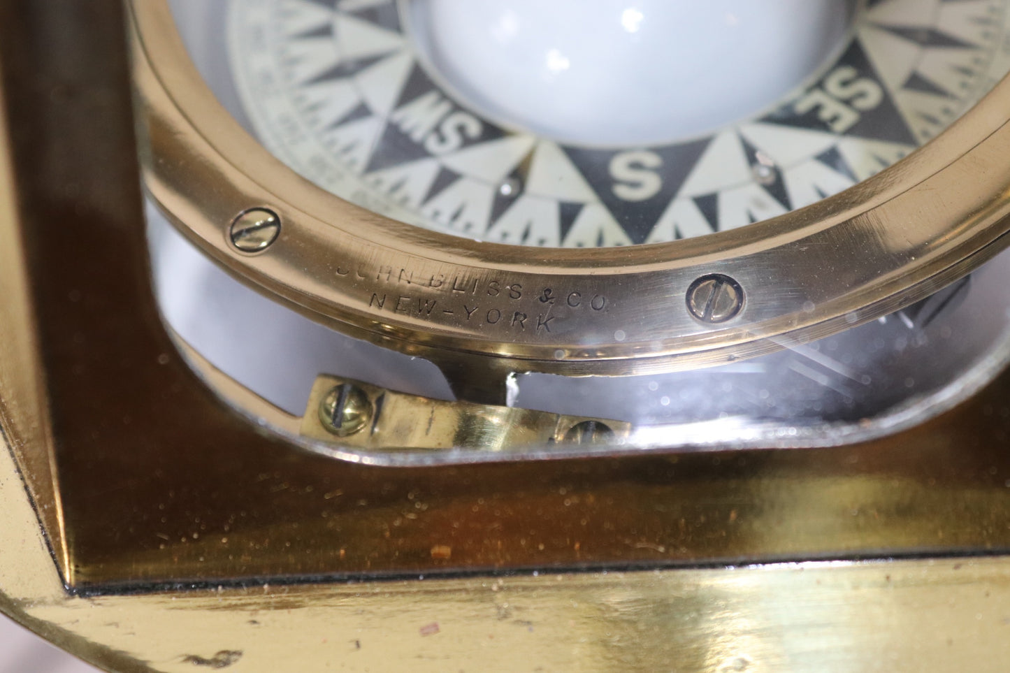 Beautiful solid brass yacht binnacle from John Bliss of New York with gimbaled compass mounted to a varnished wood base. The compass bezel is engraved John Bliss and Company New York. The compass card is marked Ritchie Boston mounted to a varnished wood pedestal with rope carved border at base. John Bliss nameplate is numbered 1100. Circa 1890. Weight is 31 pounds