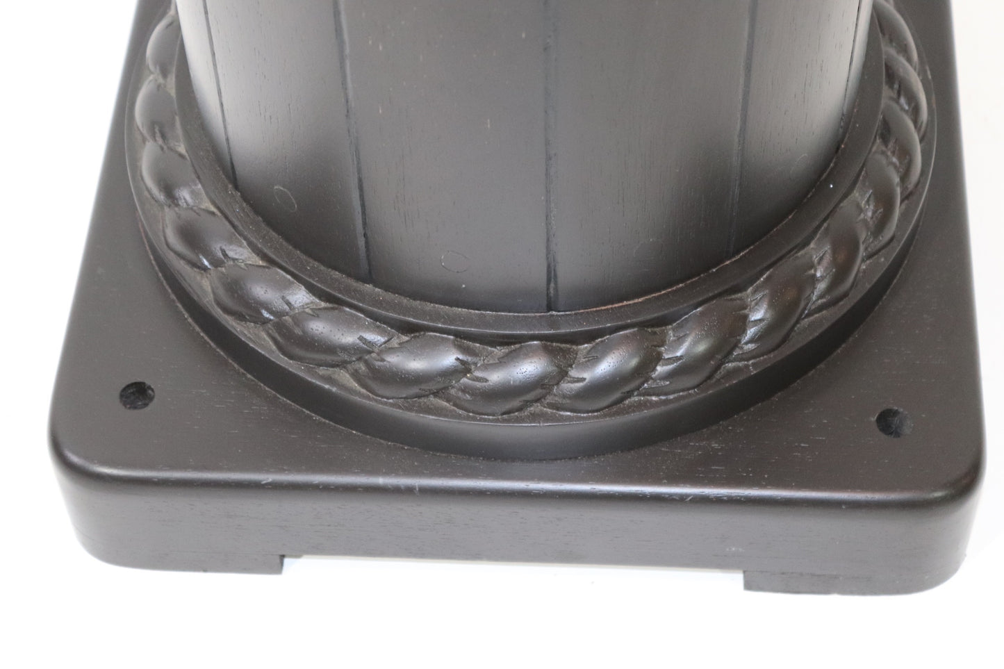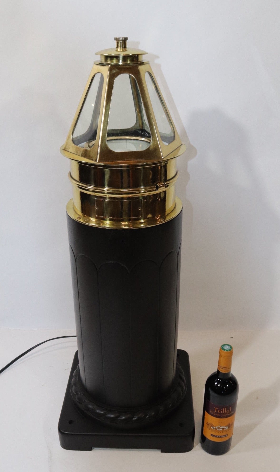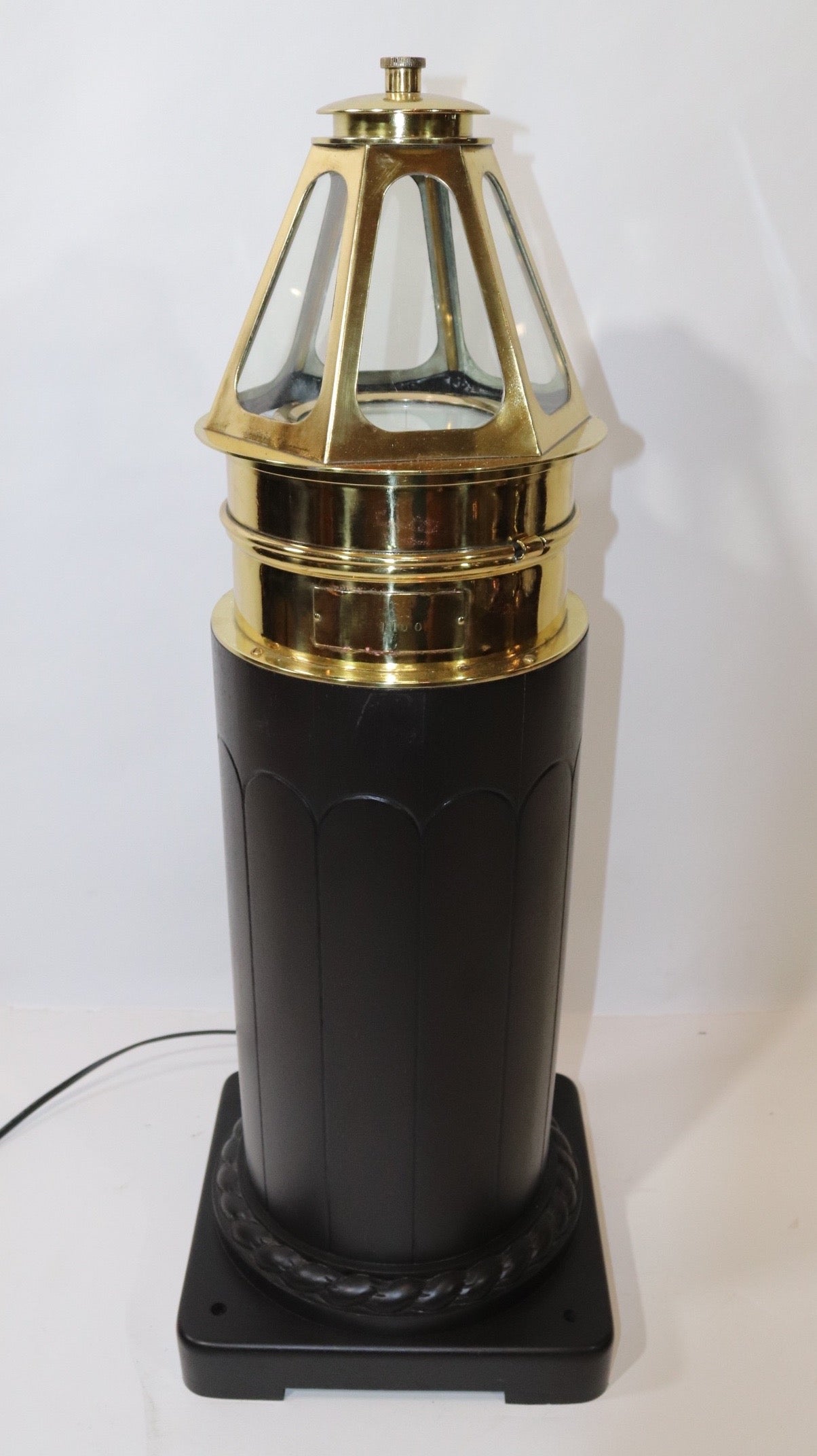 Beautiful solid brass yacht binnacle from John Bliss of New York with gimbaled compass mounted to a varnished wood base. The compass bezel is engraved John Bliss and Company New York. The compass card is marked Ritchie Boston mounted to a varnished wood pedestal with rope carved border at base. John Bliss nameplate is numbered 1100. Circa 1890. Weight is 31 pounds