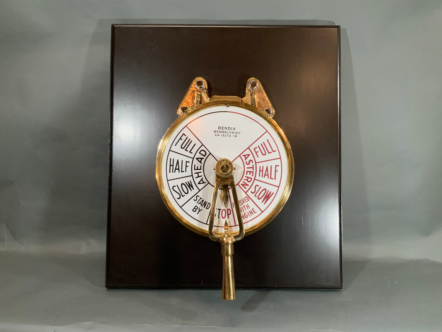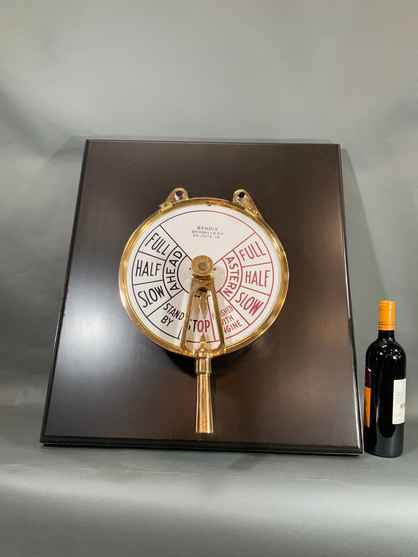 Solid brass highly polished and lacquered ship's engine room telegraph mounted onto a thick mahogany backboard. Unit rings loudly. Porcelain faceplate from Bendix of Brooklyn New York. Circa 1940.