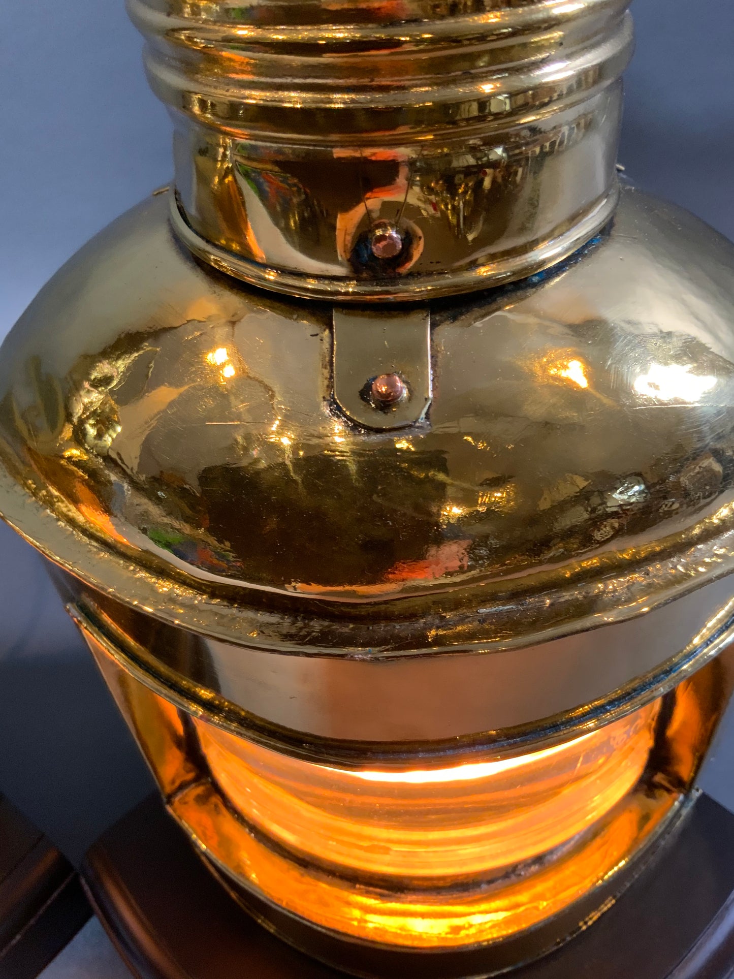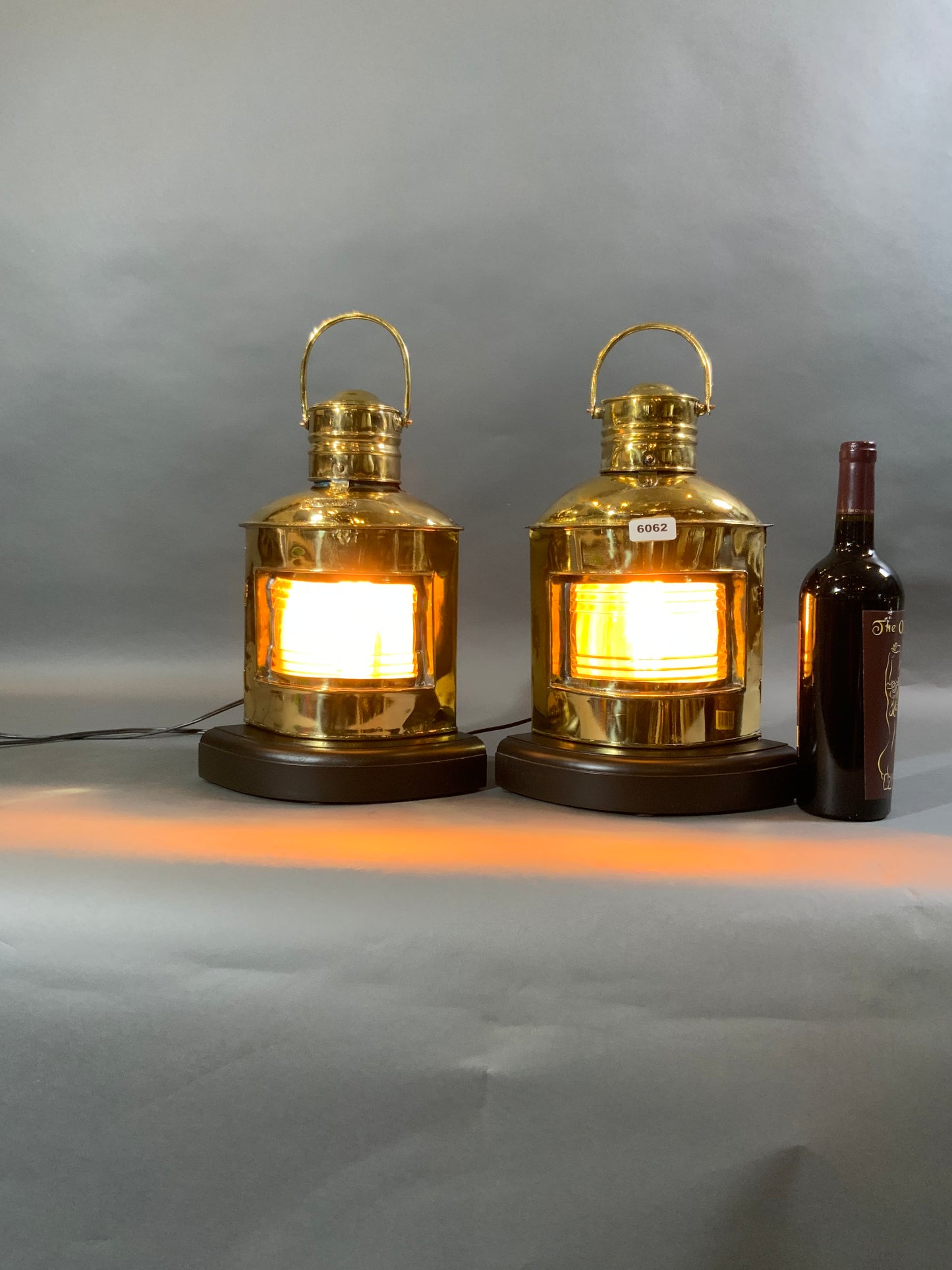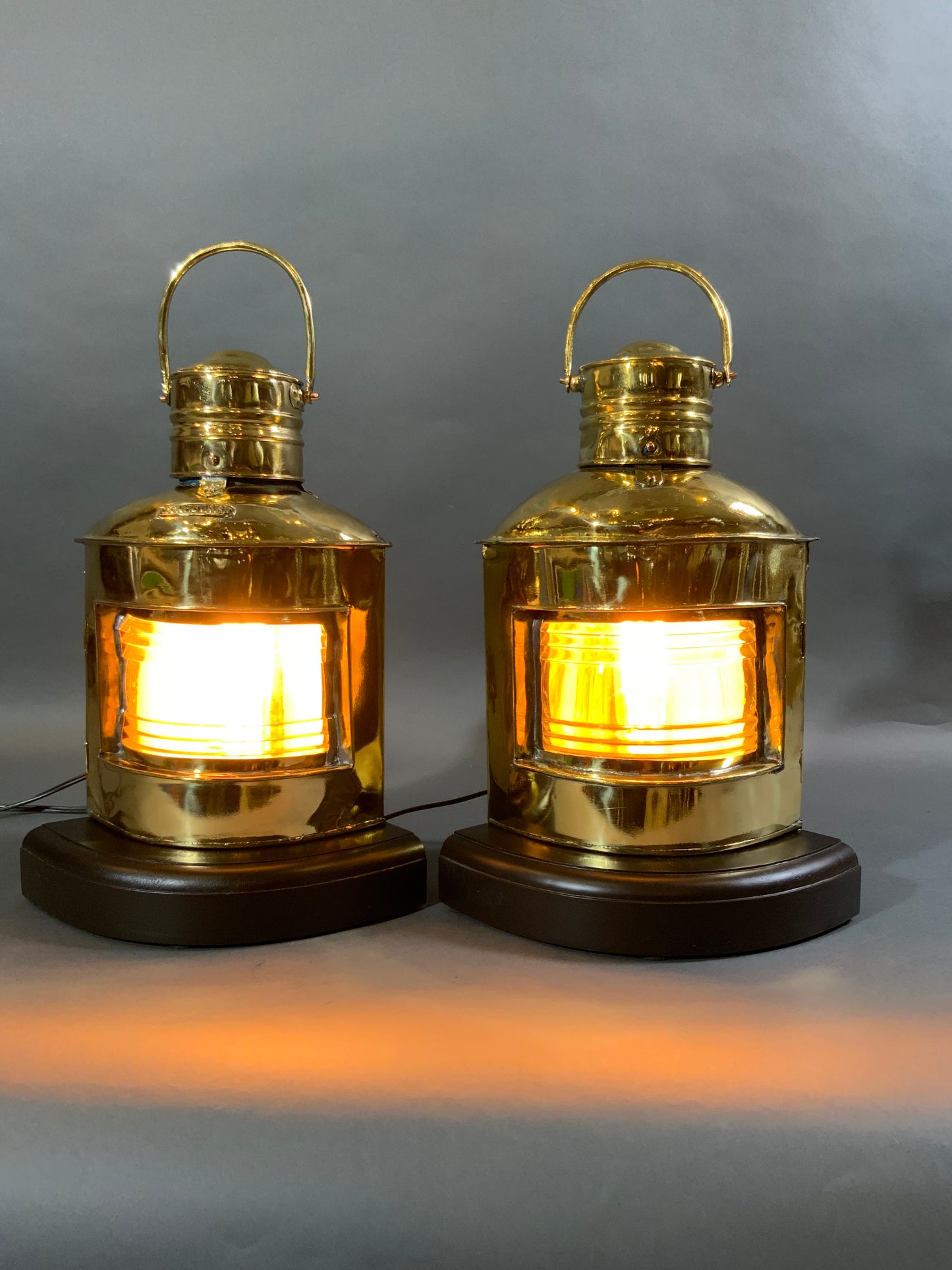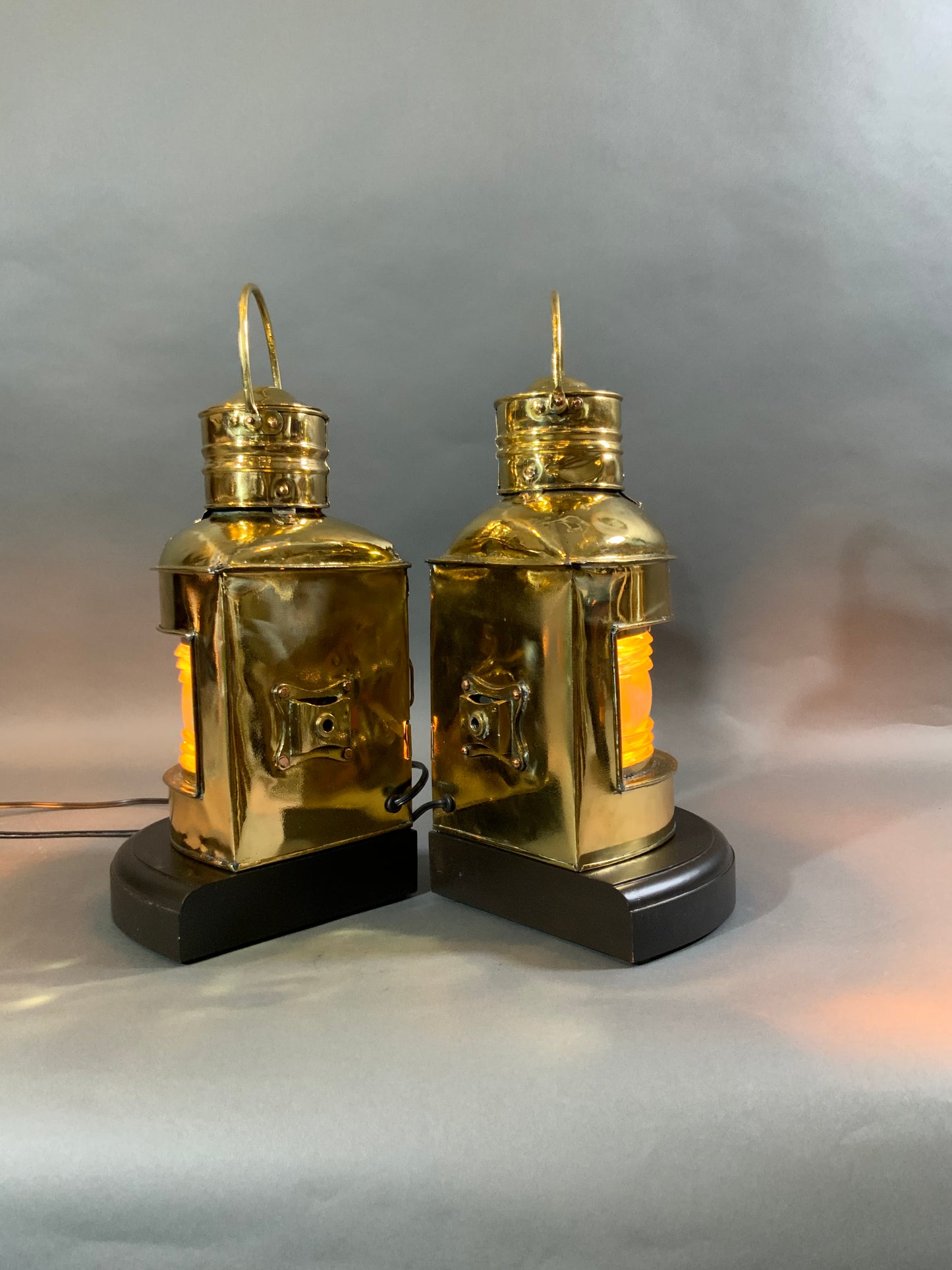 Highly polished and lacquered solid brass ships lantern with clear glass lenses. Lacking colored red and green filters. Mounted to thick mahogany bases. Wire with new sockets and cords.
