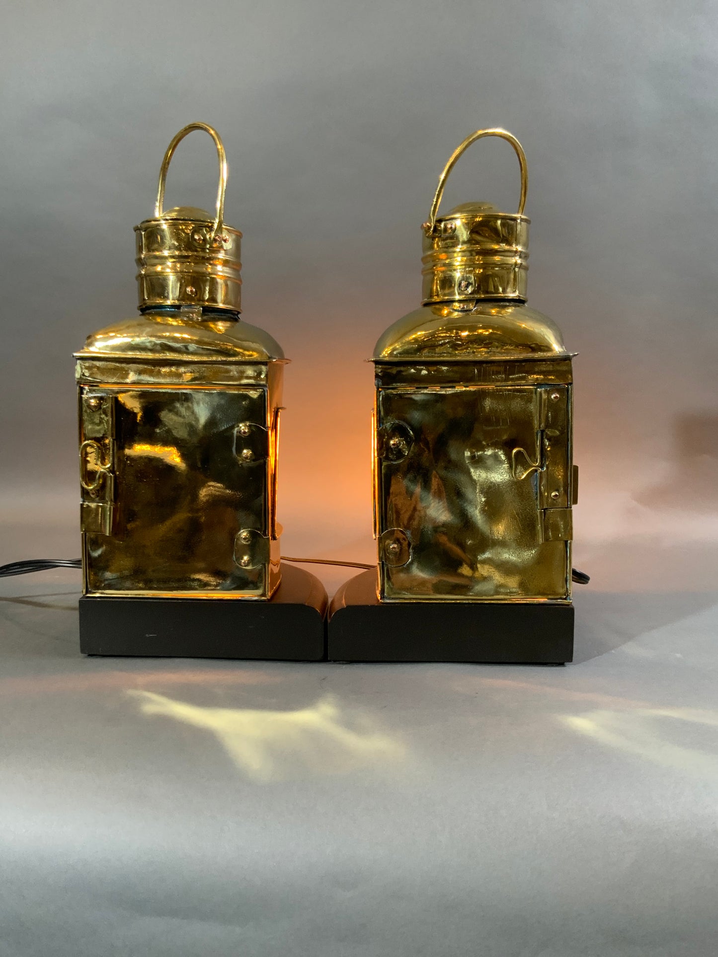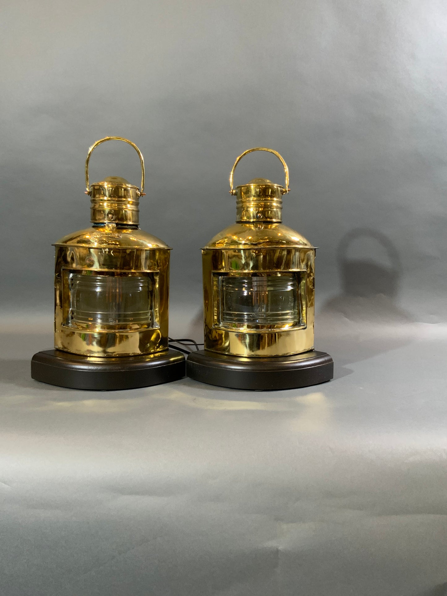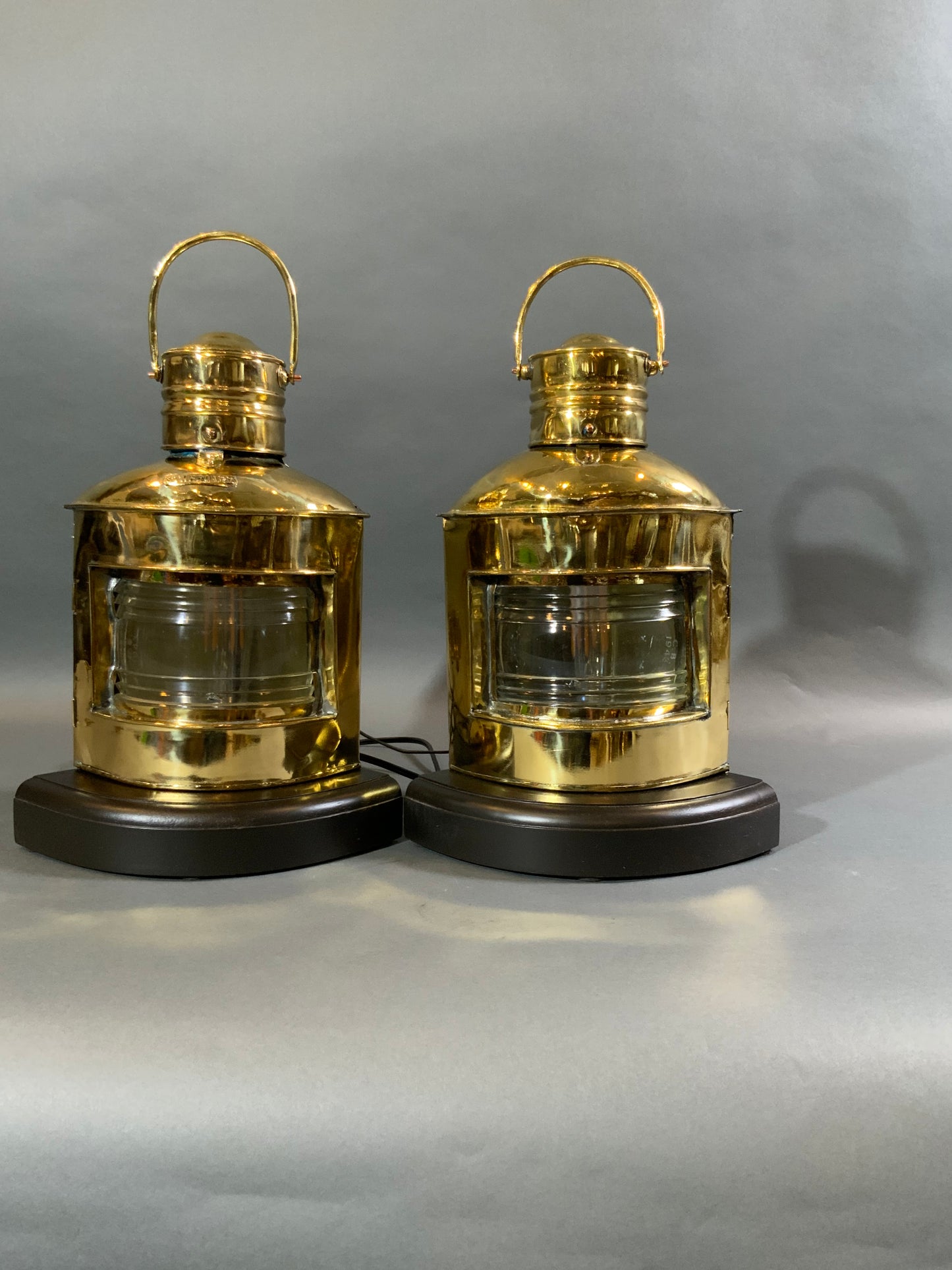 Highly polished and lacquered solid brass ships lantern with clear glass lenses. Lacking colored red and green filters. Mounted to thick mahogany bases. Wire with new sockets and cords.
